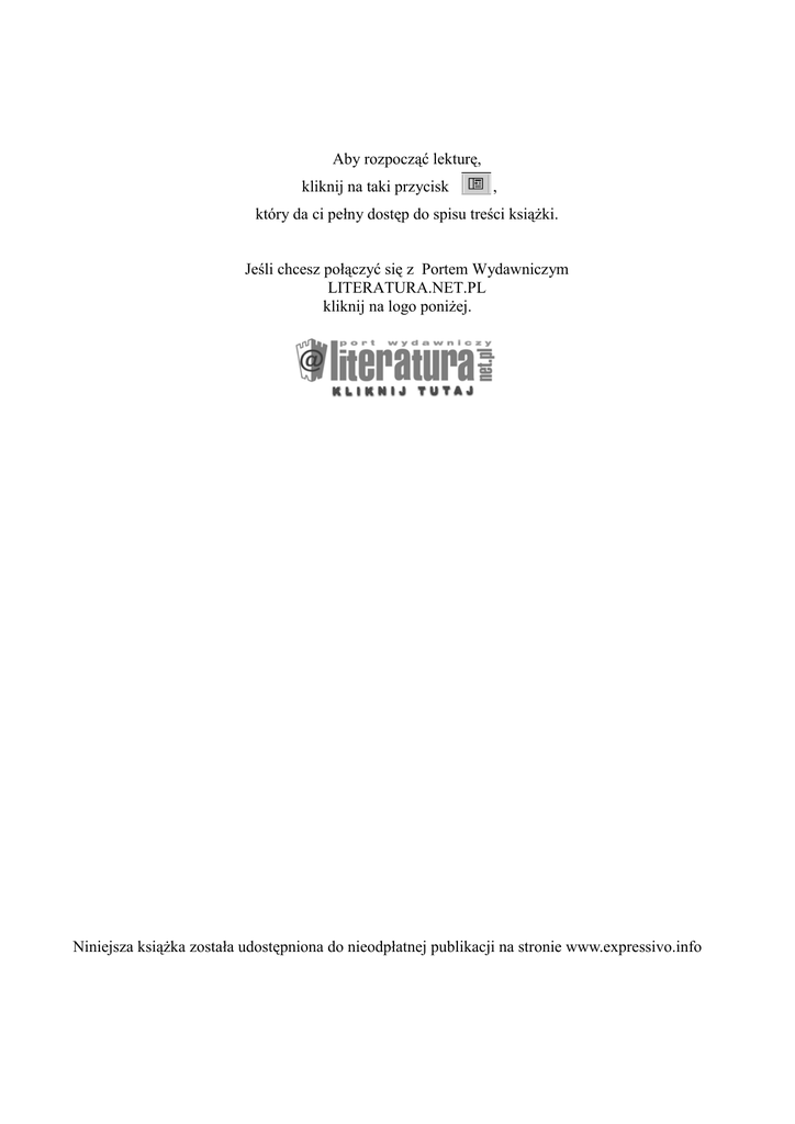 Aby rozpocząć lekturę, kliknij na taki przycisk , który da ci pełny dostęp do spisu treści książki. Jeśli chcesz połączyć się z Portem Wydawniczym LITERATURA.NET.PL kliknij na logo poniżej. Niniejsza książka została udostępniona do nieodpłatnej publikacji na stronie www.expressivo.info James Matthew Barrie PRZYGODY PIOTRUSIA PANA Opracowała ZOFIA ROGOSZÓWNA Tytuł oryginału angielskiego Peter Pan 2 Copyright by Literatura Net Pl, Gdańsk 2007 3 Rozdział I Wielka wyprawa do Parku Leśnego Byłoby wam trudno zrozumieć przygody Piotrusia Pana, gdybyście nie wiedzieli, jak wygląda Park Leśny. Park ten jest olbrzymi i leży w pobliżu bardzo wielkiego miasta, w którym mieszka król. Prawie codziennie chodzimy z Daniem do parku i Danio jest wprost oszołomiony mnóstwem wrażeń, jakich tam doznaje. Nigdy jeszcze żadne dziecko nie zwiedziło całego parku za jednym razem, bo malcy w wieku Dania muszą sypiać od dwunastej do pierwszej w południe i dlatego trzeba spieszyć z powrotem do domu. Gdyby jednak wasze mamy nie przestrzegały tak koniecznie tego spania od dwunastej do pierwszej w południe, to może moglibyście zwiedzić cały Park Leśny w jednym i tym samym dniu. Przed parkiem ciągnie się nieskończenie długi sznur dorożek, nad którymi wasze piastunki mają taką władzę, że skoro palec do góry podniosą, dorożka staje, a wtedy dzieci przechodzą swobodnie na drugą stronę ulicy i zatrzymują się przed wielką, żelazną bramą. Bram w parku jest kilka, ale zwykle wchodzi się tą pierwszą. U wejścia można zamienić parę słów z „panią od baloników”. Pani ta z takim natężeniem całą swą przysadzistą postacią przyciska stołek do bruku chodnika, a plecy do żelaznego ogrodzenia parku, że twarz jej jest czerwona jak burak. Ostrożność ta jest bardzo wskazana, bo gdyby choć na chwilkę puściła się sztachet i stołka, baloniki, które trzyma w ręku, uniosłyby ją w powietrze. I tak się nawet stało któregoś dnia, bo gdyśmy o zwykłej godzinie przyszli do parku, zastaliśmy pod bramą „nową panią od baloników”. Widocznie ta dawniejsza, gruba, oderwała się od sztachet i baloniki uniosły ją w górę. Danio bardzo żałował, że nie był przy tym, bo skoro już w ogóle miało się stać takie nieszczęście, byłby przynajmniej chciał je widzieć na własne oczy. Leśny Park jest prześlicznym ogrodem, w którym rosną miliony i setki najpiękniejszych drzew. Zaraz za bramą zaczyna się Gaj Figowy, ale każdy umyka stąd czym prędzej, bo tutaj bawią się tylko dzieci, które z nikim „zadawać się” nie chcą, bo są zanadto dobrze wychowane. Danio i inni bohaterowie w jego wieku nazywają je pogardliwie „małpkami”. Dzieci te chodzą postrojone jak laleczki z wystawy sklepowej, mówią po cichutku i używają wyszukanych wyrazów jak ludzie dorośli. Nudzą się przy tym ciągle, bo w nic się bawić nie umieją. Zdarza się jednak, że i najlepiej wytresowana małpa zbuntuje się w zwierzyńcu, przesadzi strzegące ją mury i ucieknie w świat daleki. Takim buntowniczym duchem była Marynka Grey, o której dowiecie się więcej, kiedy dojdziemy do bramy ochrzczonej jej imieniem. Ta mała Marynka jest jedyną „małpką”, której wspomnienie przechowało się w Leśnym Parku. Teraz przechodzimy na Dużą Drogę. Różnica między nią a innymi drogami jest prawie taka jak między wami a waszym ojcem. Danio nie może się nadziwić, że droga ta jest z początku wąska, a potem rozszerza się i rozszerza, dopóki się nie stanie zupełnie szeroką drogą. Danio twierdzi, że droga ta jest ojcem wszystkich ścieżek i ścieżynek parku, i wyrysował nawet obrazek, który mu się ogromnie podoba. Na tym obrazku Duża Droga wiezie w dziecinnym wózku Małą Dróżkę na spacer. I na tej drodze spotkać można tylko bardzo porządne towarzystwo. Dzieci bawią się tu zawsze pod okiem dorosłych, którzy pilnują, żeby nie zamoczyły nóżek w wilgotnej trawie, i stawiają je do kąta za to, że są „uparciuchami” albo „mazgajami”. Wyraz „mazgaj” oznacza kogoś, kto płacze o byle co, na przykład o to, że go niania nie chce wziąć na ręce albo że mu palec z buzi wyjęto. Z dwojga złego lepiej już być 4 „uparciuchem”, bo tyle najmilszych rzeczy jest zabronionych na świecie, że warto od czasu do czasu popróbować, czyby się jednak nie dało postawić na swoim. Gdybyśmy się zatrzymywali przy każdym placu, przez który przechodzi Duża Droga, stracilibyśmy tyle czasu, że musielibyśmy wracać do domu nie obejrzawszy ani jednej części wszystkich rzeczy godnych widzenia w Parku Leśnym. Zwrócę wam więc tutaj tylko uwagę na drzewo Mundzia Helwetta, pod którym ów Mundzio, bawiąc się pewnego razu, zgubił jednego pensa, a po chwili szukania odnalazł dwa! Od tego pamiętnego zdarzenia cała ziemia dokoła drzewa jest rozgrzebana i zryta rydelkami młodocianych „poszukiwaczy złota”. Nieco dalej wznosi się drewniana budka, w której zabarykadował się mały książę Henryś. Mały książę mazgaił się przez całe trzy dni bez żadnego powodu i za karę przyprowadzono go do Parku Leśnego w sukience jego siostrzyczki. Henryś nie mógł znieść takiej hańby. Na Dużej Drodze wydarł się z rąk bony, zamknął się w drewnianej budce i nie dał się z niej wyprowadzić, póki mu nie oddano jego bufiastych majteczek z dwiema kieszeniami. Nie będę was namawiał, żebyście się zbliżyli do Okrągłego Stawu, bo zanim doń dojdziecie, nianie wasze, które są okropnie tchórzliwe, odciągną was na pewno w inną stronę i pokażą wam ścieżkę wiodącą do Dziecinnego Pałacu. W pałacu tym mieszkała samiuteńka jedna, w otoczeniu bardzo wielu lalek, najsławniejsza dziewczynka z całego parku. Jeśli kto pociągnął za sznurek dzwonka, wstawała zaraz z łóżka. O szóstej zapalała światło i odmykała drzwi w koszulce nocnej, a wszyscy wołali w