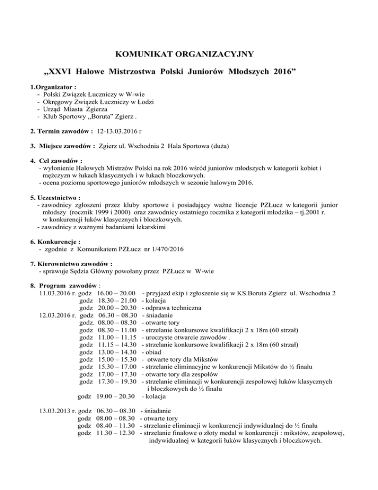 KOMUNIKAT ORGANIZACYJNY ,,XXVI Halowe Mistrzostwa Polski Juniorów Młodszych 2016” 1.Organizator : - Polski Związek Łuczniczy w W-wie - Okręgowy Związek Łuczniczy w Łodzi - Urząd Miasta Zgierza - Klub Sportowy ,,Boruta” Zgierz . 2. Termin zawodów : 12-13.03.2016 r 3. Miejsce zawodów : Zgierz ul. Wschodnia 2 Hala Sportowa (duża) 4. Cel zawodów : - wyłonienie Halowych Mistrzów Polski na rok 2016 wśród juniorów młodszych w kategorii kobiet i mężczyzn w łukach klasycznych i w łukach bloczkowych. - ocena poziomu sportowego juniorów młodszych w sezonie halowym 2016. 5. Uczestnictwo : - zawodnicy zgłoszeni przez kluby sportowe i posiadający ważne licencje PZŁucz w kategorii junior młodszy (rocznik 1999 i 2000) oraz zawodnicy ostatniego rocznika z kategorii młodzika – tj.2001 r. w konkurencji łuków klasycznych i bloczkowych. - zawodnicy z ważnymi badaniami lekarskimi 6. Konkurencje : - zgodnie z Komunikatem PZŁucz nr 1/470/2016 7. Kierownictwo zawodów : - sprawuje Sędzia Główny powołany przez PZŁucz w W-wie 8. Program zawodów : 11.03.2016 r. godz 16.00 – 20.00 godz 18.30 – 21.00 godz 20.00 – 20.30 12.03.2016 r. godz 06.30 – 08.30 godz. 08.00 – 08.30 godz 08.30 – 11.00 godz 11.00 – 11.15 godz 11.15 – 14.30 godz 13.00 – 14.30 godz 15.00 – 15.30 godz 15.30 – 17.00 godz 17.00 – 17.30 godz 17.30 – 19.30 - przyjazd ekip i zgłoszenie się w KS.Boruta Zgierz ul. Wschodnia 2 - kolacja - odprawa techniczna - śniadanie - otwarte tory - strzelanie konkursowe kwalifikacji 2 x 18m (60 strzał) - uroczyste otwarcie zawodów . - strzelanie konkursowe kwalifikacji 2 x 18m (60 strzał) - obiad - otwarte tory dla Mikstów - strzelanie eliminacyjne w konkurencji Mikstów do ½ finału - otwarte tory dla zespołów - strzelanie eliminacji w konkurencji zespołowej łuków klasycznych i bloczkowych do ½ finału godz 19.00 – 20.30 - kolacja 13.03.2013 r. godz godz godz godz 06.30 – 08.30 08.00 – 08.30 08.40 – 11.30 11.30 – 12.30 - śniadanie - otwarte tory - strzelanie eliminacji w konkurencji indywidualnej do ½ finału - strzelanie finałowe o złoty medal w konkurencji : mikstów, zespołowej, indywidualnej w kategorii łuków klasycznych i bloczkowych. godz 13.00 – 14.30 - obiad godz 14.30 - ceremonia dekoracji zwycięzców i zakończenie Mistrzostw Polski . Organizator zastrzega sobie możliwość zmiany programu w trakcie trwania zawodów 9. Zgłoszenia : - Zgłoszenia do zawodów i zamówienia na noclegi oraz wyżywienie prosimy przesłać w terminie do dnia 01.03.2016 r. – poprzez aplikację AZZ na stronie www.archery.pl tel. kontaktowy 607 830 730 10.Klasyfikacja : - oddzielnie dla kobiet i mężczyzn, oddzielnie dla łuków klasycznych i bloczkowych w konkurencji indywidualnej , zespołowej , mikstów. 11.Tytuły i wyróżnienia : - zgodnie z Komunikatem PZŁucz nr 1/470/2016 12. Sprawy finansowe : - opłata startowa wynosi 50,- zł od 1-go zawodnika z licencją a zawodnicy nie stowarzyszeni 100,- zł od 1-go zawodnika płatne gotówką u organizatora w dniu 11.03.2016 w biurze zawodów –KS ,,BORUTA” Zgierz ul Wschodnia 2. - koszt zakwaterowania 1 osobodnia /nocleg + wyżywienie/ wynosi od 75.00 zł do 95.00 zł w zależności od miejsca zakwaterowania ( pokoje 1,2,3 osobowe) płatne u organizatora. Po terminie tj. 01.03.2016 organizator może zapewnić zakwaterowanie i wyżywienie w zależności od możliwości organizatora. Za zamówione a niewykorzystane miejsca noclegowe płaci zamawiający ! 13. W czasie zawodów obowiązuje Regulamin Halowych Mistrzostw Polski PZŁucz : - prawo interpretacji regulaminu na zawodach przysługuje pełnomocnikowi Zarządowi PZŁucz a w sprawach organizacyjno-porządkowych bezpośredniemu organizatorowi - protesty – zgodnie z Regulaminem PZŁucz. 14. Postanowienia końcowe : - organizator nie ponosi odpowiedzialności za ubezpieczenie zawodników w czasie trwania imprezy i za rzeczy pozostawione na obiekcie sportowym . - w czasie zawodów obowiązuje ubiór sportowy- klubowy lub biały zgodnie z regulaminem łucznictwa . - wejście zawodników i opiekunów na halę sportową tylko w obuwiu sportowym . - na obiekcie sportowym zabrania się spożywania alkoholu i palenia tytoniu . - obowiązuje regulamin Łucznictwa PZŁucz . - nie ma możliwości strzelania poza konkursem. - w uroczystej ceremonii wręczenia medali i wyróżnień zawodnicy uczestniczą tylko w ubiorach sportowych. . ORGANIZATOR