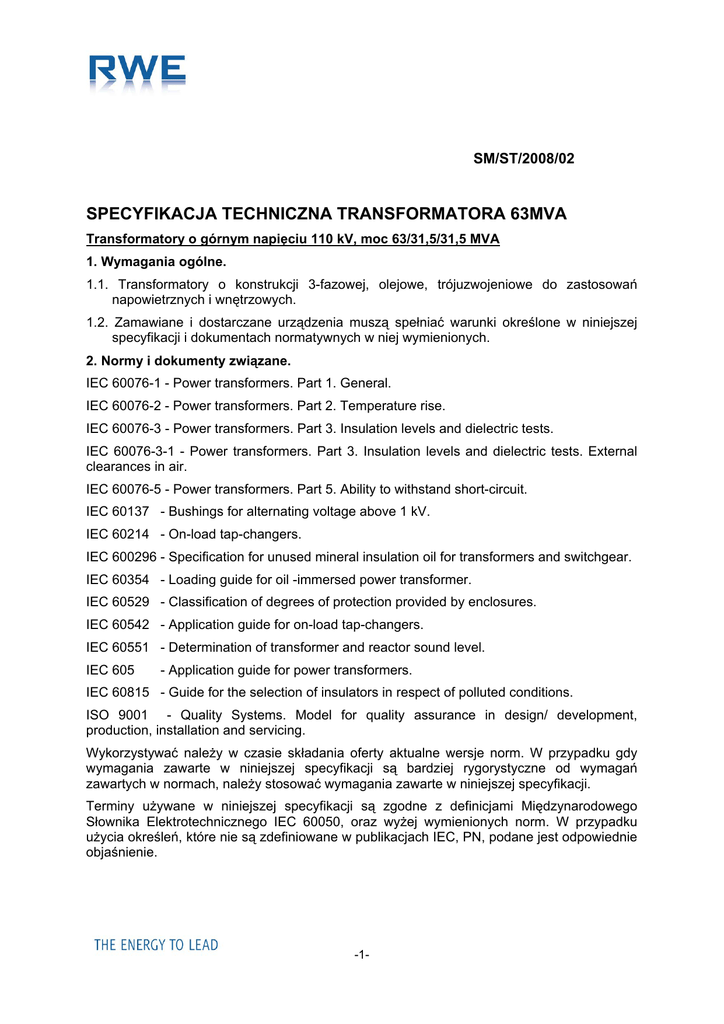 SM/ST/2008/02 SPECYFIKACJA TECHNICZNA TRANSFORMATORA 63MVA Transformatory o górnym napięciu 110 kV, moc 63/31,5/31,5 MVA 1. Wymagania ogólne. 1.1. Transformatory o konstrukcji 3-fazowej, olejowe, trójuzwojeniowe do zastosowań napowietrznych i wnętrzowych. 1.2. Zamawiane i dostarczane urządzenia muszą spełniać warunki określone w niniejszej specyfikacji i dokumentach normatywnych w niej wymienionych. 2. Normy i dokumenty związane. IEC 60076-1 - Power transformers. Part 1. General. IEC 60076-2 - Power transformers. Part 2. Temperature rise. IEC 60076-3 - Power transformers. Part 3. Insulation levels and dielectric tests. IEC 60076-3-1 - Power transformers. Part 3. Insulation levels and dielectric tests. External clearances in air. IEC 60076-5 - Power transformers. Part 5. Ability to withstand short-circuit. IEC 60137 - Bushings for alternating voltage above 1 kV. IEC 60214 - On-load tap-changers. IEC 600296 - Specification for unused mineral insulation oil for transformers and switchgear. IEC 60354 - Loading guide for oil -immersed power transformer. IEC 60529 - Classification of degrees of protection provided by enclosures. IEC 60542 - Application guide for on-load tap-changers. IEC 60551 - Determination of transformer and reactor sound level. IEC 605 - Application guide for power transformers. IEC 60815 - Guide for the selection of insulators in respect of polluted conditions. ISO 9001 - Quality Systems. Model for quality assurance in design/ development, production, installation and servicing. Wykorzystywać należy w czasie składania oferty aktualne wersje norm. W przypadku gdy wymagania zawarte w niniejszej specyfikacji są bardziej rygorystyczne od wymagań zawartych w normach, należy stosować wymagania zawarte w niniejszej specyfikacji. Terminy używane w niniejszej specyfikacji są zgodne z definicjami Międzynarodowego Słownika Elektrotechnicznego IEC 60050, oraz wyżej wymienionych norm. W przypadku użycia określeń, które nie są zdefiniowane w publikacjach IEC, PN, podane jest odpowiednie objaśnienie. -1- 3. Parametry znamionowe i dane gwarantowane. 3.1. Warunki klimatyczne: Zakres temperatur otoczenia: ..........................................................................+40°C/ -30°C, Wysokość pracy n.p.m.:........................................................................................ ≤ 1000 m., Poziom zanieczyszczenia powietrza wg IEC 60815:.......................................................... III 3.2. Parametry systemu energetycznego. Częstotliwość znamionowa....................................................................................... f = 50 Hz Liczba faz............................................................................................................................... 3 Napięcie znamionowe sieci 110 kV: najwyższe napięcie robocze sieci .................................................................................123 kV najniższe/ najwyższe napięcie regulowane w sieci................................................103/121 kV najniższe/ najwyższe napięcie w stanie zakłócenia.................................................98/123 kV punkt neutralny sieci ..............................................................................skutecznie uziemiony maksymalna moc zwarciowa trójfazowa .....................................................Szw3 = 4000 MVA. Napięcie znamionowe sieci 15 kV: najwyższe napięcie robocze ........................................................................................17,5 kV najniższe/ najwyższe napięcie regulowane w sieci..............................................15,2/16,1 kV punkt neutralny sieci ........................................................................ uziemiony przez rezystor maksymalna moc zwarciowa trójfazowa ........................................................Szw3 = 500 MVA maksymalny prąd zwarcia doziemnego ............................................................... Izw1 = 400 A 3.3. Parametry znamionowe transformatorów. Częstotliwość: .............................................................................................................. f= 50 Hz Liczba faz: ................................................................................................................................ 3 Napięcia znamionowe: uzwojenie GN........................................115 kV ± 10% w ± 8 stopniach uzwojenie DN DN I/DN II ..........................................15,75/15,75 kV Moc znamionowa: ......................................................................................... 63/31,5/31,5 MVA Prąd stanu jałowego:....................................................................................................≤0,5% In Układ połączeń:........................................................................................................ YNd11d 11 Układ chłodzenia: ............................................................................................................ OF-AF Nabywca oczekuje, że proponowane straty nie będą wyższe niż podane niżej wartości: straty jałowe: .................................................................................................................≤ 25 kW straty obciążeniowe:.....................................................................................................≤270 kW Napięcie zwarcia w odniesieniu do mocy:.................................................................. 31,5 MVA -2- GN-DN I: ~14 % GN-DN II: ~14 % i dobrać takie , aby prąd zwarcia strony SN był ograniczony do 10 kA. Maksymalne przyrosty temperatur: uzwojeń ............................................................. 65°C oleju w górnej warstwie ..................................... 60°C Regulacja napięcia: przełącznik 17 pozycyjny regulacja w zakresie +10% -10% co 1,25% napęd dostosowany do telemechaniki wskaźnik położenia Poziom hałasu (moc akustyczna mi