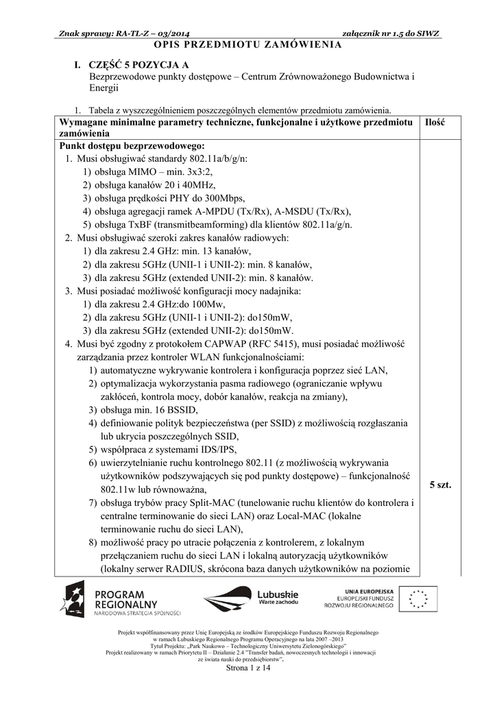 Znak sprawy: RA-TL-Z – 03/2014 załącznik nr 1.5 do SIWZ OPIS PRZEDMIOTU ZAMÓWIENIA I. CZĘŚĆ 5 POZYCJA A Bezprzewodowe punkty dostępowe – Centrum Zrównoważonego Budownictwa i Energii 1. Tabela z wyszczególnieniem poszczególnych elementów przedmiotu zamówienia. Wymagane minimalne parametry techniczne, funkcjonalne i użytkowe przedmiotu zamówienia Punkt dostępu bezprzewodowego: 1. Musi obsługiwać standardy 802.11a/b/g/n: 1) obsługa MIMO – min. 3x3:2, 2) obsługa kanałów 20 i 40MHz, 3) obsługa prędkości PHY do 300Mbps, 4) obsługa agregacji ramek A-MPDU (Tx/Rx), A-MSDU (Tx/Rx), 5) obsługa TxBF (transmitbeamforming) dla klientów 802.11a/g/n. 2. Musi obsługiwać szeroki zakres kanałów radiowych: 1) dla zakresu 2.4 GHz: min. 13 kanałów, 2) dla zakresu 5GHz (UNII-1 i UNII-2): min. 8 kanałów, 3) dla zakresu 5GHz (extended UNII-2): min. 8 kanałów. 3. Musi posiadać możliwość konfiguracji mocy nadajnika: 1) dla zakresu 2.4 GHz:do 100Mw, 2) dla zakresu 5GHz (UNII-1 i UNII-2): do150mW, 3) dla zakresu 5GHz (extended UNII-2): do150mW. 4. Musi być zgodny z protokołem CAPWAP (RFC 5415), musi posiadać możliwość zarządzania przez kontroler WLAN funkcjonalnościami: 1) automatyczne wykrywanie kontrolera i konfiguracja poprzez sieć LAN, 2) optymalizacja wykorzystania pasma radiowego (ograniczanie wpływu zakłóceń, kontrola mocy, dobór kanałów, reakcja na zmiany), 3) obsługa min. 16 BSSID, 4) definiowanie polityk bezpieczeństwa (per SSID) z możliwością rozgłaszania lub ukrycia poszczególnych SSID, 5) współpraca z systemami IDS/IPS, 6) uwierzytelnianie ruchu kontrolnego 802.11 (z możliwością wykrywania użytkowników podszywających się pod punkty dostępowe) – funkcjonalność 802.11w lub równoważna, 7) obsługa trybów pracy Split-MAC (tunelowanie ruchu klientów do kontrolera i centralne terminowanie do sieci LAN) oraz Local-MAC (lokalne terminowanie ruchu do sieci LAN), 8) możliwość pracy po utracie połączenia z kontrolerem, z lokalnym przełączaniem ruchu do sieci LAN i lokalną autoryzacją użytkowników (lokalny serwer RADIUS, skrócona baza danych użytkowników na poziomie Projekt współfinansowany przez Unię Europejską ze środków Europejskiego Funduszu Rozwoju Regionalnego w ramach Lubuskiego Regionalnego Programu Operacyjnego na lata 2007 –2013 Tytuł Projektu: „Park Naukowo – Technologiczny Uniwersytetu Zielonogórskiego” Projekt realizowany w ramach Priorytetu II – Działanie 2.4 ”Transfer badań, nowoczesnych technologii i innowacji ze świata nauki do przedsiębiorstw”. Strona 1 z 14 Ilość 5 szt. Znak sprawy: RA-TL-Z – 03/2014 załącznik nr 1.5 do SIWZ OPIS PRZEDMIOTU ZAMÓWIENIA 5. 6. 7. 8. 9. AP) – przełączenie nie może powodować zerwania sesji użytkowników, 9) jednoczesna obsługa transferu danych użytkowników końcowych oraz monitorowania pasma radiowego (wykrywanie obcych punktów dostępowych i klientów WLAN, wireless IPS), 10) obsługa Dynamic Frequency Selection (DFS) i Transmit Power Control (TPC) zgodnie z 802.11h, 11) obsługa szybkiego roamingu użytkowników pomiędzy punktami dostępowymi – funkcjonalność 802.11r lub równoważna, 12) obsługa mechanizmów QoS: a) shaping/ograniczanie ruchu do użytkownika, z możliwością konfiguracji per użytkownik, b) obsługaWMM, TSPEC, U-APSD. 13) współpraca z urządzeniami o oprogramowaniem realizującym usługi lokalizacyjne, 14) wbudowany suplikant 802.1x – możliwość uwierzytelnienia AP do infrastruktury sieciowej. Musi posiadać możliwość pracy w trybie kratowym (część AP dołączona do sieci kablowej, pozostałe formujące sieć w oparciu o medium radiowe): 1) komunikacja między punktami dostępowymi bez medium kablowego, 2) autoryzacja punktów dostępowych w oparciu o certyfikaty X.509, adresy MAC, 3) separacja trybu pracy poszczególnych zakresów radiowych (jeden dedykowany do obsługi klientów, drugi do komunikacji między punktami dostępowymi) z możliwością konfiguracji wyjątków (asocjacji użytkowników w zakresie przeznaczonym do komunikacji między AP oraz komunikacji między AP w zakresie przeznaczonym do obsługi użytkowników, 4) automatyczne formowanie sieci kratowej między punktami dostępowymi (optymalizacja tras z uwzględnieniem parametrów jakościowych połączenia, minimalizacja interferencji z możliwością awaryjnego przełączenia na inne pasmo), 5) automatyczne włączanie nowych punktów do sieci (bez konieczności konfiguracji punktów dostępowych w miejscu instalacji), 6) automatyczna ochrona kryptograficzna (AES) ruchu pomiędzy AP. Musi posiadać Interfejs Gigabit Ethernet (10/100/1000). Musi posiadać zróżnicowane możliwości zasilania: 1) zasilacz sieciowy 230V AC, 2) zasilanie PoE(802.3af) w sposób zapewniający ich pełną wydajność. Musi posiadać anteny zintegrowane. Musi posiadać obudowę przystosowaną do warunków pracy w pomieszczeniach Projekt współfinansowany przez Unię Europejską ze środków Europejskiego Funduszu Rozwoju Regionalnego w ramach Lubuskiego Regionalnego Programu Operacyjnego na lata 2007 –2013 Tytuł Projektu: „Park Naukowo – Technologiczny Uniwersytetu Zielonogórskiego” Projekt realizowany w ramach Priorytetu II – Działanie 2.4 ”Transfer badań, nowoczesnych technologii i innowacji ze świata nauki do przedsiębiorstw”. Strona 2 z 14 Znak sprawy: RA-TL-Z – 03/2014 załącznik nr 1.5 do SIWZ OPIS PRZEDMIOTU ZAMÓWIENIA biurowych (5 – 35oC), o niskim profilu (nie więcej niż 6 cm). 10. Musi posiadać diodową sygnalizację stanu urządzenia z możliwością dezaktywacji. 11. Musi posiadać Certyfikat WiFiAlliance. 12. Musi być zgodny z dyrektywami 1999/5/EC i 93/42/ECC. II. CZĘŚĆ 5 POZYCJA B Przełącznik sieciowy – Centrum Zrównoważonego Budownictwa i Energii 1. Tabela z wyszczególnieniem poszczególnych elementów przedmiotu zamówienia. Wymagane minimalne parametry techniczne, funkcjonalne i uż