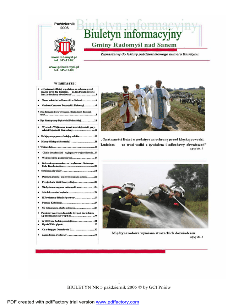 1 BIULETYN NR 5 październik 2005 © by GCI Pniów PDF created with pdfFactory trial version www.pdffactory.com „OPATRZNOŚCI BOŻEJ – W PODZIĘCE ZA OCHRONĘ PRZED KLĘSKĄ POWODZI, LUDZIOM – ZA TRUD WALKI Z ŻYWIOŁEM I ODBUDOWY OBWAŁOWAŃ” „Czcigodny Księże Proboszczu Parafii Pniowskiej, Czcigodni Księża Proboszczowie, szanowni Państwo, którzyście zechcieli i mogli przybyć na dzisiejszą uroczystą Mszę Świętą – koncelebrowaną na koronie obwałowania Wisły, nieopodal ujścia Sanu do tej rzeki. Podczas Mszy Świętej chcemy okazać wdzięczność, dziękując Bogu za uratowanie przed klęską powodzi w latach minionych, a zwłaszcza w roku 1997 i roku 2001 i tym samym prosić o dalszą ochronę przed żywiołami. Pragniemy ponadto podziękować wszystkim, którzy narażając życie podejmowali z Bożą pomocą trud walki w obliczu największych zagrożeń powodziowych, albo też w jakikolwiek inny sposób wnieśli swój udział w uratowanie naszej wspólnoty od klęski powodzi. Wspominamy także tych ludzi skromnych i pracowitych, a których nie sposób wszystkich wymienić, którzy w swoim utrudzeniu nie oczekiwali nagród albo wyróżnienia za swoją szlachetną postawę – Oni też pozostaną w naszej zbiorowej pamięci.” – tymi słowami Wójt Gminy Radomyśl nad Sanem Pan Jan Pyrkosz rozpoczął uroczystość, zorganizowaną z okazji ukończenia trwających pięć lat prac przy budowie i remoncie obwałowań Wisły. Dobiegł końca pewien etap odbudowy obwałowań Wisły i ujścia Sanu, owo przedsięwzięcie nie mogłoby przynieść efektów o tak kapitalnym znaczeniu dla naszej gminnej wspólnoty, gdyby nie było wprzód idei i współpracy człowieka z Bogiem w jej urzeczywistnianiu. Dlatego postanowiono upamiętnić ludzi, którzy poprzez swoją zapobiegliwość podjęli starania, pomagali i wykonywali wspomniane przedsięwzięcie. fot. Licznie zgromadzeni na Mszy Świętej mieszkańcy z pobliskich miejscowości. Msza Święta była koncelebrowana przez pięciu Księży, którzy przybyli na tą uroczystość z pięciu parafii położonych na terenie naszej gminy: z Pniowa Ks. Proboszcz Jerzy Pelc, z Chwałowic – Ks. Wikariusz Krzysztof Irek, z Radomyśla – Ks. Proboszcz Józef Turoń, z Woli Rzeczyckiej – Ks. Proboszcz Marcin Hejman oraz z Rzeczycy Długiej – Ks. Proboszcz Tadeusz Mentel. Podczas Mszy każdy z Księży w swojej wypowiedzi nawiązał do pamiętnej nocy w 2001 roku, kiedy to mimo pęknięcia wału, a zapewne dzięki opiece Bożej i wysiłkowi Mieszkańców nie zostały zalane pobliskie miejscowości. Następnie Księża poświęcili obwałowania oraz pamiątkowy obelisk, na tablicy, którego umieszczono napis: OPATRZNOŚCI BOŻEJ – W PODZIĘCE ZA OCHRONĘ PRZED KLĘSKĄ POWODZI LUDZIOM – ZA TRUD WALKI Z ŻYWIOŁEM I ODBUDOWY OBWAŁOWAŃ OBELISK TEN POŚWIECAJĄ DNIA 8 WRZEŚNIA 2005 ROKU fot. Wójt Gminy Radomyśl nad Sanem Pan Jan Pyrkosz . MIESZKAŃCY GMINY RADOMYŚL NAD SANEM 2 BIULETYN NR 5 październik 2005 © by GCI Pniów PDF created with pdfFactory trial version www.pdffactory.com fot. Poświęcenia pamiątkowego beliska dokonali księża z wszystkich parafii znajdujących się w Gminne Radomyśl nad Sanem. W cokół pod kamieniem wmurowano Akt Erekcyjny, pod którym swoje podpisy złożyli wszyscy Ci, którzy chcieli w ten sposób upamiętnić swój wkład w walkę z żywiołem bądź odbudową obwałowań. Możliwość złożenia takowego podpisu mieli wszyscy Mieszkańcy gminy, bowiem przez kilka wcześniejszych dni był on wystawiony w holu Urzędu Gminy. fot. Chwila tuż przed wmurowaniem Aktu Erekcyjnego. Nieopodal dwóch rzek, przy których od wieków osadzali się ludzie, budując swoje domostwa i tworząc tym samym zarówno małe osady jak i wielkie miasta zebrali się mieszkańcy nadwiślańskich i nadsańskich miejscowości. Wspólnie z nimi w tej wyjątkowej uroczystości uczestniczyli goście, którym nie obca była i nie jest sprawa ochrony naszego ludzkiego dorobku przed powodzią. Gościliśmy Panią Janinę Sagatowską – senatora RP, która udzieliła naszej gminie wydatnej pomocy w staraniach oraz przedstawicieli administracji rządowej województwa w osobie Pana Stanisława Homy – Dyrektora Wydziału Rolnictwa UW, Pana Stanisława Szynalika z Wydziału Zarządzania Kryzysowego UW, a także Pana Romualda Lipczyńskiego – Dyrektora Wydziału Zarządzania Kryzysowego UW. Na uroczystości Pojawili się również, mimo napiętego terminarza – Minister Środowiska Pan Tomasz Podgajniak, Poseł na Sejm RP Pan Władysław Stępień, który niestrudzenie zabiegał o proces odbudowy obwałowań na obszarze północnego Podkarpacia, a więc i u nas oraz Senator PanGrzegorz Lato. fot. Od lewej radny Pan Brzozowski, radny Pan Jan Korzybski, Pan Jacek Dudek, Pani Janina Sagatowska, Poseł na Sejm Pan Władysław Stępień, Minister Środowiska Pan Tomasz Podgajniak. W tym uroczystm dniu znaleźli się wśród nas także Przedstawiciele Samorządu Województwa: Pan Julian Ozimek – Wicemarszałek, który przyjeżdżał do naszej gminy w czasie akcji powodziowej w 2001 roku wówczas jako starosta niżański. fot. Pan Stanisław Stachura dziękuje za nadanie mu z rąk Wójta Pana Jana Pyrkosza honorowego obywatelstwa Gminy Radomyśl nad Sanem. Wyróżnionym w sposób szczególny gościem był Pan Stanisław Stachura – Dyrektor PZMiUW w Rzeszowie, który swoim zaangażowaniem i przy pomocy swoich służb urzeczywistnił wspomniana wcześniej myśl odbudowy obwałowań. Za to a także za życzliwość okazaną mieszkańcom Pan Stanisław Stachura na mocy uchwały Rady został pierwszym honorowym obywatelem naszej gminy. Wójt Gminy oficjalnie podziękował Panu Stachurze oraz wręczył wspomnianą Uchwałę. Pan Dyrektor w swojej wypowiedzi na temat wspólnej współpracy podkreślił, że przebiegała ona przykładnie, zgodnie, a więc i budująco. Wraz z Panem Stachurą na uroczystość przybył tak