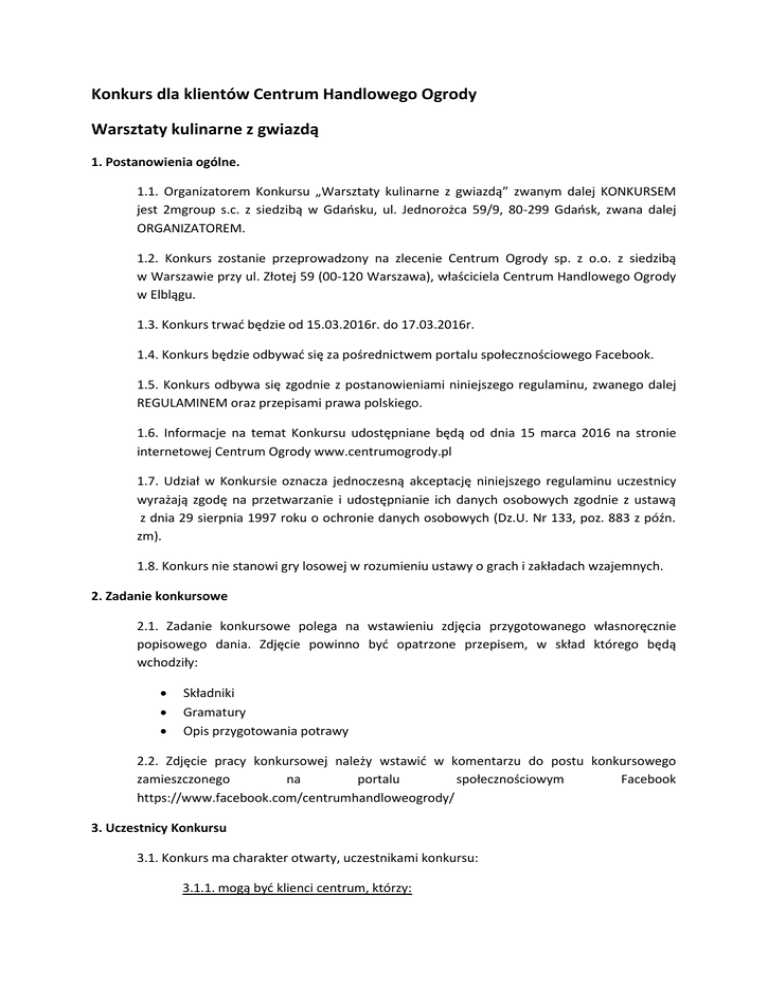 Konkurs dla klientów Centrum Handlowego Ogrody Warsztaty kulinarne z gwiazdą 1. Postanowienia ogólne. 1.1. Organizatorem Konkursu „Warsztaty kulinarne z gwiazdą” zwanym dalej KONKURSEM jest 2mgroup s.c. z siedzibą w Gdańsku, ul. Jednorożca 59/9, 80-299 Gdańsk, zwana dalej ORGANIZATOREM. 1.2. Konkurs zostanie przeprowadzony na zlecenie Centrum Ogrody sp. z o.o. z siedzibą w Warszawie przy ul. Złotej 59 (00-120 Warszawa), właściciela Centrum Handlowego Ogrody w Elblągu. 1.3. Konkurs trwać będzie od 15.03.2016r. do 17.03.2016r. 1.4. Konkurs będzie odbywać się za pośrednictwem portalu społecznościowego Facebook. 1.5. Konkurs odbywa się zgodnie z postanowieniami niniejszego regulaminu, zwanego dalej REGULAMINEM oraz przepisami prawa polskiego. 1.6. Informacje na temat Konkursu udostępniane będą od dnia 15 marca 2016 na stronie internetowej Centrum Ogrody www.centrumogrody.pl 1.7. Udział w Konkursie oznacza jednoczesną akceptację niniejszego regulaminu uczestnicy wyrażają zgodę na przetwarzanie i udostępnianie ich danych osobowych zgodnie z ustawą z dnia 29 sierpnia 1997 roku o ochronie danych osobowych (Dz.U. Nr 133, poz. 883 z późn. zm). 1.8. Konkurs nie stanowi gry losowej w rozumieniu ustawy o grach i zakładach wzajemnych. 2. Zadanie konkursowe 2.1. Zadanie konkursowe polega na wstawieniu zdjęcia przygotowanego własnoręcznie popisowego dania. Zdjęcie powinno być opatrzone przepisem, w skład którego będą wchodziły: Składniki Gramatury Opis przygotowania potrawy 2.2. Zdjęcie pracy konkursowej należy wstawić w komentarzu do postu konkursowego zamieszczonego na portalu społecznościowym Facebook https://www.facebook.com/centrumhandloweogrody/ 3. Uczestnicy Konkursu 3.1. Konkurs ma charakter otwarty, uczestnikami konkursu: 3.1.1. mogą być klienci centrum, którzy: 3.1.1.1 posiadają profil na Facebooku lub korzystają z profilu osoby znajomej 3.1.1.2. Wstawili zdjęcie przedstawiające wykonane AUTORSKIE danie oraz przepis potrzebny do jego stworzenia. 3.1.2. nie mogą uczestniczyć: 3.1.2.1. pracownicy organizatora Konkursu, 3.1.2.2. pracownicy administracji Centrum Handlowego Ogrody 3.1.2.3. inne osoby związane z przygotowaniem Konkursu, 3.1.1.1. małżonkowie, rodzice, dzieci i rodzeństwo osób wymienionych w punktach 2.1.2.1 - 2.1.2.4. 4. Wyłonienie zwycięzcy 4.1. W dniu 17 marca 2016 o godzinie 15.00 Organizator, poinformuje o tym, że za 10 minut zbiera się 3 osobowe jury, i że po tej godzinie zgodnie z regulaminem, prace konkursowe nie będą brane pod uwagę do rozstrzygnięcia konkursu, a następnie podsumuje prace konkursowe. Prace zostaną sprawdzone pod kątem praw autorskich. 4.2. Jury wybierze 8 prac konkursowych, które będą charakteryzowały się pomysłowością, starannością wykonania oraz będą atrakcyjne wizualnie. 4.3. Decyzje organizatora w sprawie wyłonienia zwycięzców są ostateczne. 4.4. Ogłoszenie wyników Konkursu odbędzie się w dniu 17 marca 2016 do godz.17.00 na portalu społecznościowym Facebook, na którym znajdować się będzie post konkursowy, a także na stronie www.centrumogrody.pl 4.5. Zwycięzcy zostaną poinformowani o wygranej za pomocą prywatnej wiadomości na Facebooku 4.6. Zdjęcia zwycięskich prac zostanie opublikowane dnia 17.03.2016 do godziny 17:00 na portalu społecznościowym Facebook oraz na stronie www.centrumogrody.pl 5. Nagrody 5.1. Nagrodami w konkursie jest udział w warsztatach kulinarnych z gwiazdą podczas I urodzin CH Ogrody 19 marca w godz. 14:00 – 15:00 w Centrum Handlowych Ogrody. W trakcie warsztatów jest możliwość porozmawiania z gwiazdą kulinarną oraz zrobienie sobie z nią zdjęcia. 5.2. Nagrodami w konkursie, są bilety na koncerty takich artystów jak Lady Pank, Mela Koteluk i Sarsa, koncerty odbędą się w Elblągu. 5.3. Uczestnik nie może zamienić nagród na gotówkę 5.4. Laureat może odmówić prawa przyjęcia nagrody. W takim przypadku nagrodę otrzymuje osoba, która uzyskała kolejne miejsce w rankingu jury. 6. Prawa autorskie 6.1 Uczestnik przenosi na organizatora nieodpłatnie autorskie prawa majątkowe do pracy konkursowej, jednocześnie upoważniając organizatora do ich prezentacji na fanpage’u Centrum Handlowego Ogrody oraz na stronie www.centrumogrody.pl. Przeniesienie ww. praw nie jest ograniczone w czasie. 6.2. W przypadku, gdy uczestnik konkursu nie będzie autorem lub będzie współautorem materiału konkursowego, zobowiązuje się on, iż będzie dysponował wszelkimi prawami oraz wymaganymi zgodami, w tym od autorów, współautorów lub właściwych organizacji zbiorowego zarządzania prawami autorskimi, niezbędnymi do opublikowania pracy konkursowej w sieci Internet, łącznie z umożliwieniem takowej publikacji osobie trzeciej. 6.3. Uczestnicy, którzy nie będą autorami lub będą współautorami pracy konkursowej i nie wypełnią obowiązku uzyskania praw i zgód w trybie ust. 7, są zobowiązani do pokrycia wszelkich kosztów poniesionych przez organizatora w związku z naruszeniem praw autorskich w wyniku opublikowania materiału konkursowego w Sieci Internet bez zgody autorów, współautorów i/lub organizacji zbiorowego zarządzania prawami autorskimi. 7. Postanowienia końcowe 7.1 Organizator ma prawo wykluczyć uczestnika z udziału w konkursie, jeśli zgłoszona przez niego praca konkursowa będzie zawierać treści sprzeczne z obowiązującym prawem, zasadami współżycia społecznego, dobrymi obyczajami, będzie naruszać postanowienia niniejszego Regulaminu, prawa organizatora i prawa osób trzecich, dobra osobiste, będzie obraźliwy, wulgarny lub zawierający groźby skierowane pod adresem osób trzecich, zawierać będzie treści dyskryminujące płeć, rasę, narodowość, język, religię, nawołujące do przemocy lub posiadać będzie charakter pornograficzny.