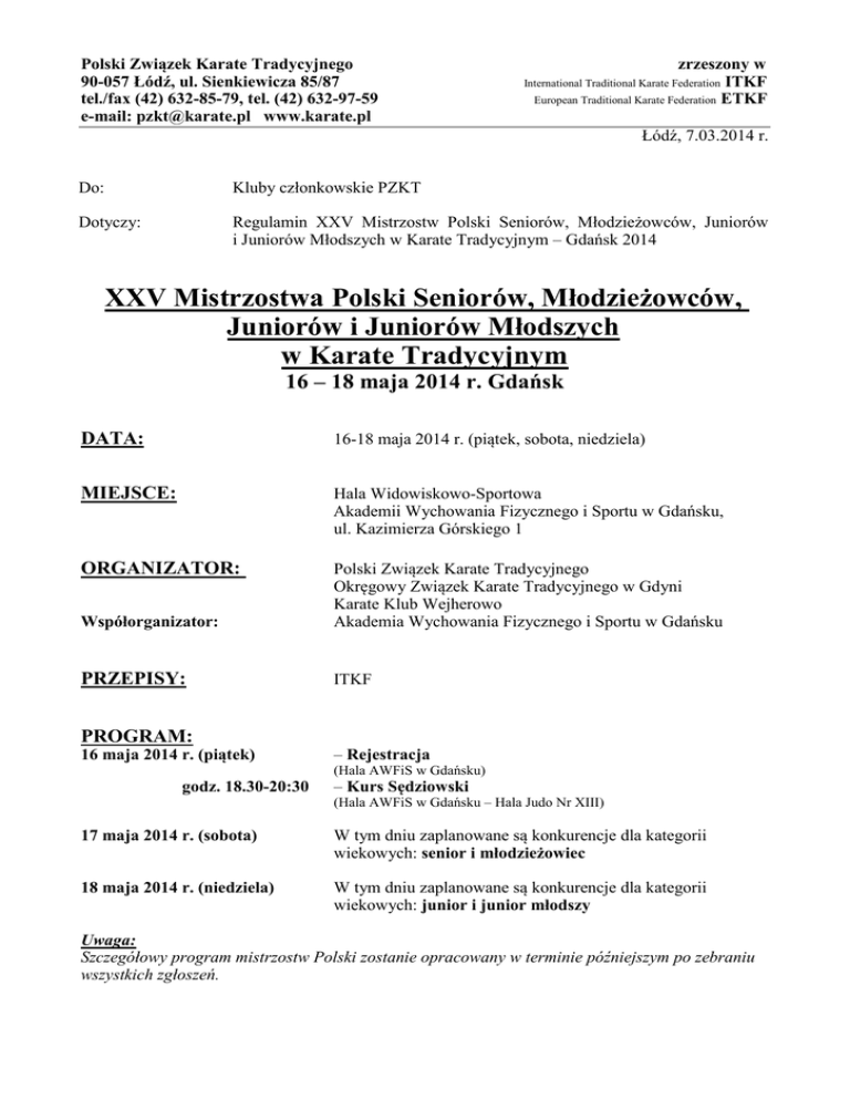 Polski Związek Karate Tradycyjnego 90-057 Łódź, ul. Sienkiewicza 85/87 tel./fax (42) 632-85-79, tel. (42) 632-97-59 e-mail: [email protected] www.karate.pl zrzeszony w ITKF European Traditional Karate Federation ETKF International Traditional Karate Federation Łódź, 7.03.2014 r. Do: Kluby członkowskie PZKT Dotyczy: Regulamin XXV Mistrzostw Polski Seniorów, Młodzieżowców, Juniorów i Juniorów Młodszych w Karate Tradycyjnym – Gdańsk 2014 XXV Mistrzostwa Polski Seniorów, Młodzieżowców, Juniorów i Juniorów Młodszych w Karate Tradycyjnym 16 – 18 maja 2014 r. Gdańsk DATA: 16-18 maja 2014 r. (piątek, sobota, niedziela) MIEJSCE: Hala Widowiskowo-Sportowa Akademii Wychowania Fizycznego i Sportu w Gdańsku, ul. Kazimierza Górskiego 1 ORGANIZATOR: Współorganizator: Polski Związek Karate Tradycyjnego Okręgowy Związek Karate Tradycyjnego w Gdyni Karate Klub Wejherowo Akademia Wychowania Fizycznego i Sportu w Gdańsku PRZEPISY: ITKF PROGRAM: 16 maja 2014 r. (piątek) – Rejestracja (Hala AWFiS w Gdańsku) godz. 18.30-20:30 – Kurs Sędziowski (Hala AWFiS w Gdańsku – Hala Judo Nr XIII) 17 maja 2014 r. (sobota) W tym dniu zaplanowane są konkurencje dla kategorii wiekowych: senior i młodzieżowiec 18 maja 2014 r. (niedziela) W tym dniu zaplanowane są konkurencje dla kategorii wiekowych: junior i junior młodszy Uwaga: Szczegółowy program mistrzostw Polski zostanie opracowany w terminie późniejszym po zebraniu wszystkich zgłoszeń. KONKURENCJE: JUNIOR MŁODSZY: 14-15 lat (ur. 2000, 1999) min. 6 kyu Kata ind. chłopców 1) Eliminacje: Heian 1-5 wykonywane parami ocena systemem chorągiewkowym Kata ind. dziewcząt 2) Półfinał (8 zawodników) i finał: do wyboru kata: Bassai Dai, Ji-On, Kan-Ku Dai, En-Pi ocena systemem punktowym (zawodnik wykonuje różne kata w półfinale i finale) Fuku-go chłopców Ki-Tei Ko-go Kumite, walka finałowa Jiyu Kumite (wolna walka) Fuku- go dziewcząt Ki-Tei Ko-go Kumite Kumite chłopców Eliminacje, ćwierćfinał: Ko- go Kumite Półfinał i finał: Jiyu Kumite (wolna walka) Kumite dziewcząt Eliminacje, ćwierćfinał: Ko- go Kumite Półfinał i finał: Jiyu Kumite (wolna walka) En- bu dziewczyna/ chłopiec En- bu chłopiec/ chłopiec JUNIOR: 16-17 lat (ur. 1998, 1997) min. 5 kyu Kata ind. chłopców Kata ind. dziewcząt Fuku-go chłopców Fuku- go dziewcząt Kumite chłopców Eliminacje: Ko- go Kumite Ćwierćfinał, półfinał i finał: Jiyu Kumite (wolna walka) Kumite dziewcząt Eliminacje: Ko- go Kumite Ćwierćfinał, półfinał i finał: Jiyu Kumite (wolna walka) En- bu dziewczyna/ chłopiec En- bu chłopiec/ chłopiec JUNIOR MŁODSZY + JUNIOR konkurencje połączone Kata drużynowe dziewcząt Kata drużynowe chłopców Kumite drużynowe chłopców MŁODZIEŻOWIEC: 18-19-20 lat (ur. 1996, 1995, 1994) min. 5 kyu Kata ind. mężczyzn Kata ind. kobiet Fuku-go mężczyzn Fuku- go kobiet Ko- go kumite mężczyzn Ko-go kumite kobiet Kumite ind. mężczyzn Kumite ind. kobiet SENIOR: 21 lat i starsi (ur. 1993 i wcześniej) min. 3 kyu Kata ind. mężczyzn Kata ind. kobiet Fuku-go mężczyzn Fuku- go kobiet Ko- go kumite mężczyzn Ko-go kumite kobiet Kumite ind. mężczyzn Kumite ind. kobiet MŁODZIEŻOWIEC + SENIOR konkurencje połączone En- bu kobieta/ mężczyzna En- bu mężczyzna/ mężczyzna Kata drużynowe kobiet Kata drużynowe mężczyzn Kumite drużynowe mężczyzn UWAGA: 1. W mistrzostwach, w konkurencjach indywidualnych startują zawodnicy zgłoszeni z poszczególnych województw zgodnie z limitem miejsc określonym w regulaminie kwalifikacji zawodników (w załączeniu). W sytuacji, kiedy w danym województwie w jakiejś konkurencji jest więcej zawodników niż daje limit, należy przeprowadzić eliminacje w tej konkurencji. 2. W konkurencjach kumite drużynowe, kata drużynowe kobiet, kata drużynowe mężczyzn, en-bu k/m oraz en-bu m/m klub może wystawić dowolną ilość drużyn i par. 3. W konkurencjach połączonych w skład jednej drużyny/pary en-bu mogą wchodzić zawodnicy z obu kategorii wiekowych, np. drużynę kata mogą tworzyć zawodnicy z kategorii wiekowej junior młodszy i junior lub młodzieżowiec i senior. 4. W konkurencji kata (poza kata indywidualnym w kategorii wiekowej junior młodszy): ELIMINACJE, PÓŁFINAŁY I FINAŁY ▪ Zawodnicy startują w systemie punktowym. ▪ Zawodnicy prezentują dowolne kata z listy ITKF 5. Uwaga dotycząca konkurencji punktowanych w systemie sportu młodzieżowego tzn. w kategorii wiekowej junior młodszy: Jeden zawodnik ma prawo startu maksymalnie w dwóch punktowanych konkurencjach indywidualnych spośród kata, kumite, fuku-go + ewentualnie w en-bu. W pozostałych konkurencjach zawodnik może startować poza limitem. PUNKTACJA W SYSTEMIE SPORTU MŁODZIEŻOWEGO Konkurencje punktowane: kata ind. dz. i chł., ko-go kumite dz. i kumite chł., fuku-go dz. i chł., en-bu k/m, en-bu m/m. Lokata Punktacja 1 9 2 7 3 6 4 5 5 4 6 3 7 2 8 1 37 WARUNKI STARTU DLA ZAWODNIKÓW: 1. Posiadanie aktualnej na rok 2014 licencji członkowskiej PZKT – koszt licencji 40 zł za rok kalendarzowy. Przypominamy, że zawodnicy startujący w eliminacjach zobowiązani są również do wykupienia licencji członkowskiej. 2. Odpowiedni wiek (liczy się rok urodzenia). Seniorzy: 21 lat i starsi (ur. w roku 1993 i wcześniej) Młodzieżowcy: 18-19-20 lat (ur. w latach 1996, 1995, 1994) Juniorzy: 16-17 lat (ur. w latach 1998, 1997) Juniorzy młodsi: 14-15 lat (ur. w latach 2000, 1999) 3. Odpowiedni stopień zarejestrowany w PZKT: Seniorzy: min. 3 kyu Młodzieżowcy: min. 5 kyu Juniorzy: min. 5 kyu Juniorzy młodsi: min. 6 kyu 4. Aktualne badania lekarskie od lekarza specjalisty w zakresie medycyny sportowej lub posiadającego certyfikat Polskiego Towarzystwa Medycyny Sportowej. 5. Ubezpieczenie NNW. Uwaga! Zgodnie z Art. 38. ust. 1. oraz ust. 2. ustawy o sporcie z dnia 25 czerwca 2010 r. (Dz. U. Nr 127, poz. 857) obowiązek zapewnienia ubezpieczenia NNW zawodnikowi uczestniczącemu we