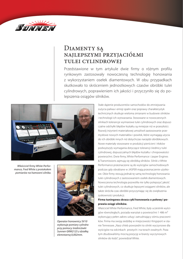 Diamenty są najlepszymi przyjaciółmi tulei cylindrowej Przedstawione w tym artykule dwie firmy o różnym profilu rynkowym zastosowały nowoczesną technologię honowania z wykorzystaniem osełek diamentowych. W obu przypadkach skutkowało to skróceniem jednostkowych czasów obróbki tulei cylindrowych, poprawieniem ich jakości i przyczyniło się do polepszenia osiągów silników. Stałe dążenie producentów samochodów do zmniejszania zużycia paliwa i emisji spalin oraz poprawy charakterystyk technicznych skutkuje wieloma zmianami w budowie silników i technologii ich wytwarzania. Stosowane w nowoczesnych silnikach tolerancje wymiarowe tulei cylindrowych oraz dopuszczalne odchyłki błędów kształtu są mniejsze niż w przeszłości. Rozwój inżynierii materiałowej umożliwił zastosowanie przemysłowe nowych materiałów i powłok, które wymagają użycia do ich obróbki innych niż dotychczas narzędzi obróbkowych. Nowe materiały stosowane w produkcji pierścieni i tłoków podwyższyły wymagania dotyczące tolerancji średnicy tulei cylindrowej, dopuszczalnych błędów kształtu i chropowatości powierzchni. Dwie firmy, White Performance i Jasper Engines & Transmissions zajmują się obróbką silników. Silniki z White Performance przeznaczone są do wyścigów samochodowych Właściciel firmy White Performance, Fred White z protokołem pomiarów na hamowni silnika. podczas gdy obrabiane w JASPER mają przeznaczenie użytkowe. Obie firmy stosują jednak tę samą technologię honowania tulei cylindrowych z zastosowaniem osełek diamentowych. Nowoczesna technologia pozwoliła nie tylko polepszyć jakość tulei cylindrowych, co skutkuje lepszymi osiągami silników, ale także skróciła czas obróbki przyczyniając się do zwiększenia zyskowności produkcji. Firma tuningowa skraca cykl honowania o połowę i poprawia osiągi silników. Właściciel White Performance, Fred White, były uczestnik wyścigów równoległych, posiada warsztat o powierzchni 1 486 m² wykonujący pełen zakres usług i zatrudniający ośmiu pracowniOperator honownicy SV10 wykonuje pomiary cylindra przy pomocy średnicówki Sunnen GRM2125 z działką elemntarną 0,002mm. ków. Firma ma swoją siedzibę w miejscowości Kingsport w stanie Tennessee. „Nasz chleb powszedni to silniki wyczynowe dla wyścigów na odcinkach prostych i na torach owalnych. Poza tym zbudowaliśmy mocną pozycję w branży wyczynowych silników do łodzi”, powiedział White. Ekran dotykowy układu sterowania pokazuje kształ cylindra i ułatwia tym samym dokonanie korekcji programu obróbki. nich występują bloki i cylindry wykonane ze pomocą układu PLC Siemens, posiada silnik wszystkich stosowanych obecnie materiałów napędu obrotowego głowicy o mocy 2,25 kW, procent, a czas pracy hamowni skrócił się się na silnikach małych poddaje obróbce oko- pewną niedogodność. Nowa honownica takich jak: żeliwo szare, żeliwo wysokoniklo a także odrębny silnik skoku o mocy 0,75kW. znacząco. ło 15 000 silników rocznie i planuje ekspansję SV-410 wyposażona jest w napęd wrzeciona we, żeliwo o zwartym graficie (CGI), Nickasil, Moment obrotowy generowany przez napęd W firmie White Performance przeprowadza na rynki silników dużych oraz wyczynowych. o mocy 7,5 kW i serwomechanizm w napędzie aluminium(Alusil). Spektrum specyfikacji wrzeciona jest duży, dzięki czemu możliwa się cykle honowania zgrubnego i wykańcza- „W tej chwili zajmujemy się budową silników skoku umożliwiające wydajną obróbkę nawet technicznych jest także szerokie: GM Bow Tie, jest praca z osełkami diamentowymi. Układ jącego przy pomocy osełek diamentowych, seryjnych i wyważaniem wałów korbowych najtwardszych materiałów. Stosujemy wielo- Dart, Honda, Toyota, a także bloki z dużymi sterowania PLC oraz silniki z regulowaną bez- a następnie wykonywane jest honowanie „pla- do dużych silników oraz planujemy zająć osełkowych głowice honujące wyposażone średnicami cylindrów takie jak Chevy i Ford. stopniowo prędkością umożliwiają uzyskanie teau” przy pomocy szczotek. „Naszym celem się silnikami półwyczynowymi”, powiedział w osełki diamentowe lub CBN w zależności od Wszystko co przejdzie przez drzwi, nawet dowolnego kąta siatki rys dla każdej średnicy jest uzyskanie tolerancji średnicy o wartości Kierownik Zakładu Matt Gregory. „Biorąc pod materiału obrabianego cylindra. Sterowanie sprężarki powietrza z cylindrami o średnicy i długości cylindra. Prędkości głowicy i skoku maksymalnej 0,005mm i odchyłki kołowości uwagę wielkość naszej produkcji nie było CNC honownicy SV410 umożliwia automa- 430mm”, powiedział Chris Webb, operator można zmieniać podczas trwania cyklu. Pulpit maksymalnie 0,002mm oraz chropowatości dobrej alternatywy dla używanej przez nas tyczną jej pracę, co w przypadku firmy Jasper obrabiarek z czterdziestoletnim doświad- układu sterowania wyposażony jest w ekran, powierzchni cylindra określonej parametrami skutkowało natychmiastowym wzrostem czeniem. Chris przyszedł do pracy w White na którym wyświetlany jest profil honowane- Rvk, Rpk i Rk o następujących wartościach: Rvk: wydajności. Performance z firmy Morgan-McClure Racing, go otworu w czasie rzeczywistym. Funcjonal- 0,87-1,0(µm); Rpk: 0,2-0,3(µm); Rk: 0,58-0,7(µm), Po wciśnięciu przez operatora przycisku „start w której zajmował się obróbką silników dla ność ta umożliwia operatorowi zatrzymanie w zależności od zastosowanych pierścieni cyklu” zostaje uruchomiony proces honowania serii wyścigów Sprint Cup. skoku w miejscu ciaśniejszym i w efekcie tłokowych”,wyjaśnił Webb. „Pomiary średnicy bloku przebiegający w pełni automatycznie. Kiedy Chris Webb dołączył do nowego szybszą korekcję błędu stożkowatości cylin- i kształtu cylindra dokonujemy przy pomocy Honownica SV410 wyposażona jest w tuleję zespołu White Performance używana