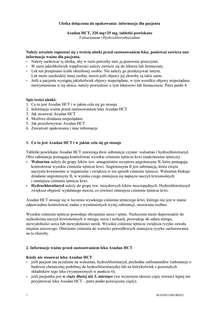 Ulotka dołączona do opakowania: informacja dla pacjenta Axudan HCT, 320 mg+25 mg, tabletki powlekane Valsartanum+Hydrochlorothiazidum Należy uważnie zapoznać się z treścią ulotki przed zastosowaniem leku, ponieważ zawiera ona informacje ważne dla pacjenta. Należy zachować tę ulotkę, aby w razie potrzeby móc ją ponownie przeczytać. W razie jakichkolwiek wątpliwości należy zwrócić się do lekarza lub farmaceuty. Lek ten przepisano ściśle określonej osobie. Nie należy go przekazywać innym. Lek może zaszkodzić innej osobie, nawet jeśli objawy jej choroby są takie same. Jeśli u pacjenta wystąpią jakiekolwiek objawy niepożądane, w tym wszelkie objawy niepożądane niewymienione w tej ulotce, należy powiedzieć o tym lekarzowi lub farmaceucie. Patrz punkt 4. Spis treści ulotki: 1. Co to jest Axudan HCT i w jakim celu się go stosuje 2. Informacje ważne przed zastosowaniem leku Axudan HCT 3. Jak stosować Axudan HCT 4. Możliwe działania niepożądane 5. Jak przechowywać Axudan HCT 6. Zawartość opakowania i inne informacje 1. Co to jest Axudan HCT i w jakim celu się go stosuje Tabletki powlekane Axudan HCT zawierają dwie substancje czynne: walsartan i hydrochlorotiazyd. Obie substancje pomagają kontrolować wysokie ciśnienie tętnicze krwi (nadciśnienie tętnicze). Walsartan należy do grupy leków tzw. antagonistów receptora angiotensyny II, które pomagają kontrolować wysokie ciśnienie tętnicze krwi. Angiotensyna II jest substancją, która zwęża naczynia krwionośne w organizmie i zwiększa w ten sposób ciśnienie tętnicze. Walsartan blokuje działanie angiotensyny II, w wyniku czego zmniejsza się napięcie naczyń krwionośnych i zmniejsza ciśnienie tętnicze krwi. Hydrochlorotiazyd należy do grupy tzw. tiazydowych leków moczopędnych. Hydrochlorotiazyd zwiększa objętość wydalanego moczu, co również zmniejsza ciśnienie tętnicze krwi. Axudan HCT stosuje się w leczeniu wysokiego ciśnienia tętniczego krwi, którego nie jest w stanie odpowiednio kontrolować żadna z wymienionych wyżej substancji, stosowana osobno. Wysokie ciśnienie tętnicze powoduje obciążenie serca i tętnic. Nieleczone może doprowadzić do uszkodzenia naczyń krwionośnych w mózgu, sercu i nerkach, prowadząc do udaru mózgu, niewydolności serca lub niewydolności nerek. Wysokie ciśnienie tętnicze zwiększa ryzyko zawału mięśnia sercowego. Obniżenie ciśnienia do wartości prawidłowych zmniejsza ryzyko zachorowania na te choroby. 2. Informacje ważne przed zastosowaniem leku Axudan HCT Kiedy nie stosować leku Axudan HCT jeśli pacjent ma uczulenie na walsartan, hydrochlorotiazyd, pochodne sulfonamidów (substancje o budowie chemicznej podobnej do hydrochlorotiazydu) lub na którykolwiek z pozostałych składników tego leku (wymienionych w punkcie 6); jeśli pacjentka jest w ciąży dłużej niż 3. miesiące (we wczesnym okresie ciąży również lepiej nie przyjmować leku Axudan HCT – patrz punkt poświęcony ciąży); 1 SE/H/0922/005/IB/022 jeśli pacjent ma ciężką chorobę wątroby, uszkodzenie małych przewodów żółciowych w wątrobie (marskość), prowadzące do zastoju żółci; jeśli pacjent ma ciężką chorobę nerek; jeśli organizm pacjenta nie wytwarza moczu (bezmocz); jeśli pacjent jest poddawany dializie („sztuczna nerka”); jeśli mimo leczenia stężenie potasu lub sodu we krwi pacjenta jest mniejsze od prawidłowego lub jeśli stężenie wapnia we krwi jest większe od prawidłowego; jeśli pacjent ma dnę moczanową; jeśli pacjent choruje na cukrzycę lub ma zaburzenia czynności nerek i otrzymuje lek obniżający ciśnienie tętnicze krwi zawierający aliskiren. Jeśli którakolwiek z powyższych sytuacji dotyczy pacjenta, nie należy przyjmować leku, lecz należy skontaktować się z lekarzem. Ostrzeżenia i środki ostrożności Przed rozpoczęciem przyjmowania leku Axudan HCT należy omówić to z lekarzem, jeśli pacjent przyjmuje leki oszczędzające potas, suplementy potasu, zamienniki soli kuchennej zawierające potas lub inne leki, które zwiększają ilość potasu we krwi (takie jak heparyna), konieczna może być regularna kontrola stężenia potasu we krwi przez lekarza. u pacjenta stwierdzono małe stężenie potasu we krwi. pacjent ma biegunkę lub ciężkie wymioty. pacjent przyjmuje duże dawki leków moczopędnych. pacjent ma ciężką chorobę serca. pacjent ma niewydolność serca lub przebył zawał mięśnia sercowego; należy ściśle przestrzegać zaleconej przez lekarza dawki początkowej. Lekarz może również skontrolować czynność nerek pacjenta. pacjent ma zwężenie tętnicy nerkowej. pacjent otrzymał niedawno nową nerkę (przebył zabieg przeszczepienia nerki). u pacjenta stwierdzono hiperaldosteronizm – chorobę, w której nadnercza wytwarzają zbyt dużo hormonu aldosteronu; w takim przypadku stosowanie walsartanu z hydrochlorotiazydem nie jest zalecane. pacjent ma chorobę wątroby lub nerek. kiedykolwiek podczas stosowania innych leków (w tym inhibitorów ACE) wystąpił u pacjenta obrzęk języka i twarzy (tzw. obrzęk naczynioruchowy) na skutek reakcji alergicznej. Jeśli takie objawy wystąpią podczas stosowania leku Axudan HCT, należy natychmiast przerwać jego przyjmowanie i już nigdy więcej go nie stosować. Patrz także punkt 4 „Możliwe działania niepożądane”. pacjent ma gorączkę, wysypkę i bóle stawów, które mogą być objawami układowego tocznia rumieniowatego (tzw. choroby autoimmunologicznej). pacjent ma cukrzycę, dnę, duże stężenie cholesterolu lub triglicerydów we krwi. u pacjenta wystąpiły w przeszłości reakcje alergiczne po zastosowaniu innych leków zmniejszających ciśnienie tętnicze krwi, należących do tej samej grupy (antagonistów receptora angiotensyny II) lub jeśli u pacjenta stwierdzono alergię lub astmę oskrzelową. u pacjenta nastąpiło pogorszenie widzenia lub odczuwa ból oka. Mogą to być objawy zw