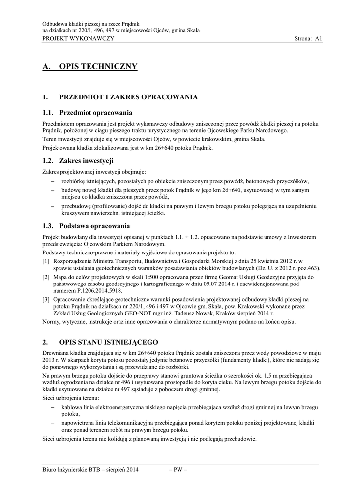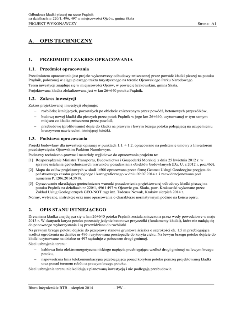 Odbudowa kładki pieszej na rzece Prądnik na działkach nr 220/1, 496, 497 w miejscowości Ojców, gmina Skała PROJEKT WYKONAWCZY Strona: A1 A. OPIS TECHICZY 1. PRZEDMIOT I ZAKRES OPRACOWAIA 1.1. Przedmiot opracowania Przedmiotem opracowania jest projekt wykonawczy odbudowy zniszczonej przez powódź kładki pieszej na potoku Prądnik, położonej w ciągu pieszego traktu turystycznego na terenie Ojcowskiego Parku Narodowego. Teren inwestycji znajduje się w miejscowości Ojców, w powiecie krakowskim, gmina Skała. Projektowana kładka zlokalizowana jest w km 26+640 potoku Prądnik. 1.2. Zakres inwestycji Zakres projektowanej inwestycji obejmuje: − rozbiórkę istniejących, pozostałych po obiekcie zniszczonym przez powódź, betonowych przyczółków, − budowę nowej kładki dla pieszych przez potok Prądnik w jego km 26+640, usytuowanej w tym samym miejscu co kładka zniszczona przez powódź, − przebudowę (profilowanie) dojść do kładki na prawym i lewym brzegu potoku polegającą na uzupełnieniu kruszywem nawierzchni istniejącej ścieżki. 1.3. Podstawa opracowania Projekt budowlany dla inwestycji opisanej w punktach 1.1. ÷ 1.2. opracowano na podstawie umowy z Inwestorem przedsięwzięcia: Ojcowskim Parkiem Narodowym. Podstawy techniczno-prawne i materiały wyjściowe do opracowania projektu to: [1] Rozporządzenie Ministra Transportu, Budownictwa i Gospodarki Morskiej z dnia 25 kwietnia 2012 r. w sprawie ustalania geotechnicznych warunków posadawiania obiektów budowlanych (Dz. U. z 2012 r. poz.463). [2] Mapa do celów projektowych w skali 1:500 opracowana przez firmę Geomat Usługi Geodezyjne przyjęta do państwowego zasobu geodezyjnego i kartograficznego w dniu 09.07 2014 r. i zaewidencjonowana pod numerem P.1206.2014.5918. [3] Opracowanie określające geotechniczne warunki posadowienia projektowanej odbudowy kładki pieszej na potoku Prądnik na działkach nr 220/1, 496 i 497 w Ojcowie gm. Skała, pow. Krakowski wykonane przez Zakład Usług Geologicznych GEO-NOT mgr inż. Tadeusz Nowak, Kraków sierpień 2014 r. Normy, wytyczne, instrukcje oraz inne opracowania o charakterze normatywnym podano na końcu opisu. 2. OPIS STAU ISTIEJĄCEGO Drewniana kładka znajdująca się w km 26+640 potoku Prądnik została zniszczona przez wody powodziowe w maju 2013 r. W skarpach koryta potoku pozostały jedynie betonowe przyczółki (fundamenty kładki), które nie nadają się do ponownego wykorzystania i są przewidziane do rozbiórki. Na prawym brzegu potoku dojście do przeprawy stanowi gruntowa ścieżka o szerokości ok. 1.5 m przebiegająca wzdłuż ogrodzenia na działce nr 496 i usytuowana prostopadle do koryta cieku. Na lewym brzegu potoku dojście do kładki usytuowane na działce nr 497 sąsiaduje z poboczem drogi gminnej. Sieci uzbrojenia terenu: − kablowa linia elektroenergetyczna niskiego napięcia przebiegająca wzdłuż drogi gminnej na lewym brzegu potoku, napowietrzna linia telekomunikacyjna przebiegająca ponad korytem potoku poniżej projektowanej kładki oraz ponad terenem robót na prawym brzegu potoku. Sieci uzbrojenia terenu nie kolidują z planowaną inwestycją i nie podlegają przebudowie. − Biuro Inżynierskie BTB – sierpień 2014 – PW – Odbudowa kładki pieszej na rzece Prądnik na działkach nr 220/1, 496, 497 w miejscowości Ojców, gmina Skała PROJEKT WYKONAWCZY 3. Strona: A2 ROZBIÓRKI Projektuje się rozebranie istniejących betonowych fundamentów kolidujących z przyczółkami projektowanej kładki – na prawym i lewym brzegu potoku Prądnik. Fundamenty usytuowane w skarpach koryta potoku należy skuć do poziomu terenu. 4. OPIS PROJEKTOWAEGO OBIEKTU BUDOWLAEGO 4.1. Opis ogólny Projektuje się budowę jednoprzęsłowej kładki pieszej o długości 13.60 m, usytuowanej prostopadle do koryta potoku. Szerokość użytkowa kładki wynosi 1.50 m. Zabezpieczenie ruchu pieszych i ewentualnych rowerzystów stanowią balustrady o wysokości 1.20 m. Konstrukcję nośną przęsła stanowi konstrukcja stalowa z profili walcowanych. Pomost i balustrady projektuje się jako drewniane. Podpory kładki stanowią żelbetowe przyczółki, usytuowane na brzegach koryta potoku i posadowione bezpośrednio. Projektowany obiekt dostosowano wysokościowo do istniejącego ukształtowania terenu na brzegach Prądnika oraz rzędnych drogi gminnej na lewym brzegu potoku. Na odcinkach dowiązania kładki do istniejącego terenu planowane jest uzupełnienie kruszywem (piasek, żwir, pospółka itp.) oraz profilowanie korpusu i gruntowej nawierzchni ścieżki. Projektowana szerokość dojść do kładki wynosi 1.50 m – jak w stanie istniejącym. Koryto cieku pod kładką pozostawia się w stanie naturalnym, nieumocnione. 4.2. Odwodnienie Wody opadowe z powierzchni kładki będą spływać grawitacyjnie poprzez szczeliny deskowania oraz poza krawędzie pomostu. 4.3. Kolorystyka Konstrukcję i wyposażenie kładki projektuje się w kolorze brunatnobrązowym. Żelbetowe przyczółki pozostawia się w naturalnym kolorze betonu. 4.4. Charakterystyczne parametry techniczne Podstawowe parametry techniczne projektowanej kładki: = 6.45 m3/s, − przepływ miarodajny: Qm = Q10% − obciążenie użytkowe: q = 4.0 kN/m2 (obc. tłumem pieszych wg PN-S-10030), − kąt skrzyżowania z przeszkodą: − światło poziome: L = 12.80 m (prostopadle do osi cieku), = 89.6°, − rozpiętość teoretyczna: Lt = 13.30 m − długość kładki: = 13.60 m, − długość całkowita ze skrzydłami: = 18.00 m, − szerokość użytkowa (w świetle balustrad): = 1.50 m, − szerokość całkowita: = 1.80 m, − wysokość konstrukcyjna: = 0.45 m, − spadek podłużny: = 6.0 %. − rzędna dna cieku w przekroju mostowym: = 312.91 m n.p.m., − rzędna zwierciadła wody miarodajnej: = 314.83 m npm., − rzędna spodu konstrukcji w osi potoku: = 315.40 m n.p.m., − rzędna pomostu kładki (w osi potoku): = 315.85 m n.p.m., − wzniesienie konstrukcji ponad dnem potoku: ~ 2.50 m 