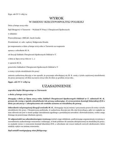 Sygn. akt IV U 1185/14 WYROK W IMIENIU RZECZYPOSPOLITEJ POLSKIEJ Dnia 4 lutego 2015 roku Sąd Okręgowy w Tarnowie – Wydział IV Pracy i Ubezpieczeń Społecznych w składzie: Przewodniczący: SSR del. Jacek Liszka Protokolant: st. sekr. sądowy Małgorzata Houda po rozpoznaniu w dniu 4 lutego 2015 roku w Tarnowie na rozprawie sprawy z odwołania M. K. od decyzji Zakładu Ubezpieczeń Społecznych Oddział w T. z dnia 31 lipca 2014 roku nr (...) w sprawie M. K. przeciwko Zakładowi Ubezpieczeń Społecznych Oddział w T. o rentę z tytułu niezdolności do pracy zmienia zaskarżoną decyzję w ten sposób, że przyznaje odwołującej się M. K. rentę z tytułu częściowej niezdolności do pracy począwszy od dnia 24 marca 2014 roku do dnia 31 grudnia 2015 roku. Sygn. akt IV U 1185/14 UZASADNIENIE wyroku Sądu Okręgowego w Tarnowie z dnia 4 lutego 2015 roku Decyzją z dnia 31 lipca 2014 roku Zakład Ubezpieczeń Społecznych Oddział w T. odmówił M. K. prawa do renty z tytułu niezdolności do pracy wskazując, iż orzeczeniem komisji lekarskiej ZUS z dnia 30.06.2014 r. ubezpieczona nie została uznana za niezdolną do pracy. Odwołanie od powyższej decyzji wniosła M. K., domagając się jej zmiany i przyznania prawa do renty z tytułu niezdolności do pracy. Ubezpieczona podniosła, iż zaskarżona decyzja jest dla niej krzywdząca, gdyż ze względu na stan zdrowia nie jest w stanie podjąć zatrudnienia zgodnego z posiadanym zawodem i doświadczeniem, wobec czego domaga się ponownego zbadania sprawy. W odpowiedzi na odwołanieorgan rentowy wniósł o jego oddalenie, podtrzymując argumentację wyrażoną w uzasadnieniu zaskarżonego orzeczenia i wskazując, iż brak podstaw do uznania ubezpieczonej za niezdolną do pracy, co znalazło wyraz w orzeczeniu komisji lekarskiej ZUS, a odwołanie nie wnosi żadnych nowych okoliczności, które miałyby wpływ na zmianę orzeczenia. Sąd ustalił następujący stan faktyczny: M. K. urodziła się dnia (...), z zawodu jest kelnerką, w okresie od 29.06.2000 r. do 28.03.2013 r. pracowała w Gminnej Spółdzielni (...) w C. jako sprzedawca. Ubezpieczona w okresie od 29.03.2013 r. do 23.03.2014 r. pobierała w ZUS świadczenie rehabilitacyjne. Dowód: - akta ZUS W dniu 17.03.2014 r. ubezpieczona złożyła wniosek do ZUS o ustalenie prawa do renty. Orzeczeniem lekarza orzecznika ZUS z dnia 8.05.2014 r. ubezpieczona została uznana za częściowo niezdolną do pracy do dnia 30.04.2015 r. Orzeczeniem komisji lekarskiej ZUS z dnia 30.06.2014 r. wydanym w trybie nadzoru nad wykonywaniem orzekania o niezdolności do pracy nie stwierdzono niezdolności do pracy po stronie ubezpieczonego. Wobec powyższego, zaskarżoną decyzją z dnia 31.07.2014 r. Zakład Ubezpieczeń Społecznych odmówił odwołującej się prawa do renty z tytułu niezdolności do pracy. Od tej decyzji ubezpieczona odwołała się. Dowód: akta ZUS W toku niniejszego postępowania sądowego u odwołującej się stwierdzono: - naczyniopochodne uszkodzenie mózgu i móżdżku, - zespół móżdżkowy, - stan po zamknięciu przetrwałego kanału owalnego zapinką Figulla Flex PFO, - nadciśnienie tętnicze, - niedoczynność tarczycy w wywiadzie, - stan po operacji żylaków kończyn dolnych, - przebyty zator tętnicy płucnej. Badana z objawami uszkodzenia mózgu i móżdżku potwierdzonymi badaniami rezonansu magnetycznego głowy, w którym stwierdzono liczne ogniska niedokrwienne naczyniopochodne w móżdżku i mózgu. W 2012 r. u odwołującej wykonano zabieg zamknięcia ubytku w przegrodzie międzyprzedsionkowej pod postacią przetrwałego kanału owalnego przy pomocy zapinki Figulla Flex PFO będącego przyczyną zatorów skrzyżowanych mózgu. Obecnie u chorej utrzymują się nasilone zawroty głowy, zaburzenia równowagi z dodatnią próbą Romberga. W badaniu neurologicznym stwierdza się oczopląs poziomy przy patrzeniu w lewo, ślad ataksji w kończynie dolnej prawej, niepewny chód na poszerzonej podstawie. Ubezpieczona jest spowolniała psycho-ruchowo. Rozpoznane schorzenia są dobrze potwierdzone w trakcie licznych hospitalizacji i nie budzą wątpliwości. Odwołująca jest osobą z naruszoną sprawnością organizmu w stopniu powodującym częściową niezdolność do pracy przez okres od 24.03.2014 r. do 31.12.2015 r. Dowód: - opinia sądowo – lekarska z dnia 21.10.2014 r. – k. 13-14, - dokumentacja lekarska – akta ZUS. Sąd, ustalając stan faktyczny w niniejszej sprawie, podzielił wnioski płynące z opinii biegłych z zakresu kardiologii, chorób wewnętrznych i neurologii uznając, iż zawierają one kompleksową i wyczerpującą ocenę stanu zdrowia odwołującej się, a nadto uwzględniają wpływ wszystkich rozpoznanych u niej schorzeń na jej zdolność do pracy. Sąd uznał, iż charakterystyka schorzeń została przez biegłych oceniona prawidłowo z punktu widzenia zasad logiki, przy wykorzystaniu wiedzy specjalistycznej, popartej doświadczeniem zawodowym. Zważyć przy tym należy, iż opinia została wydana przez biegłych sądowych o specjalnościach adekwatnych do schorzeń zdiagnozowanych u opiniowanej, zaś opiniujący swe ustalenia i wnioski wywiedli po bezpośrednim badaniu oraz szczegółowej analizie całości dokumentacji medycznej zgromadzonej w sprawie. Opinia biegłych spełniła nadto wymogi przewidziane dla tego rodzaju środków dowodowych określone w art. 278 kpc i art.285 kpc, zaś w toku postępowania nie ujawniły się żadne okoliczności, które mogłyby podważać zaufanie do wiedzy czy bezstronności biegłych. Również strony postępowania nie zgłosiły żadnych merytorycznych zarzutów mających wpływ na wartość dowodową przedmiotowej opinii. Dowody z dokumentów zalegających w aktach Zakładu Ubezpieczeń Społecznych nie budziły wątpliwości Sądu co do ich autentyczności, a ponadto nie były kwestionowane przez strony postępowania. Sąd Okręgowy rozważył, co następuje: Odwołanie zasługuje na 