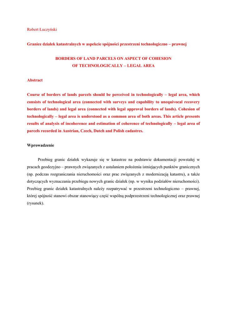 Robert Łuczyński Granice działek katastralnych w aspekcie spójności przestrzeni technologiczno – prawnej BORDERS OF LAND PARCELS ON ASPECT OF COHESION OF TECHNOLOGICALLY – LEGAL AREA Abstract Course of borders of lands parcels should be perceived in technologically – legal area, which consists of technological area (connected with surveys and capability to unequivocal recovery borders of lands) and legal area (connected with legal approval borders of lands). Cohesion of technologically – legal area is understood as a common area of both areas. This article presents results of analysis of incoherence and estimation of coherence of technologically – legal area of parcels recorded in Austrian, Czech, Dutch and Polish cadastres. Wprowadzenie Przebieg granic działek wykazuje się w katastrze na podstawie dokumentacji powstałej w pracach geodezyjno – prawnych związanych z ustalaniem położenia istniejących punktów granicznych (np. podczas rozgraniczania nieruchomości oraz prac związanych z modernizacją katastru), a także dotyczących wyznaczania przebiegu nowych granic działek (np. w wyniku podziałów nieruchomości). Przebieg granic działek katastralnych należy rozpatrywać w przestrzeni technologiczno – prawnej, której spójność stanowi obszar stanowiący część wspólną podprzestrzeni technologicznej oraz prawnej (rysunek). Rysunek. Przestrzeń technologiczno – prawna, opracowanie własne [Łuczyński, 2009] Podprzestrzeń technologiczna jest to zbiór punktów granicznych określonych poprzez pomiar i sporządzenie odpowiedniej dokumentacji pozwalającej na jednoznaczne odtworzenie położenia punktów granicznych na gruncie, których współrzędne X, Y zostały wyznaczone zgodnie z zasadami jednolitości prac geodezyjnych i kartograficznych. Przez jednolitość prac geodezyjnych i kartograficznych rozumie się jednolity system miar, jednolity państwowy system odniesień przestrzennych oraz jednolite standardy techniczne. Podprzestrzeń prawna to zbiór procedur administracyjnych i sądowych, skutkujących prawnym zatwierdzeniem określonego położenia punktów i linii granicznych. W niniejszym referacie zostanie omówiona problematyka określania przebiegu granic działek w katastrze holenderskim, austriackim, czeskim i polskim. W pierwszej kolejności zostaną omówione wyniki badań związanych z analizą niespójności przestrzeni technologiczno – prawnej w tych katastrach, a następnie zostanie przedstawiona ocena stanu niespójności przestrzeni granicznej. Wyniki analizy niespójności przestrzeni technologiczno - prawnej W katastrze holenderskim współrzędne punktów granicznych wykazywanych na cyfrowej mapie katastralnej (LKI) pochodzą w znacznym zakresie z digitalizacji map analogowych [Gaździcki, 1995]. Dokładność wyznaczenia współrzędnych punktów granicznych na mapie katastralnej jest zatem pochodną dokładności sporządzenia materiału pierwotnego i dokładności digitalizacji. O dokładności mapy decyduje dopuszczalny błąd długości odcinka granicy na mapie [Wakker i inni, 2003]. Jest to błąd względny długości, niezależny od dokładności położenia poszczególnych punktów granicznych. Wielkość tego błędu - mD, odnosząca się do odcinków granic między punktami granicznymi, nie może przekraczać wielkości: - mD 2 20 cm - na obszarach zurbanizowanych; - mD 2 40 cm - na terenach wiejskich. Dokumenty pomiarowe dotyczące przebiegu granic – m. in. szkice i zarysy, przechowuje się w archiwum. Przy podziałach nieruchomości nie zaprasza się właścicieli sąsiednich nieruchomości w teren oraz nie wyznacza się przebiegu granic zewnętrznych, lecz przyjmuje się je na podstawie mapy katastralnej. Odpowiedzialna za pomiary katastralne ekipa nie ustala w terenie granic zewnętrznych dzielonej działki, a jedynie ustala (mierzy) nowo powstałe granice. Następnie liczone są przecięcia nowych granic z granicami według mapy (LKI). W stosunku do granic zewnętrznych podlegających podziałowi nie następuje zatem zmiana geometrii mapy katastralnej. Wyłącznie współrzędne nowych granic wprowadzane są na podstawie pomiarów terenowych. Ciężar dbania o znaki graniczne i wiedzę, co do ich położenia w terenie przesunięty został w Holandii w kierunku właścicieli, którzy z pokolenia na pokolenie troszczą się o znaki graniczne. Wytyczenie przebiegu granic może nastąpić odpłatnie podczas wznowienia znaków granicznych, które nie odbywa się w oparciu o mapę katastralną, lecz bazuje na pierwotnych danych z archiwum [Zevenbergen, 1998]. Kwestię pomiarów granic działek oraz ich wykazywania w katastrze austriackim reguluje ustawa federalna 1968 r. Celem tej ustawy było stworzenie odpowiedniej ochrony prawnej wiarygodności granic [Höflinger, 1998]. Po zaaprobowaniu przebiegu granic przez właścicieli działek sąsiednich, zostają one pomierzone oraz wpisane do katastru granicznego. Punkty graniczne oraz ich współrzędne w narodowym układzie współrzędnych są prawomocne, tzn. objęte publiczną ochroną państwa. Dane dotyczące właścicieli, zawarte w katastrze granicznym odzwierciedlają zapisy w księgach wieczystych. Nie ma możliwości zasiedzenia części działki zapisanej w katastrze granicznym. Pozostałe granice, nieujęte w katastrze granicznym, do czasu ich trwałej stabilizacji, pomiaru i prawnego zatwierdzenia (spełnienia kryteriów przestrzeni technologiczno – prawnej), ujawniane są w katastrze podatku gruntowego. Za podprzestrzeń technologiczną są odpowiedzialne określone służby geodezyjne, na których spoczywa obowiązek pomiaru przebiegu granic zgodnie ze standardami technicznymi obowiązującymi w kraju. Na podstawie rozporządzenia federalnego z 1994 r., pomiary przeprowadza się w taki sposób, aby uwzględniając średnią dokładność położenia punktów osnowy (punkty triangulacyjne: +/- 5 cm, punkty zagęszczające: +/- 7 cm) nie została prz