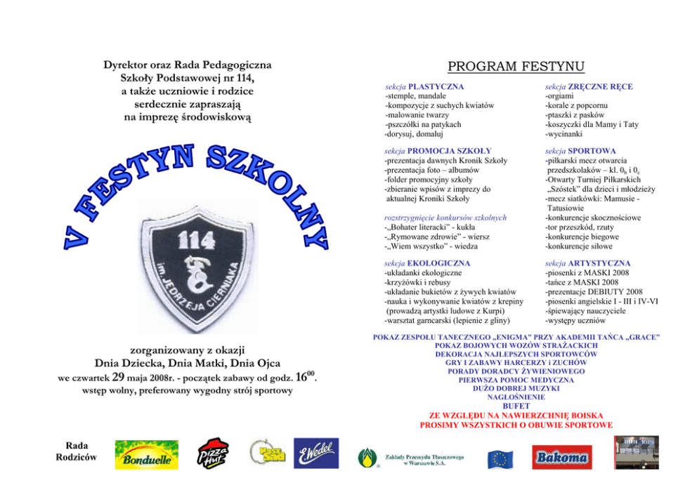 Dyrektor oraz Rada Pedagogiczna Szkoły Podstawowej nr 114, a takŜe uczniowie i rodzice serdecznie zapraszają na imprezę środowiskową PROGRAM FESTYNU zorganizowany z okazji Dnia Dziecka, Dnia Matki, Dnia Ojca 00 we czwartek 29 maja 2008r. - początek zabawy od godz. 16 . wstęp wolny, preferowany wygodny strój sportowy sekcja PLASTYCZNA -stemple, mandale -kompozycje z suchych kwiatów -malowanie twarzy -pszczółki na patykach -dorysuj, domaluj sekcja ZRĘCZNE RĘCE -orgiami -korale z popcornu -ptaszki z pasków -koszyczki dla Mamy i Taty -wycinanki sekcja PROMOCJA SZKOŁY -prezentacja dawnych Kronik Szkoły -prezentacja foto – albumów -folder promocyjny szkoły -zbieranie wpisów z imprezy do aktualnej Kroniki Szkoły rozstrzygnięcie konkursów szkolnych -„Bohater literacki” - kukła -„Rymowane zdrowie” - wiersz -„Wiem wszystko” - wiedza sekcja SPORTOWA -piłkarski mecz otwarcia przedszkolaków – kl. 0b i 0c -Otwarty Turniej Piłkarskich „Szóstek” dla dzieci i młodzieŜy -mecz siatkówki: Mamusie Tatusiowie -konkurencje skocznościowe -tor przeszkód, rzuty -konkurencje biegowe -konkurencje siłowe sekcja EKOLOGICZNA -układanki ekologiczne -krzyŜówki i rebusy -układanie bukietów z Ŝywych kwiatów -nauka i wykonywanie kwiatów z krepiny (prowadzą artystki ludowe z Kurpi) -warsztat garncarski (lepienie z gliny) sekcja ARTYSTYCZNA -piosenki z MASKI 2008 -tańce z MASKI 2008 -prezentacje DEBIUTY 2008 -piosenki angielskie I - III i IV-VI -śpiewający nauczyciele -występy uczniów POKAZ ZESPOŁU TANECZNEGO „ENIGMA” PRZY AKADEMII TAŃCA „GRACE” POKAZ BOJOWYCH WOZÓW STRAśACKICH DEKORACJA NAJLEPSZYCH SPORTOWCÓW GRY I ZABAWY HARCERZY i ZUCHÓW PORADY DORADCY śYWIENIOWEGO PIERWSZA POMOC MEDYCZNA DUśO DOBREJ MUZYKI NAGŁOŚNIENIE BUFET ZE WZGLĘDU NA NAWIERZCHNIĘ BOISKA PROSIMY WSZYSTKICH O OBUWIE SPORTOWE Rada Rodziców
