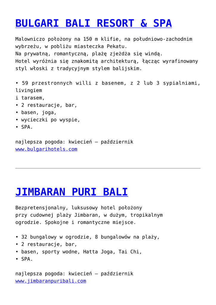 BULGARI BALI RESORT & SPA Malowniczo położony na 150 m klifie, na południowo-zachodnim wybrzeżu, w pobliżu miasteczka Pekatu. Na prywatną, romantyczną, plażę zjeżdża się windą. Hotel wyróżnia się znakomitą architekturą, łącząc wyrafinowany styl włoski z tradycyjnym stylem balijskim. • 59 przestronnych willi z basenem, z 2 lub 3 sypialniami, livingiem i tarasem, • 2 restauracje, bar, • basen, joga, • wycieczki po wyspie, • SPA. najlepsza pogoda: kwiecień – październik www.bulgarihotels.com JIMBARAN PURI BALI Bezpretensjonalny, luksusowy hotel położony przy cudownej plaży Jimbaran, w dużym, tropikalnym ogrodzie. Spokojne i romantyczne miejsce. • • • • 32 bungalowy w ogrodzie, 8 bungalowów na plaży, 2 restauracje, bar, basen, sporty wodne, Hatta Joga, Tai Chi, SPA. najlepsza pogoda: kwiecień – październik www.jimbaranpuribali.com KARMA JIMBARAN RESORT Położony w pięknej Zatoce Jimbaran, w tropikalnym ogrodzie przy białej, piaszczystej plaży. Przestronne i luksusowe wille łączą nowoczesne wyposażenie z elementami tradycyjnego, balijskiego wystroju. • • • • • 38 willi z basenem z 1-4 sypialniami, restauracja, bar, basen, sporty wodne, wycieczki statkiem, joga, przejażdżki konne, wycieczki w góry, znakomite SPA. najlepsza pogoda: kwiecień – październik www.karmajimbaran.com TIKEHAU PEARL BEACH RESORT Uważany za jeden z najpiękniejszych atoli w Polinezji, w kształcie korony, atol Tikehau utworzony jest z wysepek, „zawieszonych” pomiędzy błękitem nieba i turkusem wody. Hotel znajduje się na wysepce Motu Tiano, wsród palm kokosowych i białych plaż. Szklana podłoga w bungalowach na wodzie umożliwia obserwację świata podwodnego. • • • • 13 bungalowów na plaży, 24 na wodzie, restauracja, bar, basen, nurkowanie, wycieczki łodzią, piknik na plaży, • wycieczki rowerem do pobliskich wiosek, • SPA. najlepsza pogoda: cały rok www.pearlresorts.com/tikehaupearlbeachresort/ MOTU TETA Wchodząca w skład atolu Rangiroa – największego w Arcipelagu Tuamotu, wysepka Motu Tetaraire jest wyjątkowym miejscem. Jedyny hałas, jaki można tu usłyszeć – to szum fal i szelest palm kokosowych. Jedyne decyzje, które należy podjąć – to czego się teraz napić i co zjeść. Gwarantowany całkowity relaks, spokój i odizolowanie od świata. • 1 willa w stylu polinezyjskim z 3 sypialniami, salonem, jadalnia i oddaloną kuchnią, w której znakomity kucharz przyrządza posiłki, • 1 bungalow z 2-sypialniami, • nurkowanie, windsurfing, przejażdżki łodzią na pobliskie wyspy, • łowienie ryb, zbieranie muszli. najlepsza pogoda: cały rok www.yourdreamisland.com BORA BORA PEARL BEACH RESOR T & SPA Położony na wysepce Motu Tevairoa, 10 minut statkiem od legendarnej wyspy Bora Bora. • 20 bungalowów w ogrodzie z prywatnym basenem, 10 bungalowów na plaży z jacuzzi, 50 bungalowów na wodzie z dużym tarasem, • 3 restauracje, 2 bary, • basen, sporty wodne, wycieczki katamaranem, korty tenisowe, • loty helikopterem, • karmienie rekinów i płaszczek. najlepsza pogoda: cały rok www.pearlresorts.com/bora LE TAHA’A ISLAND RESOR T & SPA Położony na prywatnej wysepce 5 minut drogi statkiem od wyspy Taha’a, leżącej w Archipelagu Wysp Towarzystwa, 230 km na zachód od Tahiti. Taha’a często zwana jest wyspą waniliową, ponieważ rocznie produkuje 25 ton tego cennego specjału. Taha’a to także wyspa, gdzie ludzie żyją w pełnej harmonii z niezwykle piękną, bogatą i dziewiczą przyrodą. • 48 przestronnych bungalowów na wodzie, • 12 willi na plaży z prywatnym basenem i ogrodem, • 3 restauracje, 2 bary, • • • • basen, sporty wodne, kort tenisowy, loty helikopterem na Bora Bora, wycieczki jeepem po wyspie, łowienie ryb, nurkowanie, wspaniałe SPA. najlepsza pogoda: cały rok www.letahaa.com PACIFIC RESORT RAROTONGA Położony na południowo-wschodnim wybrzeżu największej wyspy archipelagu – Rarotonga, przy krystalicznie czystej i bezpiecznej zatoce Muri. Spokojne, leniwe dni można spędzić wylegując się na białej plaży i kąpiąc w ciepłych wodach Pacyfiku, by nocami tańczyć i bawić się w okolicznych wioskach. • • • • 56 komfortowych bungalowów, 8 willi z 2-3 sypialniami, restauracja, bar, basen, masaże, nurkowanie, sporty wodne, wycieczki w interior wyspy. najlepsza pogoda: maj – październik www.pacificresort.com PACIFIC RESORT AITUTAKI W trakcie 40 minutowego lotu z Raratonga na Aitutaki można podziwiać niezwykle piękne laguny, których kolor przechodzi z jasnoturkusowego poprzez szmaragdowy do indygo. • • • • • 24 luksusowe bungalowy położone na plaży, 3 wille, restauracja, bar, basen, SPA, wycieczki na rowerach lub skuterach, nurkowanie, przejażdżki łodzią, łowienie ryb. najlepsza pogoda: cały rok www.aitutaki.pacificresort.com TURTLE ISLAND Bujna roślinność, białe plaże, niesamowicie błękitne wody oceanu zostały uwiecznione na filmie „Blue Lagoon”. Romantyczne pikniki na jednej z 14 dziewiczych plaż wyspy, egzotyczna przyroda, kąpiele w krystalicznie czystych lagunach, malownicze zachody słońca mogą być wspaniałą scenerią podróży poślubnych. • 14 willi 2-pokojowych, • śniadania podawane na tarasie willi, romantyczne zachodzie słońca, pikniki na plaży, wyrafinowane i urozmaicone duży wybór win, • nurkowanie z maską lub z butlami, łowienie ryb morzu, przejażdżki łodzià, piknik na plaży, wycieczki wspinaczka górska, masaże. najlepsza pogoda: kwiecień – wrzesień kolacje o menu oraz na pełnym rowerem, www.turtlefiji.com