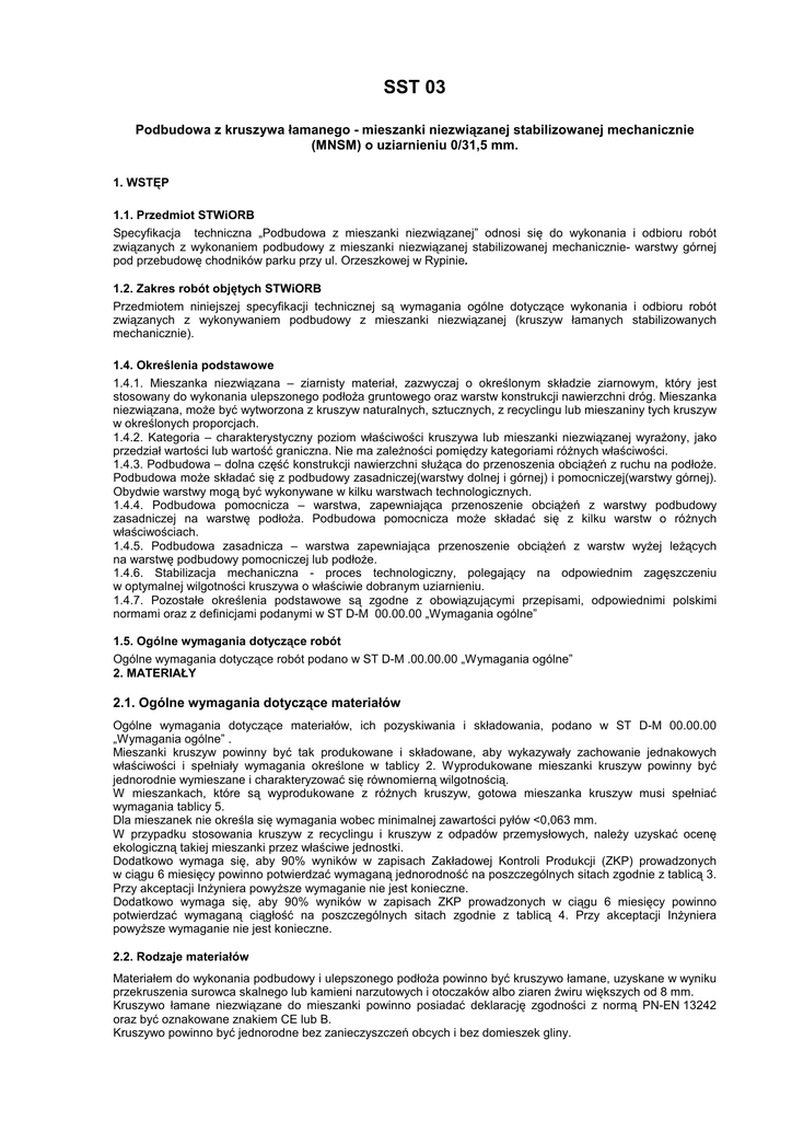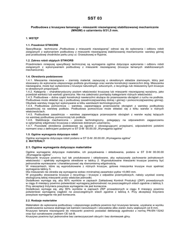 SST 03 Podbudowa z kruszywa łamanego - mieszanki niezwiązanej stabilizowanej mechanicznie (MNSM) o uziarnieniu 0/31,5 mm. 1. WSTĘP 1.1. Przedmiot STWiORB Specyfikacja techniczna „Podbudowa z mieszanki niezwiązanej” odnosi się do wykonania i odbioru robót związanych z wykonaniem podbudowy z mieszanki niezwiązanej stabilizowanej mechanicznie- warstwy górnej pod przebudowę chodników parku przy ul. Orzeszkowej w Rypinie. 1.2. Zakres robót objętych STWiORB Przedmiotem niniejszej specyfikacji technicznej są wymagania ogólne dotyczące wykonania i odbioru robót związanych z wykonywaniem podbudowy z mieszanki niezwiązanej (kruszyw łamanych stabilizowanych mechanicznie). 1.4. Określenia podstawowe 1.4.1. Mieszanka niezwiązana – ziarnisty materiał, zazwyczaj o określonym składzie ziarnowym, który jest stosowany do wykonania ulepszonego podłoża gruntowego oraz warstw konstrukcji nawierzchni dróg. Mieszanka niezwiązana, może być wytworzona z kruszyw naturalnych, sztucznych, z recyclingu lub mieszaniny tych kruszyw w określonych proporcjach. 1.4.2. Kategoria – charakterystyczny poziom właściwości kruszywa lub mieszanki niezwiązanej wyrażony, jako przedział wartości lub wartość graniczna. Nie ma zależności pomiędzy kategoriami różnych właściwości. 1.4.3. Podbudowa – dolna część konstrukcji nawierzchni służąca do przenoszenia obciążeń z ruchu na podłoże. Podbudowa może składać się z podbudowy zasadniczej(warstwy dolnej i górnej) i pomocniczej(warstwy górnej). Obydwie warstwy mogą być wykonywane w kilku warstwach technologicznych. 1.4.4. Podbudowa pomocnicza – warstwa, zapewniająca przenoszenie obciążeń z warstwy podbudowy zasadniczej na warstwę podłoża. Podbudowa pomocnicza może składać się z kilku warstw o różnych właściwościach. 1.4.5. Podbudowa zasadnicza – warstwa zapewniająca przenoszenie obciążeń z warstw wyżej leżących na warstwę podbudowy pomocniczej lub podłoże. 1.4.6. Stabilizacja mechaniczna - proces technologiczny, polegający na odpowiednim zagęszczeniu w optymalnej wilgotności kruszywa o właściwie dobranym uziarnieniu. 1.4.7. Pozostałe określenia podstawowe są zgodne z obowiązującymi przepisami, odpowiednimi polskimi normami oraz z definicjami podanymi w ST D-M 00.00.00 „Wymagania ogólne” 1.5. Ogólne wymagania dotyczące robót Ogólne wymagania dotyczące robót podano w ST D-M .00.00.00 „Wymagania ogólne” 2. MATERIAŁY 2.1. Ogólne wymagania dotyczące materiałów Ogólne wymagania dotyczące materiałów, ich pozyskiwania i składowania, podano w ST D-M 00.00.00 „Wymagania ogólne” . Mieszanki kruszyw powinny być tak produkowane i składowane, aby wykazywały zachowanie jednakowych właściwości i spełniały wymagania określone w tablicy 2. Wyprodukowane mieszanki kruszyw powinny być jednorodnie wymieszane i charakteryzować się równomierną wilgotnością. W mieszankach, które są wyprodukowane z różnych kruszyw, gotowa mieszanka kruszyw musi spełniać wymagania tablicy 5. Dla mieszanek nie określa się wymagania wobec minimalnej zawartości pyłów <0,063 mm. W przypadku stosowania kruszyw z recyclingu i kruszyw z odpadów przemysłowych, należy uzyskać ocenę ekologiczną takiej mieszanki przez właściwe jednostki. Dodatkowo wymaga się, aby 90% wyników w zapisach Zakładowej Kontroli Produkcji (ZKP) prowadzonych w ciągu 6 miesięcy powinno potwierdzać wymaganą jednorodność na poszczególnych sitach zgodnie z tablicą 3. Przy akceptacji Inżyniera powyższe wymaganie nie jest konieczne. Dodatkowo wymaga się, aby 90% wyników w zapisach ZKP prowadzonych w ciągu 6 miesięcy powinno potwierdzać wymaganą ciągłość na poszczególnych sitach zgodnie z tablicą 4. Przy akceptacji Inżyniera powyższe wymaganie nie jest konieczne. 2.2. Rodzaje materiałów Materiałem do wykonania podbudowy i ulepszonego podłoża powinno być kruszywo łamane, uzyskane w wyniku przekruszenia surowca skalnego lub kamieni narzutowych i otoczaków albo ziaren żwiru większych od 8 mm. Kruszywo łamane niezwiązane do mieszanki powinno posiadać deklarację zgodności z normą PN-EN 13242 oraz być oznakowane znakiem CE lub B. Kruszywo powinno być jednorodne bez zanieczyszczeń obcych i bez domieszek gliny. 2.3. Wymagania dla materiałów 2.3.1. Uziarnienie mieszanki Krzywa uziarnienia mieszanki niezwiązanej z kruszywa powinna leżeć między krzywymi granicznymi pól dobrego uziarnienia podanymi w tablicy 1. Tablica 1. Zalecane graniczne uziarnienie mieszanki kruszywa łamanego 0/31,5 do podbudowy Rzędne krzywych Rzędne krzywych Sito o boku oczka granicznych granicznych kwadratowego, dla mieszanki deklarowanych przez mm niezwiązanej producenta SDV Przechodzi przez 31,5 16,0 8,0 4,0 2,0 1,0 0,5 0,063 90-100 63-77 43-60 30-52 23-40 14-35 10-30 0-9 90-100 55-85 35-68 22-60 16-47 9-40 5-35 0-12 2.3.2. Właściwości kruszywa Właściwości kruszywa do podbudowy stabilizowanej mechanicznie określa tablica 2. Tablica 2. Wymagania dla kruszywa do mieszanki niezwiązanej Właściwości Uziarnienie wg PN-EN 933-1 kategoria nie niższa niż: Ogólne granice i tolerancje uziarnienia kruszywa grubego na sitach pośrednich wg PN-EN 933-1, odchylenie nie większe niż wg kategorii Tolerancje typowego uziarnienia kruszywa drobnego i kruszywa o ciągłym uziarnieniu wg PN-EN 933-1, odchylenie nie większe niż wg kategorii Kształt kruszywa grubego wg PN-EN 933-4 maksymalne wartości wskaźnika płaskości lub maksymalne wartości wskaźnika kształtu Kategorie procentowych zawartości ziaren o powierzchni przekruszonej lub łamanych oraz ziaren całkowicie zaokrąglonych w kruszywie grubym wg PN-EN 933-5 Zawartość pyłów wg PN-EN 933-1 - w kruszywie grubym - w kruszywie drobnym Odporność na rozdrabnianie wg PN-EN 1097-2, kategoria nie wyższa niż Odporność na ścieranie kruszywa grubego wg PN-EN 1097-1 Gęstość wg PN-EN 1097-6 Nasiąkliwość wg PN-