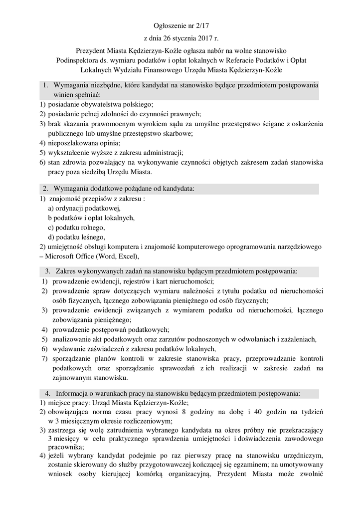 Ogłoszenie nr 2/17 z dnia 26 stycznia 2017 r. Prezydent Miasta Kędzierzyn-Koźle ogłasza nabór na wolne stanowisko Podinspektora ds. wymiaru podatków i opłat lokalnych w Referacie Podatków i Opłat Lokalnych Wydziału Finansowego Urzędu Miasta Kędzierzyn-Koźle 1. Wymagania niezbędne, które kandydat na stanowisko będące przedmiotem postępowania winien spełniać: 1) posiadanie obywatelstwa polskiego; 2) posiadanie pełnej zdolności do czynności prawnych; 3) brak skazania prawomocnym wyrokiem sądu za umyślne przestępstwo ścigane z oskarżenia publicznego lub umyślne przestępstwo skarbowe; 4) nieposzlakowana opinia; 5) wykształcenie wyższe z zakresu administracji; 6) stan zdrowia pozwalający na wykonywanie czynności objętych zakresem zadań stanowiska pracy poza siedzibą Urzędu Miasta. 2. Wymagania dodatkowe pożądane od kandydata: 1) znajomość przepisów z zakresu : a) ordynacji podatkowej, b podatków i opłat lokalnych, c) podatku rolnego, d) podatku leśnego, 2) umiejętność obsługi komputera i znajomość komputerowego oprogramowania narzędziowego – Microsoft Office (Word, Excel), 3. Zakres wykonywanych zadań na stanowisku będącym przedmiotem postępowania: 1) prowadzenie ewidencji, rejestrów i kart nieruchomości; 2) prowadzenie spraw dotyczących wymiaru należności z tytułu podatku od nieruchomości osób fizycznych, łącznego zobowiązania pieniężnego od osób fizycznych; 3) prowadzenie ewidencji związanych z wymiarem podatku od nieruchomości, łącznego zobowiązania pieniężnego; 4) prowadzenie postępowań podatkowych; 5) analizowanie akt podatkowych oraz zarzutów podnoszonych w odwołaniach i zażaleniach, 6) wydawanie zaświadczeń z zakresu podatków lokalnych, 7) sporządzanie planów kontroli w zakresie stanowiska pracy, przeprowadzanie kontroli podatkowych oraz sporządzanie sprawozdań z ich realizacji w zakresie zadań na zajmowanym stanowisku. 4. Informacja o warunkach pracy na stanowisku będącym przedmiotem postępowania: 1) miejsce pracy: Urząd Miasta Kędzierzyn-Koźle; 2) obowiązująca norma czasu pracy wynosi 8 godziny na dobę i 40 godzin na tydzień w 3 miesięcznym okresie rozliczeniowym; 3) zastrzega się wolę zatrudnienia wybranego kandydata na okres próbny nie przekraczający 3 miesięcy w celu praktycznego sprawdzenia umiejętności i doświadczenia zawodowego pracownika; 4) jeżeli wybrany kandydat podejmie po raz pierwszy pracę na stanowisku urzędniczym, zostanie skierowany do służby przygotowawczej kończącej się egzaminem; na umotywowany wniosek osoby kierującej komórką organizacyjną, Prezydent Miasta może zwolnić wybranego kandydata z obowiązku odbywania służby przygotowawczej, z zastrzeżeniem konieczności poddania takiego kandydata egzaminowi. 5. Dokumenty wymagane w ofertach pracy składanych przez kandydatów: 1) życiorys zawodowy zawierający wykaz wszystkich dotychczasowych miejsc pracy kandydata z wyszczególnieniem stażu pracy w tych miejscach oraz przebieg nauki z wyszczególnieniem wszystkich ukończonych szkół i uczelni; 2) list motywacyjny; 3) kopia lub odpis dokumentów potwierdzających: a) wykształcenie (dyplom ukończenia szkoły), b) staż pracy (np. świadectw pracy), c) posiadane kwalifikacje i umiejętności (uprawnień, dyplomów, zaświadczeń itp.), d) niepełnosprawność, w przypadku kandydatów, którzy zamierzają skorzystać z uprawnienia do pierwszeństwa do zatrudnienia na stanowiskach urzędniczych, z wyłączeniem kierowniczych stanowisk urzędniczych; 4) oświadczenie o niekaralności za umyślne przestępstwa ścigane z oskarżenia publicznego lub umyślne przestępstwa skarbowe (wybrany kandydat zobowiązany będzie do przedłożenia zaświadczenia o niekaralności wydanego przez Krajowy Rejestr Karny); 5) oświadczenie o posiadaniu przez kandydata pełni praw publicznych. pobierz druk oświadczeń » Załączone: list motywacyjny i życiorys powinny być opatrzone następującą klauzulą: „Wyrażam zgodę na: 1) przetwarzanie moich danych osobowych zawartych w ofercie pracy, 2) przeprowadzenie wywiadu środowiskowego w dotychczasowych miejscach mojej pracy i nauki w celu potwierdzenia spełniania warunku posiadania przeze mnie nieposzlakowanej opinii, dla potrzeb procesu naboru na stanowisko Podinspektora ds. wymiaru podatków i opłat lokalnych w Referacie Podatków i Opłat Lokalnych Wydziału Finansowego Urzędu Miasta Kędzierzyn-Koźle prowadzonego zgodnie z przepisami ustawy z dnia 21 listopada 2008 r. o pracownikach samorządowych (Dz.U. z 2016 r. poz. 902); 6) komisja powołana do zaopiniowania kandydatów na stanowisko Podinspektora ds. wymiaru podatków i opłat lokalnych w Referacie Podatków i Opłat Lokalnych Wydziału Finansowego Urzędu Miasta Kędzierzyn-Koźle uprawniona będzie do ewentualnego żądania dostarczenia brakujących lub uzupełnienia dokumentów złożonych w ofercie pracy w trakcie trwania procesu naboru. Administratorem podanych danych osobowych jest Gmina Kędzierzyn-Koźle, z siedzibą ul. Grzegorza Piramowicza 32, 47-200 Kędzierzyn-Koźle. Dane będą przetwarzane zgodnie z ustawą z dnia 29 sierpnia 1997 r. o ochronie danych osobowych (Dz.U. z 2016 r. poz. 922) w celu prowadzenia procesu naboru. Każda osoba ma prawo dostępu do treści swoich danych oraz ich poprawiania. 6. Przebieg postępowania: Etap pierwszy: 1) ofertę pracy zawierającą wymagane dokumenty należy składać w kopercie z dopiskiem „Oferta pracy - Podinspektora ds. wymiaru podatków i opłat lokalnych w Referacie Podatków i Opłat Lokalnych Wydziału Finansowego Urzędu Miasta Kędzierzyn-Koźle” osobiście w siedzibie Urzędu Miasta Kędzierzyn-Koźle ul. Piramowicza 32 w Kancelarii Ogólnej Urzędu Miasta – pokój 139 w godz. 800 - 1500 lub pocztą w terminie do dnia 10.02.2017 r.; Oferty pracy, które wpłyną do urzędu po wyżej określonym terminie, nie będą rozpatrywane; 2) postępowanie w sprawie naboru będzie p