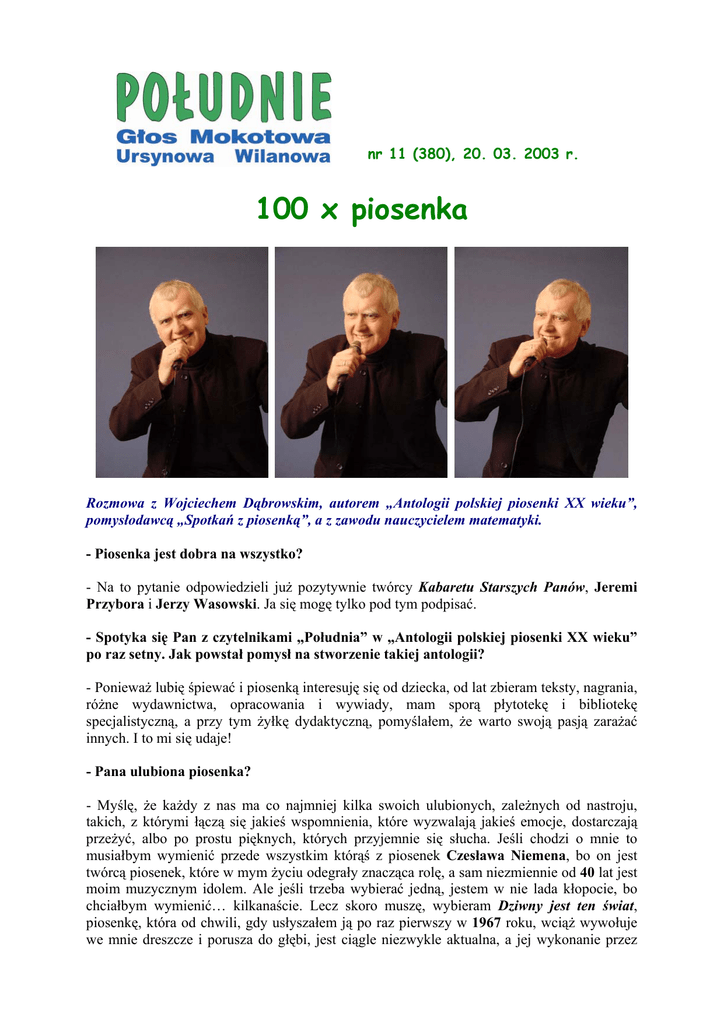 nr 11 (380), 20. 03. 2003 r. 100 x piosenka Rozmowa z Wojciechem Dąbrowskim, autorem „Antologii polskiej piosenki XX wieku”, pomysłodawcą „Spotkań z piosenką”, a z zawodu nauczycielem matematyki. - Piosenka jest dobra na wszystko? - Na to pytanie odpowiedzieli już pozytywnie twórcy Kabaretu Starszych Panów, Jeremi Przybora i Jerzy Wasowski. Ja się mogę tylko pod tym podpisać. - Spotyka się Pan z czytelnikami „Południa” w „Antologii polskiej piosenki XX wieku” po raz setny. Jak powstał pomysł na stworzenie takiej antologii? - Ponieważ lubię śpiewać i piosenką interesuję się od dziecka, od lat zbieram teksty, nagrania, różne wydawnictwa, opracowania i wywiady, mam sporą płytotekę i bibliotekę specjalistyczną, a przy tym żyłkę dydaktyczną, pomyślałem, że warto swoją pasją zarażać innych. I to mi się udaje! - Pana ulubiona piosenka? - Myślę, że każdy z nas ma co najmniej kilka swoich ulubionych, zależnych od nastroju, takich, z którymi łączą się jakieś wspomnienia, które wyzwalają jakieś emocje, dostarczają przeżyć, albo po prostu pięknych, których przyjemnie się słucha. Jeśli chodzi o mnie to musiałbym wymienić przede wszystkim którąś z piosenek Czesława Niemena, bo on jest twórcą piosenek, które w mym życiu odegrały znacząca rolę, a sam niezmiennie od 40 lat jest moim muzycznym idolem. Ale jeśli trzeba wybierać jedną, jestem w nie lada kłopocie, bo chciałbym wymienić… kilkanaście. Lecz skoro muszę, wybieram Dziwny jest ten świat, piosenkę, która od chwili, gdy usłyszałem ją po raz pierwszy w 1967 roku, wciąż wywołuje we mnie dreszcze i porusza do głębi, jest ciągle niezwykle aktualna, a jej wykonanie przez Niemena jest dla mnie niedościgłym wzorem. Lubię piosenki niebanalne, z poetyckimi tekstami i nietuzinkową melodią, więc musiałbym jeszcze wymienić kilka piosenek z tekstami Agnieszki Osieckiej i Jonasza Kofty, kompozycji Włodzimierza Korcza i Seweryna Krajewskiego, piosenek z repertuaru Ewy Demarczyk, Łucji Prus, Edyty Geppert, Alicji Majewskiej. Fascynuje mnie okres dwudziestolecia międzywojennego, więc przyznaję, że bardzo lubię wiele piosenek z tamtego okresu. Ale nie stronię wcale od piosenek rockowych i nowych gatunków, a wśród utworów młodszej generacji mam również swoich faworytów (np. zespół Maanam, Grzegorz Ciechowski, Edyta Bartosiewicz). - Duże zróżnicowanie stylowe ... - Każdemu z nas podoba się coś innego, panuje ogromna różnorodność gustów, i każdy ma prawo do wyboru własnego zestawu ulubionych piosenek. Potwierdza to fakt, że w naszym plebiscycie na ulubioną piosenkę XX wieku, każda ze stu proponowanych piosenek znalazła swoich zwolenników, a tylko jedna osoba wybrała akurat 5 piosenek, które cieszą się największą popularnością i znalazły się w programie jubileuszowego koncertu. I bardzo dobrze! Powinniśmy szanować każdy wybór i okazywać się bardziej tolerancyjni dla innych. Dotyczy to także mediów, które usiłują narzucać obowiązująca modę i uparcie lansują tylko niektóre piosenki i niektórych wykonawców. Dlatego ja na swoich Spotkaniach z piosenką dbam o różnorodność repertuaru, aby każdy znalazł coś ulubionego dla siebie. - Dlaczego zajmuje się Pan akurat polską piosenką? - Bo przywiązuję ogromną wagę do tekstu piosenki i do jej interpretacji. Sam muszę czuć i rozumieć o co w piosence chodzi, co przy obcojęzycznym tekście nie zawsze jest możliwe. Bo mamy wiele wspaniałych polskich piosenek. Bo mam polską duszę i z polską piosenką się utożsamiam, bo ona lepiej wyraża moje własne uczucia, pragnienia i marzenia. - Skąd u nauczyciela matematyki taka pasja? - Pytanie powinno być raczej postawione odwrotnie. Jestem humanistą, interesuję się przede wszystkim literaturą, sztuką, teatrem, poezją i muzyką, więc bardziej zasadne byłoby pytanie, skąd u humanisty zainteresowanie matematyką. Zostałem nauczycielem, bo kocham pracę z młodzieżą, a przedmiot nauczania wybrałem z młodzieńczej przekory. - Jak ocenia Pan polską piosenkę na tle europejskiej i amerykańskiej muzyki rozrywkowej? - Temat – rzeka, bardziej nadaje się na esej niż wywiad okolicznościowy. Ja bym tego w ogóle nie porównywał. I tam i u nas są piosenki dobre i złe, są artystyczne perły i zupełna tandeta. Inny jest odbiorca i mimo wszechogarniającej globalizacji jest miejsce dla polskiej specyfiki, innych potrzeb i innej wrażliwości słuchacza. Generalnie nie mamy się czego wstydzić. - W swej antologii skupił się Pan na piosence dwudziestowiecznej. Co z wiekiem XXI? - Sam jestem już w wieku, w którym coraz chętniej wraca się do wspomnień. Dlatego z nostalgią sięgam po stare przeboje. I chcę je… ocalić od zapomnienia. A bywalcy moich Spotkań z piosenką najwyraźniej wracają do nich z przyjemnością. Wiek XX jest już zamkniętą historią. I ta historia mnie pasjonuje. A śledzenie bieżących list przebojów XXI wieku pozostawiam młodszemu pokoleniu. - Podobno ma Pan w planach wydanie antologii w formie książkowej? - Tak. Polskie Wydawnictwo Muzyczne zainteresowało się tym projektem. Jestem już po wstępnych rozmowach. Ale sprawa jest skomplikowana, bo wiąże się z prawami autorskimi. A antologia powinna być reprezentatywna. - Co myśli Pan o programach takich jak Idol czy Droga do gwiazd? Czy pomoże to w wykreowaniu mody na polską piosenkę? - Niestety, nie! W tych programach dominują piosenki zachodnie, upowszechnia się styl gwiazdorstwa w zachodnim stylu, lansuje - jako wzór - dążenie do kariery w komercyjnym znaczeniu. Mnie chodzi zupełnie o coś innego. Moje Spotkania z piosenką nie są przeznaczone dla tych, co marzą o estradowej karierze. Chcę propagować zanikającą formę spędzania wolnego czasu: wspólne muzykowanie i śpiewanie. Chodzi o czerpanie przyjemności z samego faktu śpiewania. Dlatego pomysł chwycił. Lu