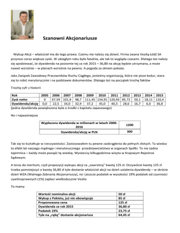 Szanowni Akcjonariusze Wykup Akcji – właściciel ma do tego prawo. Czemu nie należy się dziwić. Firma zwana Veolią Łódź SA przynosi coraz większe zyski. W ubiegłym roku było fatalnie, ale tak to wygląda czasami. Dlatego też należy się spodziewać, że dywidenda na poziomie tej za rok 2015 – 36,80 na akcję będzie utrzymana, a może nawet wzrośnie – w planach wzrośnie na pewno. A pogoda za oknem pokaże. Jako Związek Zawodowy Pracowników Ruchu Ciągłego, jesteśmy organizacją, która nie pisze bzdur, stara się to robić merytorycznie i na podstawie dokumentów. Dlatego też na początek trochę faktów Trochę cyfr z historii Rok 2005 2006 2007 2008 2009 2010 2011 2012 2013 2014 2015 Zysk netto 0 67,59 101,9 98,7 111,45 134,91 120,93 85,72 50,1 18,11 110,4 Dywidenda/akcję 0,0 22,5 34,0 32,9 37,2 45,0 40,3 28,6 16,7 6,0 36,8 (jedna dywidenda powiększona była o środki z kapitału zapasowego) No i najważniejsze Wypłacona dywidenda w milionach w latach 2006‐ 2016 1200 Dywidenda/akcję w PLN 300 Tak się to kształtuje w rzeczywistości. Zastosowałem tu pewne zaokrąglenia do pełnych złotych. Ta wiedza to efekt lat naszego mądrego i merytorycznego przedstawicielstwa w organach Spółki. To nie żadna tajemnica – każdy może posiąść tę wiedzę. Wystarczy kilkugodzinna wizyta w Krajowym Rejestrze Sądowym. A teraz do meritum, czyli propozycji wykupu akcji za „zawrotną” kwotę 125 zł. Oczywiście kwotę 125 zł trzeba pomniejszyć o kwotę 36,80 zł tyle dostanie właściciel akcji na dzień ustalenia dywidendy – w skrócie dzień WZA (Walnego Zebrania Akcjonariuszy), no i jeszcze podatek w wysokości 19% podatek od czynności cywilnoprawnych (1%) zapłaci wielkodusznie Veolia To mamy Wartość nominalna akcji Wykup z Pakietu, już nie obowiązuje Proponowana cena Dywidenda za rok 2015 Podatek 19% Tyle na „rękę” dostanie akcjonariusz 50 zł 85 zł 125 zł 36,80 zł 23,75 zł 64,45 zł Podsumowując; 1. Nie mam nic przeciwko temu, że akcjonariusz chce skupić akcję – ma do tego prawo. Robi to rozsądniej niż poprzednio. Poprzednio robiła to kancelaria prawna okłamując pracowników, że niedługo dywidendy nie będzie i naruszając ustawę o ochronie danych osobowych. Teraz robi to Spółka, która ma dostęp do danych i z nich korzysta. 2. Ale mam bardzo dużo przeciwko temu, że Spółka, czy też właściciel traktuje mnie jak idiotę i przedstawia mi propozycję. Która dla mnie jest, delikatnie mówiąc, mało interesująca. Wnioski Moim zdaniem, każdy kto sprzeda akcję postąpi mało rozważnie. Za lata ciężkiej pracy już otrzymałem 300 zł na jedną akcję a do końca moich dni, myślę że to jeszcze długo, otrzymam kilka razy więcej. Jeżeli właściciel chce, to zapraszam go do przeprowadzenia procedury przymusowego wykupu – na dzień dzisiejszy tego nie może zrobić. Poza tym kilka lat temu jeden z akcjonariuszy (Wiesław Koc) nie zgodził się z krzywdzącymi, akcjonariuszy mniejszościowych, zapisami Statutu. Zaskarżył ten zapis w Sądzie Gospodarczym i w efekcie porozumienia, na dzień dzisiejszy akcjonariusze mogą dowolnie obracać akcjami pomiędzy sobą. Od pewnego czasu istnieje rynek akcji, mały, bo kto rozsądny pozbywa się kury znoszącej złote jajka. Na tym rynku cena bywała różna było i 200 zł za akcję teraz się mówi o 150‐160 zł za akcję. Dlatego też namawiam wszystkich akcjonariuszy do poważnego przemyślenia propozycji i wybrania rozsądnej decyzji. Jesteśmy w Polsce jedyną firmą energetyczną, która w rękach pracowników, byłych pracowników i spadkobierców, lub następców – w skrócie tych co skorzystali z 15% darmowych akcji (jakich darmowych – to wynik wieloletniej i ciężkiej pracy) I nadal tę palmę pierwszeństwa dzierżymy. Blisko 8% akcji jest w rękach pracowników i byłych pracowników, spadkobierców et cetera …. Może tak zamiast pozbawiać się swoich pieniędzy zostawimy je sobie – ja na pewno akcji nie sprzedam. Tak to wygląda teraz, dywidenda za rok 2015. Liczba akcji 9 17 33 49 65 89 113 130 146 162 Wysokość dywidendy na jedną akcję 36,8 36,8 36,8 36,8 36,8 36,8 36,8 36,8 36,8 36,8 Kwota dywidendy ne "rękę" 268,272 506,736 983,664 1460,592 1937,52 2652,912 3368,304 3875,04 4351,968 4828,896 Dobrowolny wykup akcji w Veolia Energia Łódź S.A. Nawiązując do listu przesłanego akcjonariuszom mniejszościowym Veolia Energia Łódź S.A. przesyłamy uzupełnienie tej informacji opierając się na przykładach spółek z sektora energetyki notowanych na Giełdzie Papierów Wartościowych w Warszawie. Dla przykładu średnią stopę dywidend na przestrzeni 6 lat wypłacanych ze spółek zgrupowanych w indeksie WIG‐ENERGIA(1) (indeks grupujący spółki z sektora energetycznego) przedstawia poniższy wykres. Przyjmując średnioroczną sektorową stopę dywidendy na poziomie 6% i zestawiając to z średnioroczną dywidendę wypłacaną przez Veolia Energia Łódź 35,57 zł(2), oraz ceną akcji proponowaną przez Veolia Energia Polska czyli 125 zł można wywnioskować następujące tezy: 1. proponowana cena akcji jest mocno zaniżona, powinna wynosić około 593 zł. (35,57zł średnioroczna dywidenda/6%) 2. sprzedając akcje po proponowanej cenie czyli 125 zł pozbawiamy się średniorocznego przychodu na poziomie 28% (28% jest wartością odnoszącą się do proponowanej ceny zakupu akcji 125 zł)(ciężko będzie znaleźć inwestycję charakteryzującą się tak wysokimi zyskiem, oraz niskim poziomem ryzyka inwestycyjnego) Pozdrawiam życzę przemyślanych decyzji