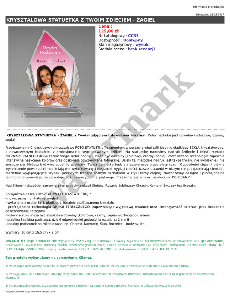 Informacje o produkcie Utworzono 02-03-2017 KRYSZTAŁOWA STATUETKA Z TWOIM ZDJĘCIEM - ŻAGIEL Cena : 125,00 zł er m ar k Nr katalogowy : CC33 Dostępność : Dostępny Stan magazynowy : wysoki Średnia ocena : brak recenzji KRYSZTAŁOWA STATUETKA - ŻAGIEL z Twoim zdjęciem i dowolnym tekstem. Kolor nadruku jest dowolny (kolorowy, czarny, sepia). at Przedstawiamy Ci ekskluzywne kryształowe FOTO-STATUETKI. To upominek w postaci grubej tafli idealnie gładkiego SZKŁA kryształowego, o nowoczesnym kształcie, z profesjonalnie wypracowanym szlifem. Na statuetkę nanosimy nadruk (zdjęcie i tekst) metodą NIEZNISZCZALNEGO druku termicznego. Kolor nadruku może być dowolny (kolorowy, czarny, sepia). Zastosowana technologia zapewnia intensywne nasycenie kolorów oraz doskonale odwzorowaną fotografię. Dzięki tej metodzie nadruk jest także trwały, nie wyblaknie i nie zniszczy się, Możesz być więc zupełnie spokojny Twoja pamiątka będzie cieszyła oczy przez długi czas ! Odpowiedni ciężar i piękne wykończenie powierzchni dopełniają ten wyrafinowany i elegancki wygląd całości. Nasze statuetki w niczym nie przypominają cienkich, tandetnie wyglądających szybek, pokrytych transparentnym nadrukiem w stylu farby olejnej. Nowoczesny designe i profesjonalna technologia sprawiają, że powstaje coś niewiarygodnie pięknego. Przekonaj się o tym serdecznie POLECAMY ! Nasi Klienci najczęściej zamawiają ten produkt z okazji Ślubów, Rocznic, Jubileuszy Chrzcin, Komunii Św., czy też Urodzin. w Co wyróżnia naszą KRYSZTAŁOWĄ FOTO-STATUETKĘ ? - nowoczesny i unikatowy wygląd - wykonana z grubej tafli, gładkiego, idealnie oszlifowanego kryształu - profesjonalna technologia DRUKU TERMICZNEGO, zapewniająca wyjątkową trwałość oraz intensywność kolorów, przy doskonale odwzorowanej fotografii - kolor nadruku może być absolutnie dowolny (kolorowy, czarny, sepia) wg Twojego uznania - stabilna i solidna podstawa, dzięki odpowiedniej grubości kryształu aż 2 cm !!! - idealny podarunek na różne okazje, np. Chrzest, Komunię, Ślub, Rocznicę, Urodziny, itp. Wymiary: 10 cm x 16,5 cm x 2 cm UWAGA !!! Tego produktu NIE wysyłamy Przesyłką Pobraniową. Towary wykonane na indywidualne zamówienie tzn. grawerowane, drukowane, wykonane metodą druku termicznego(sublimacji) oraz personalizowane (ze zdjęciem, imionami, nazwiskiem, datą) NIE PODLEGAJĄ ZWROTOWI i będą realizowane TYLKO I WYŁĄCZNIE po dokonaniu PRZEDPŁATY NA KONTO. Ten produkt wykonujemy na zamówienie Klienta. 1) Po zakupie oczekujemy na maila, w którym prześlesz swój tekst, zdjęcie, nr czcionki i ewentualne sugestie do wykonania nadruku. 2) W ciągu max. 48h roboczych, od daty otrzymania od Ciebie wszystkich niezbędnych informacji, otrzymasz od nas projekt graficzny do sprawdzenia i akceptacji. 3) Po akceptacji projektu, oczekujemy na wpłatę należności na podane konto bankowe. Pamiętaj o doliczeniu kosztów wysyłki. Wygenerowano w programie www.oscGold.com 4) Kiedy wpłata znajdzie się na naszym koncie przystępujemy do realizacji zamówienia. Zajmuje nam to zazwyczaj nie więcej niż 7 dni roboczych. 5) Gotowy produkt jest odpowiednio spakowany, zabezpieczony. Do przesyłki dołączamy paragon fiskalny, w celu ew. reklamacji. w at er m ar k 6) Gdy już wyślemy towar, poinformujemy Cię mail-em o dokładnej dacie wysyłki i podamy nr jej nadania.