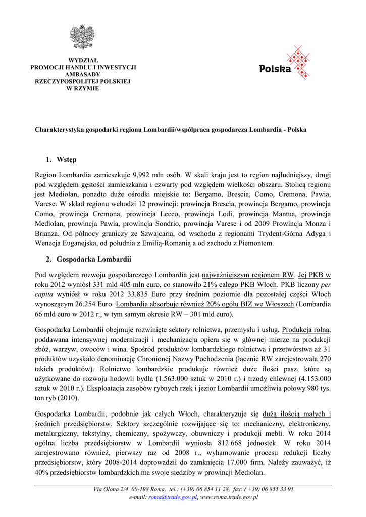 WYDZIAŁ PROMOCJI HANDLU I INWESTYCJI AMBASADY RZECZYPOSPOLITEJ POLSKIEJ W RZYMIE Charakterystyka gospodarki regionu Lombardii/współpraca gospodarcza Lombardia - Polska 1. Wstęp Region Lombardia zamieszkuje 9,992 mln osób. W skali kraju jest to region najludniejszy, drugi pod względem gęstości zamieszkania i czwarty pod względem wielkości obszaru. Stolicą regionu jest Mediolan, ponadto duże ośrodki miejskie to: Bergamo, Brescia, Como, Cremona, Pawia, Varese. W skład regionu wchodzi 12 prowincji: prowincja Brescia, prowincja Bergamo, prowincja Como, prowincja Cremona, prowincja Lecco, prowincja Lodi, prowincja Mantua, prowincja Mediolan, prowincja Pawia, prowincja Sondrio, prowincja Varese i od 2009 Prowincja Monza i Brianza. Od północy graniczy ze Szwajcarią, od wschodu z regionami Trydent-Górna Adyga i Wenecja Euganejska, od południa z Emilią-Romanią a od zachodu z Piemontem. 2. Gospodarka Lombardii Pod względem rozwoju gospodarczego Lombardia jest najważniejszym regionem RW. Jej PKB w roku 2012 wyniósł 331 mld 405 mln euro, co stanowiło 21% całego PKB Włoch. PKB liczony per capita wyniósł w roku 2012 33.835 Euro przy średnim poziomie dla pozostałej części Włoch wynoszącym 26.254 Euro. Lombardia absorbuje również 20% ogółu BIZ we Włoszech (Lombardia 66 mld euro w 2012 r., w tym samym okresie RW – 301 mld euro). Gospodarka Lombardii obejmuje rozwinięte sektory rolnictwa, przemysłu i usług. Produkcja rolna, poddawana intensywnej modernizacji i mechanizacja opiera się w głównej mierze na produkcji zbóż, warzyw, owoców i wina. Spośród produktów lombardzkiego rolnictwa i przetwórstwa aż 31 produktów uzyskało denominację Chronionej Nazwy Pochodzenia (łącznie RW zarejestrowała 270 takich produktów). Rolnictwo lombardzkie produkuje również duże ilości pasz, które są użytkowane do rozwoju hodowli bydła (1.563.000 sztuk w 2010 r.) i trzody chlewnej (4.153.000 sztuk w 2010 r.). Eksploatacja zasobów rybnych rzek i jezior Lombardii umożliwia połowy 980 tys. ton ryb (2010). Gospodarka Lombardii, podobnie jak całych Włoch, charakteryzuje się dużą ilością małych i średnich przedsiębiorstw. Sektory szczególnie rozwijające się to: mechaniczny, elektroniczny, metalurgiczny, tekstylny, chemiczny, spożywczy, obuwniczy i produkcji mebli. W roku 2014 ogólna liczba przedsiębiorstw w Lombardii wyniosła 812.668 jednostek. W roku 2014 zarejestrowano również, pierwszy raz od 2008 r., wyhamowanie procesu redukcji liczby przedsiębiorstw, który 2008-2014 doprowadził do zamknięcia 17.000 firm. Należy zauważyć, iż 40% przedsiębiorstw lombardzkich ma swoje siedziby w prowincji Mediolan. Via Olona 2/4 00-198 Roma, tel.: (+39) 06 854 11 28, fax: ( +39) 06 855 33 91 e-mail: [email protected], www.roma.trade.gov.pl PRZEDSIĘBIORSTWA LOMBARDZKIE VS. CAŁA GOSPODARKA ________________________________________________________________________________ LOMBARDIA WŁOCHY UDZIAŁ% 814.297 5.186.124 15,7 31.12.2013 31,4 26,9 18,3 31.12.2013 6,0 15,0 6,3 31.12.2013 - produkcja przemysłowa (%) 12,4 9,9 19,7 31.12.2013 - sektor budowlany (%) 17,3 15,2 17,8 31.12.2013 - inny przemysł (%) 0,5 0,4 16,5 31.12.2013 - handel, usługi (%) 30,4 34,3 13,9 31.12.2013 - pośrednictwo nieruchomości, wolne zawody (%) 16,6 10,4 25,1 31.12.2013 - inne usługi (%) 16,8 14,6 18,0 31.12.2013 - spółki kapitałowe (%) 27,1 19,0 22,5 31.12.2013 - spółki osobowe (%) 19,2 16,8 18,0 31.12.2013 - samodzielna działalność gospodarcza, inne formy działalności (%) 53,6 64,2 13,1 31.12.2013 Przedsiębiorstwa zarejestrowane i działające - produkcja (%) - rolnictwo, rybactwo (%) DATA ŻRODŁO DANYCH: włoski urząd statystyczny ISTAT. ________________________________________________________________________________ Ze względu na ulokowanie w Mediolanie włoskiej giełdy papierów wartościowych oraz siedzib większości banków, sektor usług w Lombardii jest zdominowany przez usługi finansowe. Działalność sektora usług skupia się również w lombardzkim systemie wystawienniczym, ze szczególnym uwzględnieniem Targów Mediolańskich, które co roku, na ponad 1,5 mln m2 goszczą 30.000 wystawców i 5 milionów odwiedzających. Rozwój sektora usług znajduje również swój wyraz w istniejącej w regionie Lombardia największej we Włoszech sieci sprzedaży, która liczy 213 centrów handlowych, 144 hipermarketów, 1545 supermarketów oraz 613 mniejszy punktów sprzedaży. 2 Trzeba również wskazać, iż przedsiębiorstwa lombardzkie generują 27,7% całości włoskiego eksportu, a głównymi rynkami zbytu dla produkcji lombardzkiej pozostają państwa Unii Europejskiej (54,7% całości dóbr i usług eksportowanych). ZESTAWIENIE EKSPORTU LOMBARDZKIEGO VS. CAŁA GOSPODARKA Import (x 1000 Euro) Eksport (x 1000 Euro) Saldo eksport-import (x 1.000 Euro) % Import z UE (5) % Import inne % Eksport do UE % Export inne Lombardia 110.247.683,5 108.095.820,3 -2.151.863,3 68,0 36,8 54,7 48,0 Włochy 361.002.213,3 390.232.593,1 29.230.379,8 53,5 43,0 56,1 48,3 udział % 30,5 27,7 - ROK 2013 2013 2013 2013 2013 2013 2013 ŹRÓDŁO DANYCH: włoski urząd statystyczny ISTAT. Zgodnie z danymi włoskiego Banku Narodowego, regionalna gospodarka Lombardii również odczuwa problemy związane z kryzysem. W latach 2008-2012 PKB Lombardii zmniejszyło się o 5 %. Spośród włoskich regionów jest to najlepszy wynik, który można porównać z Piemontem (-8,4%), Wenecją Euganejską (-8,1%), Emilią Romanią (-7,0%) lub Lacjum (-6,4%). W roku 2013 PKB Lombardii, zgodnie z danymi włoskiego Banku Narodowego, zmniejszył się o 1,3%. W tym samym okresie bezrobocie osiągnęło wartość 8,1%, przy średniej dal całych Włoch wynoszącej 12,2%. Przedsiębiorstwa zarejestrowane w regionie Lombardia są również największymi włoskimi inwestorami. W ogólnej liczbie 42 mld 154 mln 134 Euro włoskich BIZ (2008 r.), aż 15 mld 794 mln Euro przypadało na firmy lombardzkie, 