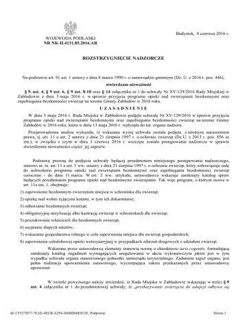 Białystok, 8 czerwca 2016 r. WOJEWODA PODLASKI NR NK-II.4131.85.2016.AR ROZSTRZYGNIĘCIE NADZORCZE Na podstawie art. 91 ust. 1 ustawy z dnia 8 marca 1990 r. o samorządzie gminnym (Dz. U. z 2016 r. poz. 446), stwierdzam nieważność § 9. ust. 4, § 9 ust. 6, § 9 ust. 8-10 oraz § 14 załącznika nr 1 do uchwały Nr XV/129/2016 Rady Miejskiej w Zabłudowie z dnia 5 maja 2016 r. w sprawie przyjęcia programu opieki nad zwierzętami bezdomnymi oraz zapobiegania bezdomności zwierząt na terenie Gminy Zabłudów w 2016 roku. UZASADNIENIE W dniu 5 maja 2016 r. Rada Miejska w Zabłudowie podjęła uchwałę Nr XV/129/2016 w sprawie przyjęcia programu opieki nad zwierzętami bezdomnymi oraz zapobiegania bezdomności zwierząt na terenie Gminy Zabłudów w 2016 roku, która w dniu 13 maja 2016 r. wpłynęła do tut. organu nadzoru. Przeprowadzona analiza wykazała, iż wskazana wyżej uchwała została podjęta z istotnym naruszeniem prawa, tj. art. 11 a ust. 2 ustawy z dnia 21 sierpnia 1997 r. o ochronie zwierząt (Dz.U. z 2013 r. poz. 856 ze zm.), w związku z czym w dniu 3 czerwca 2016 r. wszczęte zostało postępowanie nadzorcze w sprawie stwierdzenia nieważności części jej zapisów. Podstawę prawną do podjęcia uchwały będącej przedmiotem niniejszego postępowania nadzorczego, stanowi m. in. art. 11 a ust. 1 ww. ustawy z dnia 21 sierpnia 1997 r. o ochronie zwierząt, który zobowiązuje radę do uchwalenia programu opieki nad zwierzętami bezdomnymi oraz zapobiegania bezdomności zwierząt corocznie - do dnia 31 marca. W ust. 2 ww. artykułu, ustawodawca wskazuje zamknięty katalog spraw będących przedmiotem programu opieki nad bezdomnymi zwierzętami. Tak więc program, o którym mowa w art. 11a ust. 1, obejmuje: 1) zapewnienie bezdomnym zwierzętom miejsca w schronisku dla zwierząt; 2) opiekę nad wolno żyjącymi kotami, w tym ich dokarmianie; 3) odławianie bezdomnych zwierząt; 4) obligatoryjną sterylizację albo kastrację zwierząt w schroniskach dla zwierząt; 5) poszukiwanie właścicieli dla bezdomnych zwierząt; 6) usypianie ślepych miotów; 7) wskazanie gospodarstwa rolnego w celu zapewnienia miejsca dla zwierząt gospodarskich; 8) zapewnienie całodobowej opieki weterynaryjnej w przypadkach zdarzeń drogowych z udziałem zwierząt. Wskazane przez ustawodawcę elementy stanowią normę o charakterze iuris cogentis, formułującą zamknięty katalog zagadnień wymagających uregulowania w akcie wykonawczym jakim jest w tym wypadku uchwała organu stanowionego jednostki samorządu terytorialnego. Zadaniem tegoż organu, jest pełna realizacja upoważnienia ustawowego, wyczerpująca zakres przekazanych przez ustawodawcę uprawnień. W świetle powyższego należy stwierdzić, iż Rada Miejska w Zabłudowie wskazując w treści § 9 ust. 4 załącznika nr 1 do przedmiotowej uchwały, iż „przekazywanie zwierzęcia do adopcji odbywa się Id: CF527D77-7EAE-4ECB-A294-366BD68E813E. Podpisany Strona 1 nieodpłatnie bądź za zwrotem wydającemu podstawowych kosztów opieki medycznej nad zwierzęciem”, przekroczyła swoje kompetencje uchwałodawcze w zakresie tworzenia gminnych programów opieki nad zwierzętami bezdomnymi oraz zapobiegania bezdomności zwierząt. Należy zauważyć, iż ustawodawca uregulowaniami art. 11 a ust. 5 cyt. ustawy o ochronie zwierząt przesądził, iż koszty realizacji programu ponosi gmina. Poza tym kwestie wszelkich rozliczeń z tytułu złapania zwierzęcia, przekazania go do schroniska i jego utrzymania w tymże schronisku mają charakter cywilnoprawny i jako takie nie powinny być przedmiotem regulacji niniejszego programu. Dlatego też właściwe zastosowanie mają w tym przypadku przepisy ustawy z dnia 23 kwietnia 1964 r. Kodeks cywilny (Dz.U. z 2014 r. poz. 121 ze zm.), zwłaszcza odnoszące się do zwrotu nakładów koniecznych (art. 226). Materia ta, jako regulacja cywilnoprawna wykracza swą treścią poza ramy przedmiotowej uchwały. Dlatego też rozwiązanie w tym zakresie, które znalazło się w kontrolowanej uchwale, jako nie mające umocowania prawnego, musiało zostać wyeliminowane z obrotu prawnego. Mocą postanowień zawartych w § 9 ust. 6 załącznika nr 1 do uchwały, uzależniono adopcję zwierząt od przeprowadzenia przez schronisko wraz z organizacją społeczną, której statutowym celem jest ochrona zwierząt - w określonych przypadkach - wywiadu środowiskowego. Wskazać należy, iż wywiad środowiskowy polega na uzyskaniu szczegółowych informacji dotyczących danej osoby lub rodziny, stosunków osobistych i majątkowych tych osób, ich trybu życia i stanu zdrowia. Przeprowadza się go w sprawach dotyczących przyznania pomocy społecznej, w postępowaniu w sprawach rodzinnych i opiekuńczych oraz w sprawach karnych. Przepisy prawa powszechnie obowiązującego nie dają natomiast uprawnienia do przeprowadzenia wywiadu środowiskowego związanego z adopcją zwierzęcia. Powyższe stanowi zatem przekroczenie kompetencji uchwałodawczych Rady Miejskiej w Zabłudowie. W tym miejscu pragnę zwrócić uwagę na pogląd, ugruntowany w doktrynie jak również w orzecznictwie sądowo-administracyjnym, iż wykładnia norm o charakterze kompetencyjnym powinna być interpretowana w sposób ścisły i literalny. Jednocześnie zakazuje się dokonywania wykładni rozszerzającej oraz wyprowadzania kompetencji w drodze analogii (vide: wyrok Trybunału Konstytucyjnego z dnia 28 czerwca 2000 r., K25/99, OTK 2000/5/141). W treści postanowień wynikających z § 9 ust. 8-10 załącznika nr 1 do uchwały, Rada Miejska w Zabłudowie szczegółowo odniosła się do treści zapisów jakie winny znaleźć się w umowie adopcyjnej zwierząt. W ocenie tut. organu nadzoru, organ stanowiący gminy Zabłudów w tym przypadku również przekroczył swoje kompetencje uchwałodawcze, bowiem powyżej analizowana materia, przez ustawodawcę przekazana została do uregulowania organowi wykonawczemu gminy. Powyższe działanie rady stan