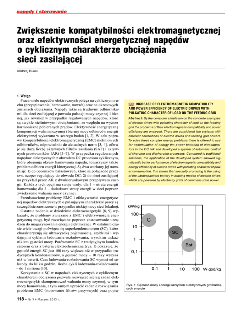 Zwiększenie kompatybilności elektromagnetycznej oraz efektywności energetycznej napędów o cyklicznym charakterze obciążenia sieci zasilającej Andrzej Rusek 1. Wstęp Praca wielu napędów elektrycznych polega na cyklicznym ruchu (przyspieszanie, hamowanie, nawrót) oraz na okresowych zmianach obciążenia. Napędy takie są trudnymi odbiornikami dla sieci zasilającej z powodu pulsacji mocy czynnej i biernej, jak również w przypadku regulowanych napędów, które są zwykle nieliniowymi obciążeniami, ze względu na wyższe harmoniczne pobieranych prądów. Efektywność energetyczną kompensacji wahania czynnej i biernej mocy odbiorców energii elektrycznej wykazano w szeregu badań [1, 2]. W celu poprawy kompatybilności elektromagnetycznej (EMC) nieliniowych odbiorników, odpowiednio do aktualnych norm [3, 4], oferuje się dużą liczbę aktywnych filtrów zasilania (SAF) i aktywnych prostowników (AR) [5–7]. W przypadku regulowanych napędów elektrycznych z obwodem DC procesom cyklicznym, które obejmują okresy hamowania napędu, towarzyszy także problem odbioru energii kinetycznej. Są dwa warianty jej transmisji: 1) do oporników balastowych, które są połączone przez tzw. czoper regulujący do obwodu DC; 2) do sieci zasilającej na przykład przez AR z dwukierunkowym przepływem energii. Każda z tych opcji ma swoje wady: dla 1 – utrata energii hamowania; dla 2 – dodatkowe straty energii w sieci poprzez zwiększenie wahania mocy czynnej. Przedstawione problemy EMC i efektywności energetycznej napędów elektrycznych o pulsującym charakterze pracy są szczególnie zaostrzone w przypadku niskiej mocy sieci lokalnej. Ostatnie badania w dziedzinie elektroenergetyki [8, 9] wykazały, że problemy związane z EMC i efektywnością energetyczną mogą być rozwiązane poprzez zastosowanie urządzeń do magazynowania energii elektrycznej. W ostatnim czasie wiele uwagi poświęca się superkondensatorom (SC), które charakteryzują się ultrawysoką pojemnością, szybkimi i wydajnymi cyklami ładowania-rozładowania, wysokim wskaźnikiem gęstości mocy. Porównanie SC z tradycyjnym kondensatorem oraz z baterią elektrochemiczną (rys. 1) pokazuje, że gęstość energii SC jest 100 razy większa niż w przypadku tradycyjnych kondensatorów, a gęstość mocy – 10 razy wyższa niż w baterii. Czas ładowania-rozładowania SC wynosi od sekundy do kilku godzin, liczba cykli ładowania-rozładowania – do 1 miliona [10]. Korzystanie z SC w napędach elektrycznych z cyklicznym charakterem obciążenia pozwala rozwiązać szereg zadań elektroenergetyki: skompensować wahania mocy czynnej, w tym mocy hamowania, a tym samym uprościć zadanie rozwiązania problemu EMC (stosowanie filtrów pasywnych) oraz popra- 118 l Nr 3 l Marzec 2013 r. INCREASE OF ELECTROMAGNETIC COMPATIBILITY AND POWER EFFICIENCY OF ELECTRIC DRIVES WITH PULSATING CHARACTER OF LOAD ON THE FEEDING GRID Abstract: By the computer simulation on the concrete examples of electric drives with pulsating character of load on the feeding grid the problems of their electromagnetic compatibility and power efficiency are analyzed. There are considered two systems with different correlations of electric drives and feeding grid powers. To solve these complex energy problems there is offered to use for accumulation of energy the power batteries of ultracapacitors in the DC link and developed a system of automatic control of charging and discharging processes. Compared to traditional solutions, the application of the developed system showed significantly better performance of electromagnetic compatibility and energy efficiency of electric drives with pulsating character of power consumption. It is shown that specially promising is the using of the ultracapacitors battery in braking modes of electric drives, which are powered by electricity grids of commensurate power. Rys. 1. Gęstość mocy i energii urządzeń elektrycznych gromadzących energię reklama wić efektywność energetyczną układu sieć elektryczna – napęd elektryczny; umożliwić pracę napędów elektrycznych z żądaną dynamiką i porównywalną mocą przy zasilaniu z sieci lokalnych. Celem niniejszego badania jest określenie przebiegu pracy za pomocą modeli komputerowych oraz otrzymanie charakterystyk energetycznych napędu elektrycznego o cyklicznym charakterze obciążenia przy stosowaniu SC i zasilaniu z lokalnych sieci elektrycznych. 2. Opis podstawowego układu napędowego oraz jego modelu komputerowego Zostanie zbadany układ regulowanego napędu elektrycznego (rys. 2) o dwóch konfiguracjach: a) tradycyjny napęd z przesyłem elektrycznej energii hamowania do opornika balastowego R przez tranzystorowy czoper VT w obwodzie DC; b) napęd z przekształtnikiem DC-DC i baterią SC. Metodą badania jest symulacja komputerowa w programie MATLAB/Simulink. Jeżeli moc elektryczna Pz(t) pobierana przez napęd (rys. 3) ma charakter cykliczny z okresem powtarzania T, to średnia wartość mocy w tym okresie jest równa Rozwiązując równanie Pz(t) = Pz.ser , znajduje się wartości czasu t1 i t2, które ograniczają okres, gdy moc pobierana przekracza średnią wartość, i dla których można obliczyć ilość energii cyrkulującą w napędzie elektrycznym, określoną przez zmienny składnik mocy (1) Aby ocenić stopień wahań mocy pobieranej przez napęd, wprowadza się parametr λ = Pz.m / Pz.max , którego wartość może wynosić od 0 do 1. W celu uproszczenia symulacji zakłada się sinusoidalny charakter poboru mocy zasilania przez napęd, z czego wynika (2) Równanie (2) jest zrealizowane w modelu komputerowym jako idealne źródło mocy, pobieranej lub przenoszonej do obwodu DC z rzeczywistą wartością napięcia. Aby ocenić wpływ stopnia wahania mocy λ na wskaźniki energetyczne układu sieć elektryczna – napęd, przeprowadzono serię eksperymentów komputerowych dla dwóch wariantów układu, które różnią się stałą 