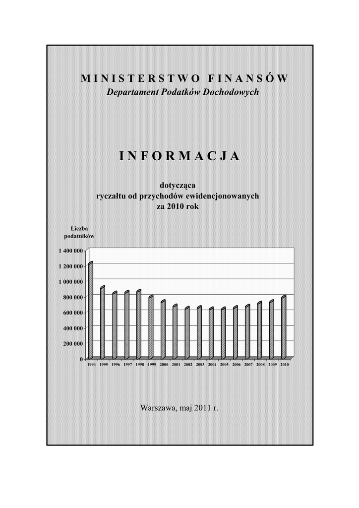 MINISTERSTWO FINANSÓW Departament Podatków Dochodowych INFORMACJA dotycząca ryczałtu od przychodów ewidencjonowanych za 2010 rok Liczba podatników 1 400 000 1 200 000 1 000 000 800 000 600 000 400 000 200 000 0 1994 1995 1996 1997 1998 1999 2000 2001 2002 2003 2004 2005 2006 2007 2008 2009 2010 Warszawa, maj 2011 r. I. Wstęp Ryczałt od przychodów ewidencjonowanych stanowi uproszczoną formę opłacania podatku dochodowego od osób fizycznych. Ma charakter fakultatywny. Podatnik, spełniający ustawowe warunki zamiast opłacać podatek na zasadach ogólnych moŜe wybrać tą formę opodatkowania podatkiem dochodowym. Inną uproszczoną formą opodatkowania jest karta podatkowa. W przypadku spółki wyboru formy opodatkowania muszą dokonać wszyscy wspólnicy. Opodatkowaniu ryczałtem od przychodów ewidencjonowanych podlegają przychody osób fizycznych: - z pozarolniczej działalności gospodarczej, w tym równieŜ, gdy działalność ta jest prowadzona w formie spółki cywilnej osób fizycznych lub spółki jawnej osób fizycznych, - z tytułu umowy najmu, podnajmu, dzierŜawy, poddzierŜawy lub innych umów o podobnym charakterze, jeŜeli te umowy nie są zawierane w ramach prowadzonej pozarolniczej działalności gospodarczej. Ryczałt od przychodów ewidencjonowanych z pozarolniczej działalności gospodarczej płacą podatnicy jeŜeli: - rozpoczną prowadzenie działalności w roku podatkowym i wybiorą tę formę opodatkowania, nie korzystają z opodatkowania w formie karty podatkowej – bez względu na wysokość przychodów, - jeŜeli juŜ prowadzili działalność w poprzednim roku, a ich przychód z tej działalności nie przekroczył określonej ustawowo kwoty. W 2010 roku podatek w tej formie mogli płacić podatnicy, którzy w 2009 roku: - uzyskali przychody z działalności, prowadzonej wyłącznie samodzielnie, w wysokości nieprzekraczającej 150 000 euro (633 420 zł), lub - uzyskali przychody wyłącznie z działalności prowadzonej w formie spółki, a suma przychodów wspólników spółki z tej działalności nie przekroczyła kwoty 150 000 euro (633 420 zł). Opodatkowania w formie ryczałtu od przychodów ewidencjonowanych nie stosuje się do podatników osiągających w całości lub w części przychody m. in. z tytułu prowadzenia aptek, działalności w zakresie kupna i sprzedaŜy wartości dewizowych, działalności w zakresie handlu częściami i akcesoriami do pojazdów mechanicznych. 2 Przychody osób fizycznych z tytułu umowy najmu, podnajmu, dzierŜawy, poddzierŜawy lub innych umów o podobnym charakterze podlegają opodatkowaniu w formie ryczałtu od przychodów ewidencjonowanych równieŜ, jeŜeli są osiągane przez osoby prowadzące działalność gospodarczą, a umowa nie jest zawarta w ramach prowadzonej działalności gospodarczej. Przychodów opodatkowanych ryczałtem nie łączy się z innymi przychodami podlegającymi opodatkowaniu podatkiem dochodowym. Stawki ryczałtu w 2010 roku wynosiły: • 20% - dla przychodów osiąganych w zakresie wolnych zawodów, • 17% - dla przychodów ze świadczenia niektórych usług niematerialnych, • 10% - dla przychodów z odpłatnego zbycia praw majątkowych lub nieruchomości wykorzystywanych w pozarolniczej działalności gospodarczej, • 8,5% - dla przychodów osiąganych: - z działalności usługowej, w tym z działalności gastronomicznej w zakresie sprzedaŜy napojów o zawartości alkoholu powyŜej 1,5%, - z tytułu umowy najmu, podnajmu, dzierŜawy, poddzierŜawy lub innych umów o podobnym charakterze, • 5,5% - dla przychodów z działalności wytwórczej, robót budowlanych, • 3,0% - dla przychodów osiąganych: - z działalności gastronomicznej, z wyjątkiem przychodów ze sprzedaŜy napojów o zawartości alkoholu powyŜej 1,5%, - z działalności usługowej w zakresie handlu. Podstawę opodatkowania ryczałtem stanowi przychód bez pomniejszania o koszty jego uzyskania. Podatnicy korzystający z podatkowania w formie ryczałtu obowiązani są do prowadzenia ewidencji przychodów. Obowiązku prowadzenia ewidencji nie mają podatnicy, którzy osiągają przychody z tytułu umowy najmu, podnajmu, dzierŜawy, poddzierŜawy lub innych umów o podobnym charakterze, a wysokość osiąganych przychodów wynika z umowy. W przypadku nieprowadzenia ewidencji lub prowadzenia jej niezgodnie z warunkami wymaganymi do uznania jej za dowód w postępowaniu podatkowym, organ podatkowy określa wartość niezaewidencjonowanego przychodu i oblicza 3 od tej kwoty ryczałt przy zastosowaniu stawki, stanowiącej pięciokrotność stawki, która byłaby zastosowana w przypadku jego ewidencjonowania. Podatnicy korzystający z opodatkowania w formie ryczałtu ewidencjonowanego mają prawo do niektórych odliczeń od przychodu, jak równieŜ odliczeń od ryczałtu. II. Liczba podatników W 2010 roku ryczałt od przychodów ewidencjonowanych płaciło ogółem 791 089 podatników, tj. o 58 329 podatników więcej niŜ w 2009 roku, z tego: 547 692 podatników osiągających przychody z pozarolniczej działalności gospodarczej (542 005 podatników w roku 2009), 243 397 podatników osiągających przychody wyłącznie z tytułu umowy najmu, podnajmu, dzierŜawy, poddzierŜawy lub innych umów o podobnym charakterze (190 755 podatników w roku 2009). Przychody z tytułu umowy najmu, podnajmu, dzierŜawy, poddzierŜawy lub innych umów o podobnym charakterze podlegają opodatkowaniu ryczałtem od przychodów ewidencjonowanych od 2003 roku, a od roku 2004 równieŜ wówczas gdy osiągane są przez osoby fizyczne prowadzące pozarolniczą działalność gospodarczą, jeŜeli umowa nie została zawarta w ramach prowadzonej działalności gospodarczej. Liczba podatników uzyskujących przychody wyłącznie z tytułu umowy najmu, podnajmu, dzierŜawy, poddzierŜawy lub innych umów o podobnym charakterze z roku na rok wzrasta. Wzrost zainteresowania tą formą opodatkowania przychodów w porównaniu do roku