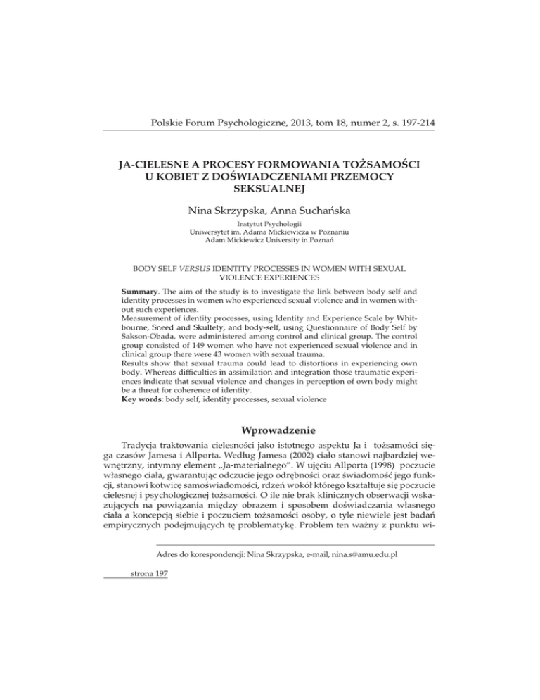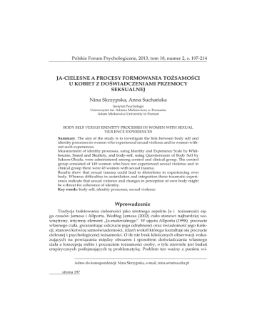 Polskie Forum Psychologiczne, 2013, tom 18, numer 2, s. 197-214 Ȭȱȱȱȱ gȱ ȱȱȱgȱȱ SEKSUALNEJ ȱ£¢ǰȱȱÚ Instytut Psychologii Uniwersytet im. Adama Mickiewicza w Poznaniu ȱ £ȱ¢ȱȱ£Ú BODY SELF ȱIDENTITY PROCESSES IN WOMEN WITH SEXUAL VIOLENCE EXPERIENCES Summary. The aim of the study is to investigate the link between body self and identity processes in women who experienced sexual violence and in women without such experiences. Measurement of identity processes, using Identity and Experience Scale by Whitbourne, Sneed and Skultety, and body-self, using Questionnaire of Body Self by Sakson-Obada, were administered among control and clinical group. The control group consisted of 149 women who have not experienced sexual violence and in clinical group there were 43 women with sexual trauma. Results show that sexual trauma could lead to distortions in experiencing own ¢ǯȱȱĜȱȱȱȱȱȱȱ¡ences indicate that sexual violence and changes in perception of own body might be a threat for coherence of identity. Key words: body self, identity processes, sexual violence Wprowadzenie ¢ȱ ȱ ïȱ ȱ ȱ ȱ ȱ ȱ ȱ Čïȱ ¿ȱ£à ȱȱȱǯȱÙȱȱǻŘŖŖŘǼȱÙȱ ȱ£ȱ ¿£¢ǰȱ¢¢ȱȱǮȬȄǯȱȱ¿ȱȱǻŗşşŞǼȱȱ£ȱ ÙȱÙǰȱ ȱ£ȱȱ¿ïȱ£ȱï ï°ȱȱǰȱ ȱ ¿ȱï ïǰȱ£Úȱ àÙȱàȱ£Ùȱ¿ȱ£ȱ ȱȱ¢£ȱČïǯȱȱȱȱȱ£¢ȱ ȱ £¢ȱ ȱ £ȱ ¿£¢ȱ £ȱ ȱ ȱ ï £ȱ Ùȱ Ùȱȱȱȱȱ£ȱČïȱ¢ǰȱȱ¢ȱ ȱȱÚȱ ¢£¢ȱ¢ȱ¿ȱ¢¿ǯȱȱȱ Č¢ȱ£ȱȱ - Adres do korespondencji: Nina Skrzypska, e-mail, [email protected] strona 197 £ȱ ȱ £¢ȱ ȱ ïȱ £Ù ǰȱ ȱ ££àȱ ££ȱ ȱ£¢ȱàǰȱàȱï £¢Ù¢ȱ£à ȱ£¢ȱȱ棢£ȱ ȱ¢£ȱï°ǯȱȱȱ££ÚȱČ¢ȱ£ȱǯȱ ï°ȱȱ£ÙČï°ȱkonsekwencjiȱ£¢ȱȱ£¢ȱȱï £ȱ ¢£ ȱ ȱ ȱ ę¢ǯȱ ȱ ¢£Ù¢ǰȱ Čȱ £ȱ ȱ £ȱ ¢ȱ £ £¢ȱȱ£ȱę¢ȱȱ£ȱ¢ȱǻ ¢ȱ£Ùȱȱ£ ȱ ȱ¢ȱ ¢¿ ȱȱ¿ ¢ǰȱ¢ȱǼȱȱȱ£ £¢ȱ ǻ£¢ȱ ȱ ȱ ǰȱ ¢ȱ £ȱ ï Ǽȱ £ȱ ¢ȱ ǻ£¢ȱ ȱ£ȱ¢ ïǰȱïȱ ȱȱȱ¢ǰȱ ¢ȱÙ£Ǽȱǻǯȱǰȱ ǰȱŗşŝŚDzȱR££¢ÚȬïǰȱŗşşŚDzȱ ǰȱŘŖŖŚǼǯȱ¢ Ùȱ¿ ȱ ȱÙ¢ȱȱ£à ȱ ȱ ¢£ǰȱ£ȱ£¢ȱȱ ¢£ȱ Ċȱ£ȱ¢ȱ ȱę¢ǰȱàȱČȱ °ȱȱàȱ£ȱȱ£ȱ¢ȱï £ǯȱ ȱ ¢ȱ¿ȱ£¢££ǰȱČȱ¿£ȱȱ¢°ȱ£à ȱ£ȱ ÙȱïǰȱȱȱČïȱę¢ǯȱȱ £¿ȱȱ ȱ££ȱ £ȱȱȱ¢£¢ȱ££¢¿°ȱ ȱ¢ȱ£ǰȱ£ȱ£ ȱȱ¿£ȱ£ȱȱ¢ȱ£ Čȱȱ£ȱ£ £à ȱȱ ï £ȱ Ùȱ Ùȱ ǻȬǼȱ ȱ à ȱ ¢ȱ ȱ ȱ £ ȱ à ȱ ¿£¢ȱ £ȱ £ïȱ ȱ ȱ àïȱ Ùȱ ¢ǰȱ£¢ȱĵ ǯȱà ȱČï ¢ȱǻǰȱǰȱŗşşŞDzȱǰȱ Sneed, Skultety 2002). Z drugiej strony £ȱ¢ęȱ£ȱ ȱȱ£ȱ ȱ££¢ȱ¿£¢ȱȱ£ £à ȱ ȱȱǰȱàȱ£Ù¢ȱ£¢ȱ seksualnej. ¿ȱȬ ¢£ȱ ¢ȱ ï £ȱ Ùȱ ïǰȱ ȱ ȱ ǯȱȱ £¢ȱïȱÙȱ ȱȱȱ£ȱǰȱȱ ȱ ¢£ȱ £¿ǰȱ ȱ àȱ ȱ Č¢ ȱ ïȱ ȱȱ£ȱǻǰȱŘŖŖřǼǯȱȱȱȱ¿ȱȱȱ¢ȱ £ȱ ÙȱÙǰȱȱ£à ǰȱ£Ùȱȱ¢ȱǻ£ȱÙǼȱ £ȱȱ ȱ Ùȱ ¢ǯȱȱȱȱïȱȱÙȱȱ£ȱ¿ȱ ȱ ȱ £ȱ £ȱ ¿ȱ £ȱ ¿ȱ ȱ Čïǰȱ ȱ ¢Čȱ ¿ȱ ȱ£¢¿ȱȱȱ¿ȱȬȱǻ¢ȱ) (m.in. Krueger, ŘŖŖŘDzȱǰȱǰȱŘŖŖśDzȱǰȱŘŖŖŜǰȱŘŖŖŝǼǯȱ£¢ȱ¿ȱ£ïǰȱČȱȱȬȱ ȱ¿ȱÙïȱ¢£ ¢ȱï £Úȱ £Ù ȱ £ȱ Ùȱ ïȱ ȱ ¢ȱ ¢ȱ ȱ £ȱ ȱ ȱ à ǰȱǰȱ £à ȱȱ£ȱÙȱǻ ǰȱŘŖŖřǼǯ ȱČȱ ǰȱ¢ȱ ȱïȱȱȱȱ¢ȱȱ¿ȱ£à ȱȱȱǯȱÙȱȱÙȱ ȱ£ȱ ¿£¢ǰȱ¢¢ȱȱǮȬȄǯȱȱǮȬÙ£Ȅȱ ȱǮȬ Ȅȱ ȱȱȱ£ȱÙà ȱǮȬ¢£Ȅȱ ȱ££ȱȱȱȱȱȱ £¢ȱȮȱ£ ȱȱ ȱàČȱȱ Ȭ£ȱȮȱȱï £ÚȱǻǰȱŘŖŖŘǼǯȱȱȱČ¢ȱ£ȱÙà ȱ ǮȬ¢£Ȅȱ £ȱ ȱ £ȱ ȱ ȱ £ȱ ¢ ¢ȱ strona 198 ȱ ȱ £ ȱ ȱ ȱ ȱ ǻȱ ȱ ȱ ȱ£ȱČǰȱȱ¿ïȱȱ¢¢ǰȱȱČȱ£ ȱ ȱȱ àȱ ¢ȱȱȱ£Ǽȱǻ£Ȭà£ǰȱŘŖŖŞǼǯȱȱǻŗşşŞǼȱ ǰȱȱ£ £ȱȱ¢ ¢ȱ¢ȱȱ¿ȱǰȱ£ȱ ȱ ¿ȱȱ£Ùȱ£ȱ ÙȱÙǯȱȱ¿ȱȱȬȱ £¢ȱÚȱ£ÚȱÙ¢¢ȱ£ȱ ¿£ȱ£ǰȱ¢ȱ££ ¢£ȱÙȱȱïǯȱ£ȱ ÙȱÙǰȱ ȱ£ȱȱ¿ïȱ £ȱ ï ï°ȱ ȱ ǰȱ ȱ ¿ȱ ï ïǰȱ £Úȱ àÙȱ àȱ £Ùȱ ¿ȱ £ȱ ȱ ȱ ¢£ȱ Čïǯȱ ȱ ¿ȱ ȬȱȱǻŘŖŖŗǼǰȱ¿ȱȱȱȱȱï ȱǻ ¢ǰȱ ȱÙǼȱȱ ï ȱČȱàȱï £ȱȱǯȱ£¢¿ȱ £¿ȱȱȬȱ £ȱ£ȱȱ£ȱ£ Ùȱ Sakson-Obada (2009). Funkcjonalny model Ja-cielesnegoǯȱȱ¿ȱȬ¢ȱǻŘŖŖşǼȱȬȱ ȱ ¢ȱ ȱ £¢ȱ ï £ȱ Ùȱ Ùȱ ȱ £ȱ £DZȱȱ£Úǰȱȱ棢£ȱȱȱ££ȱ£ȱȱ£ȱ ȱ ȱ Ù¢ȱ Ùǯȱ ȱ £ǰȱ £ȱ ȱ ȱ ȱ ÙȱÙǰȱȬȱȱ¢ȱȱȱ ÙȱÙȱȱ ï°ȱȱ¢ȱȱïȱǻǰȱǰȱŗşşŞǼǯȱȱ£ȱȱ ȱ ȱ ȱ ï ȱ Ȭȱ Čȱ ¢ °ȱ ȱ ¿ȱ ȱ ȱȱ棢£ȱï°ȱ£ȱ¢ǯȱ¢ȱ ȱǻÙǼȱ Ȭȱ Čȱ¿ȱ£ȱ£ ȱĊà ȱ ¢ȱȱïȱȱÙ¢ȱ £ȱ à ǰȱ £ȱ £Úȱ £¢ȱ ¿ȱ ȱ ȱ ȱ Ù¢ǰȱ ££Ù¢ǰȱ ¢ȱ ¿ȱ ǰȱ £ïȱ ȱ ££ȱ £¢£¢ȱ à ȱ 棣¢ȱ ȱ ȱ £ȱ ¿ïȱ ¿ȱ ¢¢ȱ strategii radzenia sobie z nimi. Ùï°ȱ Ȭȱ ¢Čȱ ¿ȱ ȱ £Ùàȱ ȱ Ȭǰȱ àȱ ǰȱČȱ ÙȱÙȱ£ȱ¢°ȱ£ȱȱ££Ùȱȱȱ¿ȱǯȱȱ¢ȱ£¢ȱČȱȱ £°ȱȱȱ Ù¢ȱ£Úȱ¢ȱ ȱȱ£ȱ£ȱČïȱȱ DZȱ£ȱ£ȱȱ ÙȱÙǰȱȱ£à ǰȱ£ȱ ¢ȱȱïȱȱ£¿ïȱ £Úȱȱ£ȱ ČǰȱČȱÙȱ£ Ù¿Ùȱ ȱȱ££ÙȱÙȱǻȬǰȱŘŖŖşǼǯȱȱ Ȭȱ àȱ £ȱ ï £ȱ ¢£¢. Wydarzenie trauma¢£ȱ£ȱ¿ȱ£ȱ£¢ȱ¢£¢ȱ ¢£Ùȱ¢ȱ ȱ£ȱï £ȱ Ùȱïǰȱȱ £ȱ£ȱÚȱ £¢ȱ ȱ¢ȱszarze (Cole, Putman, 1992; van der Kolk, Fisler, 1995; van der Kolk, 2003). Čȱ ȱ ï ¿ȱ ¢ȱ ¿ȱ ȱ ęȱ ¢ȱ ǰȱ ¢£¢ȱ £ȱ£ǰȱàȱȱ£¢ °ȱà Čȱ°ȱ ï¢ȱ ČÚȱ ¢ȱ ȱ ȱ ¢¢£ȱ £ȱ ȱ ï £ȱ ¢ǰȱ ǯȱ ï £ȱ àȱ ǻ¢ȱ ŗşşśDzȱ ȱ ȱ ǰȱ ŗşşŜǼǯ ï°ȱ ȱ ¢ȱ £Úȱ £¢ȱ £ȱ ïȱ ȱ Ùȱ ïǯȱ ȱ£ȱȱ¢ȱ £ȱ¿ǰȱČȱ¢ȱȱȱȱ£ ¿£ȱ¢ ï°ȱ棣ȱǻȱȱȱŗşşŜDzȱ ǰȱŘŖŖŚǼǰȱȱ£ȱ ¢Čstrona 199 £ȱ£ȱ£¿ȱ£ȱïȱ ȱÙ ïȱ ȱȱ£ȱ ȱï £¢ȱ¢ ¢ȱǰȱȱ¢ȱȱĊȱ£ȱ£ȱǰȱ ȱ ȱ ȱ ȱ ȱ Čȱ ¢ ïȱ ǻǰȱ ǰȱ ǰȱ ŗşşřȱ £DZȱ ȬǰȱŘŖŖşDzȱǰȱĵǰȱŘŖŖŚǰȱ£DZ