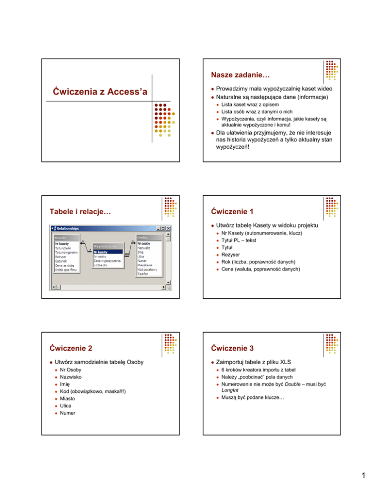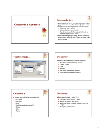 Nasze zadanie… Ćwiczenia z Access’a Prowadzimy mała wypożyczalnię kaset wideo Naturalne są następujące dane (informacje) Tabele i relacje… Dla ułatwienia przyjmujemy, że nie interesuje nas historia wypożyczeń a tylko aktualny stan wypożyczeń! Ćwiczenie 1 Utwórz tabelę Kasety w widoku projektu Ćwiczenie 2 Utwórz samodzielnie tabelę Osoby Nr Osoby Nazwisko Imię Kod (obowiązkowo, maska!!!) Miasto Ulica Numer Lista kaset wraz z opisem Lista osób wraz z danymi o nich Wypożyczenia, czyli informacja, jakie kasety są aktualnie wypożyczone i komu! Nr Kasety (autonumerowanie, klucz) Tytuł PL – tekst Tytuł Reżyser Rok (liczba, poprawność danych) Cena (waluta, poprawność danych) Ćwiczenie 3 Zaimportuj tabele z pliku XLS 6 kroków kreatora importu z tabel Należy „poobcinać” pola danych Numerowanie nie może być Double – musi być LongInt Muszą być podane klucze… 1 Ćwiczenie 4 Utwórz relacje między tabelami: Osoby, Kasety, Wypożyczenia Kasety-Wypożyczenia – relacja 1-1 Wypożyczenia to niejako przedłużenie tabeli Kasety o informacje, kto ją aktualnie wypożyczył! Osoby-Wypożyczenia – relacja 1-N Jedna osoba może wypożyczyć wiele kaset, ale kaseta może być wypożyczona w danej chwili tylko jednej osobie Ćwiczenie 6 Utwórz kwerendę usuwającą z tabeli Wypożyczenia pozycję o wybranym numerze kasety Tego typu usunięcie oznacza, że klient zwrócił kasetę i może ona zostać wypożyczona kolejnej osobie. Nie oznacz to wykasowania informacji z tablicy Kasety!!! Ćwiczenie 5 Utwórz kwerendę, która wyświetli tytuły i opisy wszystkich filmów (nazwa Opisy) Utwórz kwerendę, która wyświetli wszystkie osoby o nazwisku zaczynającym się na literę N (nazwa szkieletowa N*…) Utwórz kwerendę wyświetlającą aktualnie wypożyczone kasety i obliczającą należność za wypożyczenie Ćwiczenie 7 Utwórz formularz służący do przeglądania i modyfikowania informacji dotyczącej kaset Utwórz samodzielnie formularz umożliwiający przeglądanie i modyfikowanie bazy osób Ćwiczenie 8 Utwórz raport zawierający tytuły i opisy wszystkich filmów z bazy (wykorzystaj kwerendę Opisy) 2