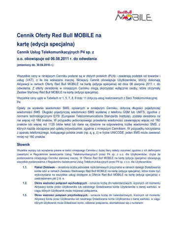 Cennik Oferty Red Bull MOBILE na kartę (edycja specjalna) Cennik Usług Telekomunikacyjnych P4 sp. z o.o. obowiązuje od 06.08.2011 r. do odwołania (zmieniony dn. 30.04.2016 r.) Wszystkie ceny w niniejszym Cenniku podane są w złotych polskich (PLN) i zawierają podatek od towarów i usług (VAT), o ile nie wskazano inaczej. Niniejszy Cennik obowiązuje Użytkowników, którzy dokonają Aktywacji w ramach Oferty Red Bull MOBILE na kartę (edycja specjalna) od dnia 06 sierpnia 2011 r. do odwołania. Z oferty określonej w niniejszym Cenniku mogą skorzystać wyłącznie osoby, które otrzymały Zestaw Startowy Red Bull MOBILE na kartę (edycja specjalna). Wszystkie ceny ujęte w Tabelach nr 1, 5, 7, 8, 9 oraz 11 dotyczą usług realizowanych z Sieci Telekomunikacyjnej P4. Opłaty za wysłanie wiadomości SMS, opisanych w niniejszym Cenniku, dotyczą długości pojedynczej wiadomości SMS. Długość pojedynczej wiadomości SMS wysłanej z telefonu GSM lub UMTS, zgodnie z normami technologicznymi ETSI (European Telecommunications Standards Institute), została określona na nie więcej niż 160 znaków. W przypadku jednorazowego przesłania wiadomości zawierającej więcej niż 160 znaków lub więcej niż 1120 bitów tekst lub dane są dzielone na odpowiednią liczbę wiadomości SMS, z których każda obciążana jest opłatą indywidualnie, zgodnie z niniejszym Cennikiem. W przypadku korzystania z aparatu telefonicznego, kodującego polskie znaki (np. ą, ę, ź) w trybie UNICODE, jeden SMS może zawierać mniej niż 160 znaków. Słownik Wszelkie wyrazy lub wyrażenia pisane w treści niniejszego Cennika z dużej litery należy rozumieć zgodnie z ich definicjami zawartymi w Regulaminie świadczenia Usług Telekomunikacyjnych przez P4 sp. z o.o. dla Użytkowników, chyba że postanowienia niniejszego Cennika stanowią inaczej. W Ofercie Red Bull MOBILE na kartę (edycja specjalna) obowiązują wszystkie postanowienia z Regulaminu świadczenia Usług Telekomunikacyjnych przez P4 sp. z o.o. dla Użytkowników. 1.1. Pakiet Złotówek – określona liczba jednostek rozliczeniowych przyznana w ramach danego Doładowania konta lub/i w ramach Zestawu Startowego Red Bull MOBILE na kartę (edycja specjalna), która może być wykorzystana na wszystkie usługi dostępne w Ofercie Red Bull MOBILE na kartę (edycja specjalna) z zastrzeżeniem pkt 2 lit. e. 1.2. Okres ważności połączeń wychodzących - oznacza liczbę dni kalendarzowych, liczonych od momentu Aktywacji konta przez Użytkownika lub ostatniego Doładowania konta Użytkownika o danej wartości, w ciągu których Użytkownik może inicjować połączenia. Okres ważności połączeń przychodzących - oznacza liczbę dni kalendarzowych, liczonych od momentu Aktywacji konta przez Użytkownika lub ostatniego Doładowania konta Użytkownika o danej wartości, w ciągu których Użytkownik może Doładować konto, odbierać połączenia, skontaktować się z numerami 1.3. alarmowymi. Ostatni dzień okresu ważności połączeń przychodzących jest jednocześnie ostatnim dniem ważności konta Użytkownika. 1.4. Kwota Doładowania i kwota zawarta w ramach Zestawu Startowego Red Bull MOBILE na kartę (edycja specjalna) – z zastrzeżeniem pkt 2 lit. a Cennika to Pakiet Złotówek do wykorzystania na wszystkie usługi opisane w Tabeli nr 1 oraz na inne usługi opisane w Tabelach nr 5, 7, 8, , 8a, 9, 11, 12, 13 i 14 niniejszego Cennika, z zastrzeżeniem pkt 2 lit. e poniżej. Korzystanie z usług dostępnych w ramach Oferty Red Bull MOBILE na kartę (edycja specjalna) pomniejsza Pakiet Złotówek. Po wykorzystaniu całej kwoty Doładowania, kwoty otrzymanej w ramach Zestawu Startowego Red Bull MOBILE na kartę (edycja specjalna) lub przekroczeniu Okresu ważności połączeń wychodzących Użytkownik, aby dalej moc wykonywać połączenia wychodzące, musi doładować swoje konto. Może jednak odbierać połączenia oraz inicjować połączenia określone w pkt 1.2 powyżej do czasu upływu Okresu ważności połączeń przychodzących. 1.5. Zestaw Startowy Red Bull MOBILE na kartę (edycja specjalna) – Zestaw Startowy opisany w tabeli nr 2 poniżej. 1. Cennik usług podstawowych w Ofercie Red Bull MOBILE na kartę (edycja specjalna) Tabela nr 1 Cennik jednostek rozliczeniowych na usługi podstawowe Lp. Usługa podstawowa Cena za usługę podstawową 1. Minuta połączenia głosowego na numery w Sieci Telekomunikacyjnej P4 i na krajowe numery stacjonarne (naliczanie sekundowe) 0,29 PLN 2. Minuta połączenia wideo na numery w Sieci Telekomunikacyjnej P4 (naliczanie sekundowe) 0,29 PLN 3. Minuta połączenia głosowego do innych krajowych sieci komórkowych (naliczanie sekundowe) 0,29 PLN 4. Minuta połączenia wideo do innych krajowych sieci komórkowych (naliczanie sekundowe) 0,29 PLN 5. SMS na numery w Sieci Telekomunikacyjnej P4 0,09 PLN 6. SMS do innych krajowych sieci komórkowych 0,09 PLN 7. MMS do wszystkich krajowych operatorów komórkowych (MMS standardowy) oraz MMS na e-mail 0,19 PLN 8. Transmisja danych na terenie Rzeczypospolitej Polskiej w zasięgu Sieci Telekomunikacyjnej P4 Bezpłatne 9. Pobieranie usług multimedialnych z portalu komórkowego wap.play.pl, www.play.pl Zgodnie z cenami usług podanymi na portalach komórkowych oraz na www.play.pl a) Opłaty podane w Tabeli nr 1 nie dotyczą połączeń na numery opisane w punktach 3, 5, 6, 7, 8, 8a i 9 niniejszego Cennika. b) Wszelkie odstępstwa od warunków zawartych w niniejszym Cenniku są możliwe tylko w ramach Ofert Promocyjnych. c) Stosowane w niniejszym Cenniku określenie „Bezpłatne” oznacza, że opłata za daną usługę jest zawarta w kwocie Doładowania konta Użytkownika lub/i w kwocie, którą Użytkownik otrzymuje w ramach Zestawu Startowego Red Bull MOBILE na kartę (edycja specjalna). d) Prędkość transmisji danych na terenie Rzeczypospolitej Polskiej w zasięgu Sieci Telekomunikacyjnej P4 wynosi do 32 kb/s. e) Po upływie ostatniego dnia wa