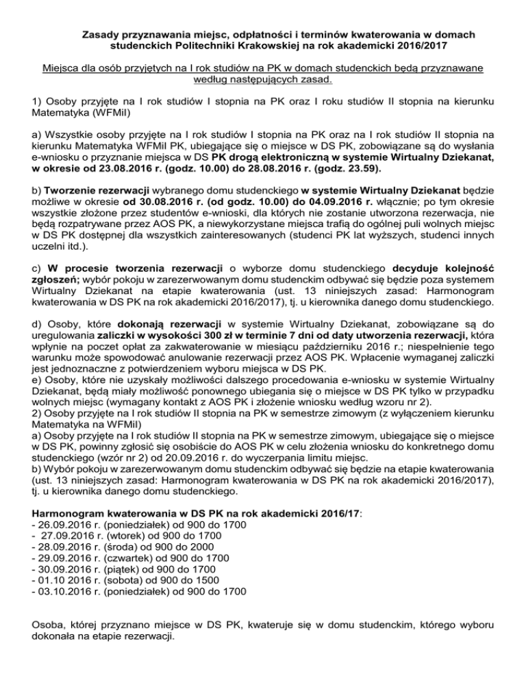Zasady przyznawania miejsc, odpłatności i terminów kwaterowania w domach studenckich Politechniki Krakowskiej na rok akademicki 2016/2017 Miejsca dla osób przyjętych na I rok studiów na PK w domach studenckich będą przyznawane według następujących zasad. 1) Osoby przyjęte na I rok studiów I stopnia na PK oraz I roku studiów II stopnia na kierunku Matematyka (WFMiI) a) Wszystkie osoby przyjęte na I rok studiów I stopnia na PK oraz na I rok studiów II stopnia na kierunku Matematyka WFMiI PK, ubiegające się o miejsce w DS PK, zobowiązane są do wysłania e-wniosku o przyznanie miejsca w DS PK drogą elektroniczną w systemie Wirtualny Dziekanat, w okresie od 23.08.2016 r. (godz. 10.00) do 28.08.2016 r. (godz. 23.59). b) Tworzenie rezerwacji wybranego domu studenckiego w systemie Wirtualny Dziekanat będzie możliwe w okresie od 30.08.2016 r. (od godz. 10.00) do 04.09.2016 r. włącznie; po tym okresie wszystkie złożone przez studentów e-wnioski, dla których nie zostanie utworzona rezerwacja, nie będą rozpatrywane przez AOS PK, a niewykorzystane miejsca trafią do ogólnej puli wolnych miejsc w DS PK dostępnej dla wszystkich zainteresowanych (studenci PK lat wyższych, studenci innych uczelni itd.). c) W procesie tworzenia rezerwacji o wyborze domu studenckiego decyduje kolejność zgłoszeń; wybór pokoju w zarezerwowanym domu studenckim odbywać się będzie poza systemem Wirtualny Dziekanat na etapie kwaterowania (ust. 13 niniejszych zasad: Harmonogram kwaterowania w DS PK na rok akademicki 2016/2017), tj. u kierownika danego domu studenckiego. d) Osoby, które dokonają rezerwacji w systemie Wirtualny Dziekanat, zobowiązane są do uregulowania zaliczki w wysokości 300 zł w terminie 7 dni od daty utworzenia rezerwacji, która wpłynie na poczet opłat za zakwaterowanie w miesiącu październiku 2016 r.; niespełnienie tego warunku może spowodować anulowanie rezerwacji przez AOS PK. Wpłacenie wymaganej zaliczki jest jednoznaczne z potwierdzeniem wyboru miejsca w DS PK. e) Osoby, które nie uzyskały możliwości dalszego procedowania e-wniosku w systemie Wirtualny Dziekanat, będą miały możliwość ponownego ubiegania się o miejsce w DS PK tylko w przypadku wolnych miejsc (wymagany kontakt z AOS PK i złożenie wniosku według wzoru nr 2). 2) Osoby przyjęte na I rok studiów II stopnia na PK w semestrze zimowym (z wyłączeniem kierunku Matematyka na WFMiI) a) Osoby przyjęte na I rok studiów II stopnia na PK w semestrze zimowym, ubiegające się o miejsce w DS PK, powinny zgłosić się osobiście do AOS PK w celu złożenia wniosku do konkretnego domu studenckiego (wzór nr 2) od 20.09.2016 r. do wyczerpania limitu miejsc. b) Wybór pokoju w zarezerwowanym domu studenckim odbywać się będzie na etapie kwaterowania (ust. 13 niniejszych zasad: Harmonogram kwaterowania w DS PK na rok akademicki 2016/2017), tj. u kierownika danego domu studenckiego. Harmonogram kwaterowania w DS PK na rok akademicki 2016/17: - 26.09.2016 r. (poniedziałek) od 900 do 1700 - 27.09.2016 r. (wtorek) od 900 do 1700 - 28.09.2016 r. (środa) od 900 do 2000 - 29.09.2016 r. (czwartek) od 900 do 1700 - 30.09.2016 r. (piątek) od 900 do 1700 - 01.10 2016 r. (sobota) od 900 do 1500 - 03.10.2016 r. (poniedziałek) od 900 do 1700 Osoba, której przyznano miejsce w DS PK, kwateruje się w domu studenckim, którego wyboru dokonała na etapie rezerwacji. Dom Studencki nr 1 ul. Skarżyńskiego 3 tel. 12 648-25-91 Dom Studencki nr 2 ul. Skarżyńskiego 5 tel. 12 648-26-72 Dom Studencki nr 3 ul. Skarżyńskiego 7 tel. 12 648-25-54 Dom Studencki nr 4 ul. Skarżyńskiego 9 tel. 12 647-08-13 Dom Studencki nr B-1 ul. Bydgoska 19A tel. 12 363-40-01 Do kwaterowania w DS na rok akademicki 2016/2017 student zobowiązany jest przygotować: 1) dowód osobisty, 2) paszport oraz ważną wizę pobytową (obcokrajowcy), 3) zdjęcie do karty mieszkańca w wersji cyfrowej – dotyczy osób, które nie mają zdjęć umieszczonych w systemie Wirtualny Dziekanat, 4) 12 zł za każdą dobę, jeżeli kwaterowanie na rok akademicki odbywa się przed 1 października (płatność z góry gotówką w administracji danego domu studenckiego). Studenci, którzy z ważnych powodów nie będą mogli zakwaterować się w terminach wskazanych w harmonogramie, muszą w terminie do 23.09.2016 r. uzyskać pisemną zgodę AOS PK na późniejsze kwaterowanie, przy czym ostateczny termin zakwaterowania to 28.10.2016 r. W przypadku zgody AOS PK zaraz po zakwaterowaniu osoba wnioskująca o przedłużenie terminu kwaterowania zobowiązana będzie do zapłaty całego czynszu za miesiąc październik 2016 r.