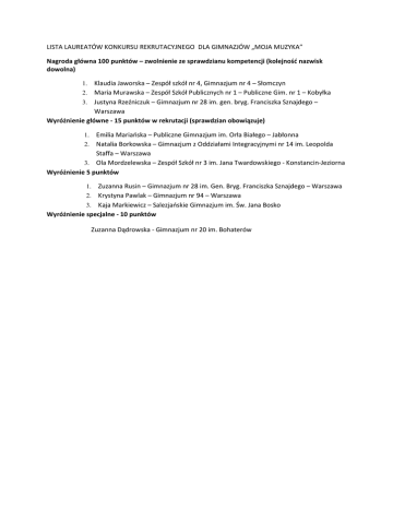 LISTA LAUREATÓW KONKURSU REKRUTACYJNEGO DLA GIMNAZJÓW „MOJA MUZYKA” Nagroda główna 100 punktów – zwolnienie ze sprawdzianu kompetencji (kolejność nazwisk dowolna) Klaudia Jaworska – Zespół szkół nr 4, Gimnazjum nr 4 – Słomczyn 2. Maria Murawska – Zespół Szkół Publicznych nr 1 – Publiczne Gim. nr 1 – Kobyłka 3. Justyna Rzeźniczuk – Gimnazjum nr 28 im. gen. bryg. Franciszka Sznajdego – Warszawa Wyróżnienie główne - 15 punktów w rekrutacji (sprawdzian obowiązuje) 1. Emilia Mariańska – Publiczne Gimnazjum im. Orła Białego – Jabłonna 2. Natalia Borkowska – Gimnazjum z Oddziałami Integracyjnymi nr 14 im. Leopolda Staffa – Warszawa 3. Ola Mordzelewska – Zespół Szkół nr 3 im. Jana Twardowskiego - Konstancin-Jeziorna Wyróżnienie 5 punktów 1. Zuzanna Rusin – Gimnazjum nr 28 im. Gen. Bryg. Franciszka Sznajdego – Warszawa 2. Krystyna Pawlak – Gimnazjum nr 94 – Warszawa 3. Kaja Markiewicz – Salezjańskie Gimnazjum im. Św. Jana Bosko Wyróżnienie specjalne - 10 punktów 1. Zuzanna Dądrowska - Gimnazjum nr 20 im. Bohaterów