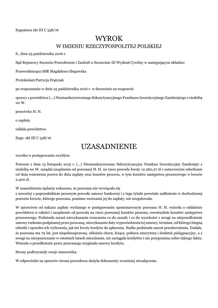 Sygnatura akt III C 338/16 WYROK W IMIENIU RZECZYPOSPOLITEJ POLSKIEJ S., dnia 25 października 2016 r. Sąd Rejonowy Szczecin-Prawobrzeże i Zachód w Szczecinie III Wydział Cywilny w następującym składzie: Przewodniczący:SSR Magdalena Głogowska Protokolant:Patrycja Frątczak po rozpoznaniu w dniu 25 października 2016 r. w Szczecinie na rozprawie sprawy z powództwa (...) Niestandaryzowanego Sekurytyzacyjnego Funduszu Inwestycyjnego Zamkniętego z siedzibą we W. przeciwko H. H. o zapłatę oddala powództwo. Sygn. akt III C 338/16 UZASADNIENIE wyroku w postępowaniu zwykłym Pozwem z dnia 13 listopada 2015 r. (...) Niestandaryzowany Sekurytyzacyjny Fundusz Inwestycyjny Zamknięty z siedzibą we W. zażądał zasądzenia od pozwanej H. H. na rzecz powoda kwoty 12.260,27 zł z ustawowymi odsetkami od dnia wniesienia pozwu do dnia zapłaty oraz kosztów procesu, w tym kosztów zastępstwa procesowego w kwocie 2.400 zł. W uzasadnieniu żądania wskazano, że pozwana nie wywiązała się z zawartej z poprzednikiem prawnym powoda umowy bankowej i z tego tytułu powstało zadłużenie w dochodzonej pozwem kwocie, którego pozwana, pomimo wezwania jej do zapłaty, nie uregulowała. W sprzeciwie od nakazu zapłaty wydanego w postępowaniu upominawczym pozwana H. H. wniosła o oddalenie powództwa w całości i zasądzenie od powoda na rzecz pozwanej kosztów procesu, ewentualnie kosztów zastępstwa procesowego. Podniosła zarzut niewykazania roszczenia co do zasady i co do wysokości z uwagi na nieprzedłożenie umowy rzekomo podpisanej przez pozwaną, niewykazanie daty wypowiedzenia tej umowy, terminu, od którego biegną odsetki i sposobu ich wyliczenia, jak też kwoty kredytu do spłacenia. Nadto podniosła zarzut przedawnienia. Dodała, że pozwana ma 79 lat, jest niepełnosprawna, obłożnie chora, leżąca, pobiera emeryturę i dodatek pielęgnacyjny, a z uwagi na nieopuszczanie w ostatnich latach mieszkania, nie zaciągała kredytów i nie przypomina sobie takiego faktu. Wniosła o przedłożenie przez pozwanego oryginału umowy kredytu. Strony podtrzymały swoje stanowiska. W odpowiedzi na sprzeciw strona powodowa złożyła dokumenty wcześniej niezałączone. Strona pozwana zakwestionowała natomiast okoliczności wykazywane dokumentami prywatnymi przedłożonymi przez stronę powodową i na rozprawie w dniu 25.10.2016 r. dodała, że pomimo stanowiska strony pozwanej strona powodowa nie przedłożyła oryginału umowy kredytu. Sąd ustalił następujący stan faktyczny: W wyciągu z ksiąg rachunkowych funduszu sekurytyzacyjnego i ewidencji analitycznej z dnia 10 listopada 2015 r. wskazano, że zobowiązanie dłużniczki H. H. wynikające z umowy kredytu z dnia 18 września 2008 r. wynosi 12.260,27 zł, w tym należność główna 7.877,41 zł i odsetki 4.382,86 zł. Dowód: wyciąg k. 8. W dniu 25 czerwca 2013 r. Bank (...) i powód - nabywca zawarli umowę sprzedaży wierzytelności, na mocy której bank sprzedał nabywcy wierzytelności opisane w załączniku nr 2. W wygenerowanym elektronicznie załączniku wymieniono wierzytelność wobec H. H. z tytułu umowy z dnia 18.09.2008 r. W dniu 14.10.2015 r. wygenerowano wezwanie do zapłaty dla pozwanej z żądaniem zapłaty kwoty 12.213,65 zł z tytułu umowy kredytu gotówkowego z dnia 18.09.2008 r. Nie załączono dowodu nadania ani doręczenia tego wezwania adresatowi. Dowód: odpis umowy z wyciągiem z elektronicznego załącznika k. 9-14, wezwanie k. 15-16. Powódka przedłożyła dokument prywatny w postaci potwierdzonego za zgodność z oryginałem odpisu wniosku o udzielenie kredytu, w którym H. i W. małżonkowie H. wnioskowali o kredyt, kopię umowy kredytu tychże, harmonogram spłat, odpis ogólnych warunków, odpis wypowiedzenia umowy bez dowodu nadania i doręczenia adresatowi, odpis bankowego tytułu egzekucyjnego z dnia 19.02.2013 r. wystawionego przeciwko małżonkom H., kopię wniosku z dnia 18.03.2013 r. o nadanie klauzuli wykonalności bankowemu tytułowi egzekucyjnemu, odpis postanowienia z dnia 24.04.2013 r. o nadaniu klauzuli wykonalności bankowemu tytułowi egzekucyjnemu z dnia 19.02.2013 r. na rzecz Banku (...) S.A. przeciwko małżonkom H.. Dowód: dowody k. 50-73. Pozwana urodziła się w (...) r. Jest emerytką, wdową, na stałe niezdolną do samodzielnej egzystencji. Jej emerytura wynosi 777 zł, a dodatek pielęgnacyjny 181 zł. Toczyło się z jej udziałem wszczęte z urzędu postępowanie opiekuńcze o przyjęcie do szpitala psychiatrycznego bez zgody. Faktycznym opiekunem pozwanej, a także jej pełnomocnikiem do doręczeń oraz do załatwiania spraw jest E. C.. Bezsporne, a nadto dowód: legitymacja emeryta k. 30, odpis zarządzenia k. 30a, akt notarialny k. 31-31v, 34-35, decyzja o przyznaniu dodatku pielęgnacyjnego k. 32-32v, odpis aktu zgonu męża pozwanej – W. H. k. 33, zaświadczenia lekarskie k. 88-89. Sąd zważył, co następuje: Powództwo okazało się nieuzasadnione. Powód wywodzi roszczenie z umowy kredytu oraz z umowy cesji. Zgodnie z treścią art. 6 k.c. ciężar udowodnienia faktu spoczywa na stronie, która z faktu tego wywodzi skutki prawne. Powód winien wykazać istnienie stosunku podstawowego, wysokość zobowiązania pozwanej, a także fakt następstwa prawnego. Dowody przedłożone przez stronę powodową nie czynią zadość obowiązkowi wykazania istnienia i wysokości roszczenia ze stosunku podstawowego. Przede wszystkim strona powodowa nie przedłożyła oryginału umowy kredytu, a jedynie kserokopię, która nawet nie posiada waloru dokumentu prywatnego, a wobec zakwestionowania przez stronę pozwaną tego dowodu, sąd nie mógł na jego podstawie czynić ustaleń faktycznych. Sam wniosek o udzielenie kredytu nie jest dowodem zawarcia umowy. Dalej strona powodowa załączyła bankowy tytuł egzekucyjny i postanowienie sądu o nadaniu mu klauzuli wykonalności. Są to dokumenty, które nie dowodzą istnienia i wysokości wierzytelności. Postępowanie klauz