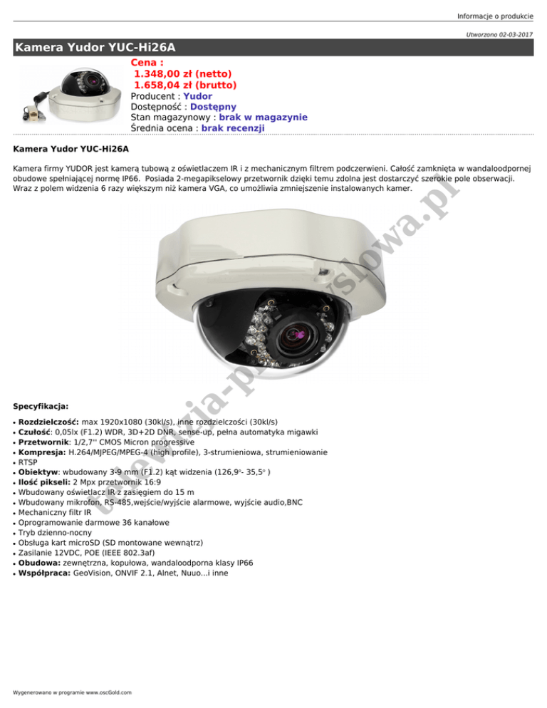 Informacje o produkcie Utworzono 02-03-2017 Kamera Yudor YUC-Hi26A Cena : 1.348,00 zł (netto) 1.658,04 zł (brutto) Producent : Yudor Dostępność : Dostępny Stan magazynowy : brak w magazynie Średnia ocena : brak recenzji Kamera Yudor YUC-Hi26A ● ● ● ● ● ● ● ● ● ● ● ● ● ● Rozdzielczość: max 1920x1080 (30kl/s), inne rozdzielczości (30kl/s) Czułość: 0,05lx (F1.2) WDR, 3D+2D DNR, sense-up, pełna automatyka migawki Przetwornik: 1/2,7'' CMOS Micron progressive Kompresja: H.264/MJPEG/MPEG-4 (high profile), 3-strumieniowa, strumieniowanie RTSP Obiektyw: wbudowany 3-9 mm (F1.2) kąt widzenia (126,9o- 35,5o ) Ilość pikseli: 2 Mpx przetwornik 16:9 Wbudowany oświetlacz IR z zasięgiem do 15 m Wbudowany mikrofon, RS-485,wejście/wyjście alarmowe, wyjście audio,BNC Mechaniczny filtr IR Oprogramowanie darmowe 36 kanałowe Tryb dzienno-nocny Obsługa kart microSD (SD montowane wewnątrz) Zasilanie 12VDC, POE (IEEE 802.3af) Obudowa: zewnętrzna, kopułowa, wandaloodporna klasy IP66 Współpraca: GeoVision, ONVIF 2.1, Alnet, Nuuo...i inne le ● te ● w iz ja Specyfikacja: -p r ze m ys lo w a. pl Kamera firmy YUDOR jest kamerą tubową z oświetlaczem IR i z mechanicznym filtrem podczerwieni. Całość zamknięta w wandaloodpornej obudowe spełniającej normę IP66. Posiada 2-megapikselowy przetwornik dzięki temu zdolna jest dostarczyć szerokie pole obserwacji. Wraz z polem widzenia 6 razy większym niż kamera VGA, co umożliwia zmniejszenie instalowanych kamer. Wygenerowano w programie www.oscGold.com Rys.1 Złącza kamery YUCHi26A pl Oprogramowanie do rejestracji obrazu z kamer...Wraz z kamerami YUC-Hi26A dołączone jest darmowe oprogramowanie CMS, które umożliwia stworzenie systemu monitoringu z maksymalnie 36 kamer IP firmy IPCam. PoE (Power Over Ethernet) - innowacyjność... Power over -p r ze m ys lo w a. Ethernet (PoE) jest technologią, która integruje zasilanie w standardowej infrastrukturze LAN. Umożliwia sterowanie, które należy dostarczyć do urządzenia sieciowego, takie jak kamera IP, za pomocą tego samego przewodu, co do połączenia z siecią. Eliminuje to potrzebę umiejscowienia gniazdek w pobliżu kamer i umożliwia łatwiejszą aplikację zasilania bezprzerwowego (UPS). Karta pamięci SD... Dzięki takiemu rozwiązaniu kamera jest w stanie być niezależnym urządzeniem rejestrującym obraz i dźwięk. w iz ja Rys.4 Złącze SD. Przechwytywanie obrazu w całkowitych ciemnościach... te le Kamera YUC-Hi26A posiada 18 diod podczerwieni, które oświetlają obszar do 15 metrów. Dzięki temu użytkownik będzie mógł spostrzec człowieka na drugim końcu ulicy lub nadjeżdżający samochód w zupełnych ciemnościach. Kamera automatycznie wykrywa zmierzch i przełącza się w tryb nocny. Wyposażona w czujnik światła nie wymaga obsługi ze strony administratora systemu. Dzięki temu niezależnie od oświetlenia kamera zachowuje wysoką jakość rejestrowanego obrazu. Rys.5 Oświetlacz podczerwieni. ze m ys lo w Rys.6 Regulacja kamery. a. pl Informacje o produkcie te le w iz ja -p r Solidna obudowa... Obudowa kamery YUC-Hi26A jest wykonana z bardzo solidnych materiałów. Cechą tej obudowy jest możliwość umocowania kamery do uchwytu w różnych pozycjach. Obudowa jest pyłoszczelna i chroni przed silnym strumieniem wody ze wszystkich kierunków. Jej klasa szczelności wynosi IP66. Wygenerowano w programie www.oscGold.com Rys.7 Obudowa. pl a. ze m ys lo w Rys.8 Regulacja 3D Axis. Cechy wyróżniające kamery YUDOR spośród dostępnych na rynku kamer IP to: ● ● ● ● ● ● ● obiektyw 3-9 [mm] rejestracja AVI na karcie SD trzy strumieniowość działanie na wszystkich systemach: windows, MacOS, LINUX działanie na wszystkich przeglądarkach: IE, Chrome, Firefox, Safari współpraca z telefonami: android, iphone zasilacznie 12VDC lub POE standard IEEE 802.3af-2003 zdejmowalny mechaniczny filtr IR -p r ● w iz ja Regulacja: jasność, kontrast, ostrość, gamma, balans bieli, mniej migotania, orientacja obrazu, prędkość migawki, gamma, ekspozycja, sense-up, DNS, WDR. te le Wszystkie kamery YUDOR pracują w protokole ONVIF 2.1, dlatego są kompatybilne z wszystkimi programami oraz rejestratorami wykorzystujące ten właśnie protokół jak np. z programem GV-NVR marki Geovision, NUUO, ALNET, AVERMEDIA, NOVUS, MILESTONE, QNAP, KOUKAAM, PLANET, LEVELONE, a także z rejestratorami YDS-xxxx - oraz wiele innych aplikacji wspierających standard ONVIF 2.1 Informacje o produkcie te le w iz ja -p r ze m ys lo w a. pl zadzwoń i zapytaj o rabat (22 672-36-36) (505-130-571) Wygenerowano w programie www.oscGold.com