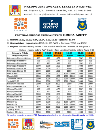 MAŁOPOLSKI ZWIĄZEK LEKKIEJ ATLETYKI Ul. Śląska 5/1 , 30-003 Kraków, tel. 507-018-608 e-mail: [email protected] www.lekkoatletyka.net.pl FESTIWAL BIEGÓW PRZEŁAJOWYCH GRUPA AZOTY 1. Termin: 12.03, 19.03, 9.04, 16.04, 1.10, 15.10 - godzina: 11.00 2. Kierownictwo i organizator: MZLA, KU AZS PWSZ w Tarnowie, TOSiR oraz PWSZ. 3. Miejsce: Tarnów – tereny zielone TOSiR przy hali Jaskółka w Tarnowie, ul. Traugutta 3 Kraków – tereny zielone AWF Kraków i Park Lotników Polskich, al.Jana Pawła II 78 Kategoria / Data Miejsce imprezy Dziewczęta Młodsze 08 i mł. Dziewczęta Młodsze 07 Dziewczęta Młodsze 06 Dziewczęta Młodsze 05 Dziewczęta Starsze 04 Dziewczęta Starsze 03 Młodziczki 02 Młodziczki 01 Juniorki Mł. 99-00 Juniorki 97-98 Seniorki 96 i starsze Chłopcy Młodsi 08 i mł. Chłopcy Młodsi 07 Chłopcy Młodsi 06 Chłopcy Młodsi 05 Chłopcy Starsi 04 Chłopcy Starsi 03 Młodzicy 02 Młodzicy 01 Juniorzy Mł. 99-00 Juniorzy 97-98 Seniorzy 96 i starsi 12.03 19.03 09.04 Kraków Tarnów Kraków 16.04 Tarnów 01.10 15.10 Tarnów Kraków 500 500 500 500 500 500 500 500 500 500 500 500 500 500 500 500 500 500 1000 1000 1000 1000 1000 2000 2000 2000 1000 1000 1000 1000 1000 2000 2000 2000 1000 1000 1000 1000 1000 2000 2000 2000 1000 1000 1000 1000 i 2000 1000 i 2000 2000 i 3000 2000 i 3000 3000 1000 1000 1000 1000 1000 3000 3000 3000 1000 1000 1000 1000 1000 3000 3000 3000 500 500 500 500 500 500 500 500 500 500 500 500 500 500 500 500 500 500 1000 1000 1000 1000 1000 3000 3000 3000 1000 1000 1000 1000 1000 3000 3000 3000 1000 1000 1000 1000 1000 3000 3000 3000 1000 1000 1000 1000 i 2000 1000 i 2000 2000 i 3000 2000 i 3000 3000 1000 1000 1000 1000 1000 4000 4000 4000 1000 1000 1000 1000 1000 4000 4000 4000 W każdym terminie w ramach FBP Grupa Azoty odbędzie się rekreacyjny Bieg Otwarty na 2000m MAŁOPOLSKI ZWIĄZEK LEKKIEJ ATLETYKI Ul. Śląska 5/1 , 30-003 Kraków, tel. 507-018-608 e-mail: [email protected] www.lekkoatletyka.net.pl 4. Warunki uczestnictwa: wszyscy chętni posiadający aktualne badania lekarskie (Kluby Sportowe), zgodę rodziców (Szkoły) lub na podstawie regulaminu uczestnictwa (Amatorzy). 5. Zgłoszenia: Kluby poprzez system zgłoszeń elektronicznych, który wraz z instrukcją zamieszczony jest pod adresem: http://www.domtel-sport.pl/zgłoszenia/. Zgłoszenia Szkół na adres MZLA [email protected] Uzupełnienia oraz dodatkowe zgłoszenia szkół oraz osób indywidualnych w dniu zawodów w Biurze do godziny 10.30. 6. Biuro zawodów: Tarnów - hol hali sportowej Jaskółka, czynne od godziny 9.30 Kraków – hol hali do gier zespołowych AWF, czynne od godziny 9.30 7. Opłata startowa: start dla wszystkich uczestników jest bezpłatny. 8. Komunikat: dostępny na stronie internetowej www.lekkoatletyka.net.pl 9. Punktacja: w każdej kategorii wiekowej za miejsca od 1 do 16 (20-2 punktów). Zasada przyznawania punktów: 1m.- 20, 2m.- 18, 3m.- 16, 4m.- 14, 5m.- 13, itd. do 16m.- 2. Zawodnicy od 17 miejsca za ukończenie rywalizacji otrzymują 1 punkt. 10. Kolejność końcowa: o pozycji decyduje ilość zdobytych punktów, gdy ta jest taka sama zadecyduje ilość zwycięstw. Przy tej samej ilości zwycięstw o końcowym rozdziale miejsc zadecyduje pozycja w finałowej edycji. Gdy zawodnicy o tej samej ilości punktów nie startowali w finałowej edycji o końcowym miejscu będzie decydować ilość drugich, trzecich itd. pozycji w poszczególnych startach. 11. Nagrody: dla wszystkich uczestników dyplom uczestnictwa, za miejsca 1-3 medale. W wybranych terminach biegi o Puchar Prezydenta Tarnowa: 19.03. biegi młodzików o Puchar Prezydenta Miasta Tarnowa 16.04. biegi juniorów młodszych o Puchar Prezydenta Tarnowa 01.10. biegi juniorów o Puchar Prezydenta Tarnowa W Biegu Otwartym losowanie 30 nagród rzeczowych wśród wszystkich uczestników biegu. W punktacji łącznej Festiwalu Biegów Przełajowych Grupa Azoty za miejsca 1-3 puchary. 12. Ubezpieczenie: zgodnie z art. 38 „Ustawy o sporcie” z 25.06.2010 r. obowiązek ubezpieczenia zawodników od następstw nieszczęśliwych wypadków należy do klubu, którego zawodnik jest członkiem