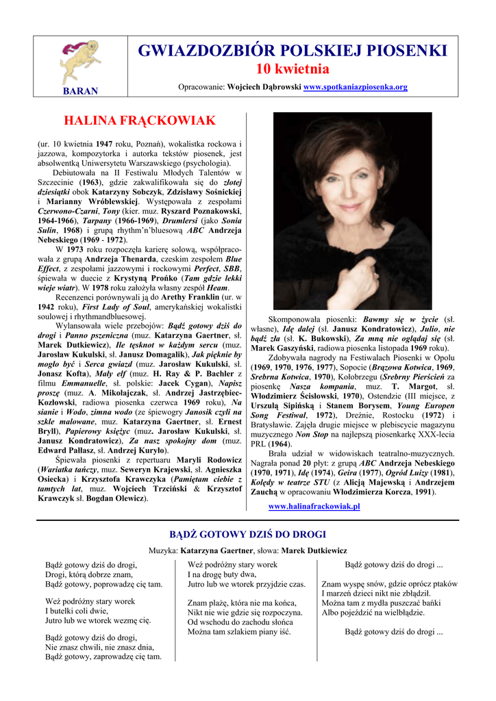 GWIAZDOZBIÓR POLSKIEJ PIOSENKI 10 kwietnia Opracowanie: Wojciech Dąbrowski www.spotkaniazpiosenka.org BARAN HALINA FRĄCKOWIAK (ur. 10 kwietnia 1947 roku, Poznań), wokalistka rockowa i jazzowa, kompozytorka i autorka tekstów piosenek, jest absolwentką Uniwersytetu Warszawskiego (psychologia). Debiutowała na II Festiwalu Młodych Talentów w Szczecinie (1963), gdzie zakwalifikowała się do złotej dziesiątki obok Katarzyny Sobczyk, Zdzisławy Sośnickiej i Marianny Wróblewskiej. Występowała z zespołami Czerwono-Czarni, Tony (kier. muz. Ryszard Poznakowski, 1964-1966), Tarpany (1966-1969), Drumlersi (jako Sonia Sulin, 1968) i grupą rhythm’n’bluesową ABC Andrzeja Nebeskiego (1969 - 1972). W 1973 roku rozpoczęła karierę solową, współpracowała z grupą Andrzeja Thenarda, czeskim zespołem Blue Effect, z zespołami jazzowymi i rockowymi Perfect, SBB, śpiewała w duecie z Krystyną Prońko (Tam gdzie lekki wieje wiatr). W 1978 roku założyła własny zespół Heam. Recenzenci porównywali ją do Arethy Franklin (ur. w 1942 roku), First Lady of Soul, amerykańskiej wokalistki soulowej i rhythmandbluesowej. Wylansowała wiele przebojów: Bądź gotowy dziś do drogi i Panno pszeniczna (muz. Katarzyna Gaertner, sł. Marek Dutkiewicz), Ile tęsknot w każdym sercu (muz. Jarosław Kukulski, sł. Janusz Domagalik), Jak pięknie by mogło być i Serca gwiazd (muz. Jarosław Kukulski, sł. Jonasz Kofta), Mały elf (muz. H. Ray & P. Bachler z filmu Emmanuelle, sł. polskie: Jacek Cygan), Napisz proszę (muz. A. Mikołajczak, sł. Andrzej JastrzębiecKozłowski, radiowa piosenka czerwca 1969 roku), Na sianie i Wodo, zimna wodo (ze śpiewogry Janosik czyli na szkle malowane, muz. Katarzyna Gaertner, sł. Ernest Bryll), Papierowy księżyc (muz. Jarosław Kukulski, sł. Janusz Kondratowicz), Za nasz spokojny dom (muz. Edward Pałłasz, sł. Andrzej Kuryło). Śpiewała piosenki z repertuaru Maryli Rodowicz (Wariatka tańczy, muz. Seweryn Krajewski, sł. Agnieszka Osiecka) i Krzysztofa Krawczyka (Pamiętam ciebie z tamtych lat, muz. Wojciech Trzciński & Krzysztof Krawczyk sł. Bogdan Olewicz). Skomponowała piosenki: Bawmy się w życie (sł. własne), Idę dalej (sł. Janusz Kondratowicz), Julio, nie bądź zła (sł. K. Bukowski), Za mną nie oglądaj się (sł. Marek Gaszyński, radiowa piosenka listopada 1969 roku). Zdobywała nagrody na Festiwalach Piosenki w Opolu (1969, 1970, 1976, 1977), Sopocie (Brązowa Kotwica, 1969, Srebrna Kotwica, 1970), Kołobrzegu (Srebrny Pierścień za piosenkę Nasza kompania, muz. T. Margot, sł. Włodzimierz Ścisłowski, 1970), Ostendzie (III miejsce, z Urszulą Sipińską i Stanem Borysem, Young Europen Song Festiwal, 1972), Dreźnie, Rostocku (1972) i Bratysławie. Zajęła drugie miejsce w plebiscycie magazynu muzycznego Non Stop na najlepszą piosenkarkę XXX-lecia PRL (1964). Brała udział w widowiskach teatralno-muzycznych. Nagrała ponad 20 płyt: z grupą ABC Andrzeja Nebeskiego (1970, 1971), Idę (1974), Geira (1977), Ogród Luizy (1981), Kolędy w teatrze STU (z Alicją Majewską i Andrzejem Zauchą w opracowaniu Włodzimierza Korcza, 1991). www.halinafrackowiak.pl BĄDŻ GOTOWY DZIŚ DO DROGI Muzyka: Katarzyna Gaertner, słowa: Marek Dutkiewicz Bądź gotowy dziś do drogi, Drogi, którą dobrze znam, Bądź gotowy, poprowadzę cię tam. Weź podróżny stary worek I na drogę buty dwa, Jutro lub we wtorek przyjdzie czas. Weź podróżny stary worek I butelki coli dwie, Jutro lub we wtorek wezmę cię. Znam plażę, która nie ma końca, Nikt nie wie gdzie się rozpoczyna. Od wschodu do zachodu słońca Można tam szlakiem piany iść. Bądź gotowy dziś do drogi, Nie znasz chwili, nie znasz dnia, Bądź gotowy, zaprowadzę cię tam. Bądź gotowy dziś do drogi ... Znam wyspę snów, gdzie oprócz ptaków I marzeń dzieci nikt nie zbłądził. Można tam z mydła puszczać bańki Albo pojeździć na wielbłądzie. Bądź gotowy dziś do drogi ...