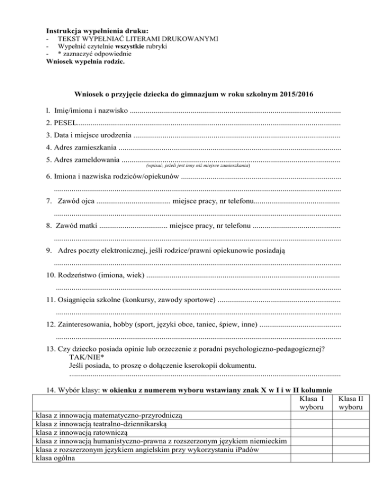 Instrukcja wypełnienia druku: - TEKST WYPEŁNIAĆ LITERAMI DRUKOWANYMI - Wypełnić czytelnie wszystkie rubryki - * zaznaczyć odpowiednie Wniosek wypełnia rodzic. Wniosek o przyjęcie dziecka do gimnazjum w roku szkolnym 2015/2016 l. Imię/imiona i nazwisko ............................................................................................................ 2. PESEL....................................................................................................................................... 3. Data i miejsce urodzenia .......................................................................................................... 4. Adres zamieszkania .................................................................................................................. 5. Adres zameldowania ................................................................................................................ (wpisać, jeżeli jest inny niż miejsce zamieszkania) 6. Imiona i nazwiska rodziców/opiekunów .................................................................................. ................................................................................................................................................... 7. Zawód ojca ...................................... miejsce pracy, nr telefonu............................................ ................................................................................................................................................... 8. Zawód matki ................................... miejsce pracy, nr telefonu ............................................. ................................................................................................................................................... 9. Adres poczty elektronicznej, jeśli rodzice/prawni opiekunowie posiadają ................................................................................................................................................... 10. Rodzeństwo (imiona, wiek) ................................................................................................... .................................................................................................................................................. 11. Osiągnięcia szkolne (konkursy, zawody sportowe) ............................................................... .................................................................................................................................................. 12. Zainteresowania, hobby (sport, języki obce, taniec, śpiew, inne) .......................................... .................................................................................................................................................. 13. Czy dziecko posiada opinie lub orzeczenie z poradni psychologiczno-pedagogicznej? TAK/NIE* Jeśli posiada, to proszę o dołączenie kserokopii dokumentu. ........................................................................................................................................... 14. Wybór klasy: w okienku z numerem wyboru wstawiany znak X w I i w II kolumnie Klasa I Klasa II wyboru wyboru klasa z innowacją matematyczno-przyrodniczą klasa z innowacją teatralno-dziennikarską klasa z innowacją ratowniczą klasa z innowacją humanistyczno-prawna z rozszerzonym językiem niemieckim klasa z rozszerzonym językiem angielskim przy wykorzystaniu iPadów klasa ogólna 15. Wybór drugiego obowiązkowego języka obcego (j. niemiecki lub j. hiszpański,) wpisać język ...................................................................................................................................... 16. Dziecko w szkole podstawowej miało długotrwałe zwolnienie lekarskie z zajęć wychowania fizycznego TAK/NIE*....................................................................................... 17. Oświadczam, że dziecko będzie uczęszczało na (wpisać odpowiednio: religię katolicką, religię grekokatolicką, etykę):................................................................................................. 18. Wyrażam/ nie wyrażam* zgody na uczestnictwo mojego syna/córki w zajęciach wychowania do życia w rodzinie (WDŻ). Zgoda na przetwarzanie danych osobowych Niniejszym wyrażam zgodę na przetwarzanie przez Gimnazjum nr 1 w Człuchowie danych osobowych mojego dziecka …….……………………………………........................... (imię i nazwisko dziecka) imię i nazwisko, klasa, data i miejsce urodzenia, adres, PESEL, nr telefonu oraz wizerunek ucznia do celów promocyjnych szkoły (osiągnięcia szkoły na zawodach, konkursach, zajęcia rekreacyjne – wycieczki, biwaki, kuligi oraz z uroczystości szkolnych itp.) w celu związanym z edukacją mojego dziecka. Jednocześnie oświadczam, że zostałem/łam poinformowany/na o przysługujących mi na podstawie Ustawy o ochronie danych osobowych z 29 sierpnia 1997 r. (Dz. U. z 2002 Nr 101, poz. 926 z późn. zm.) uprawnieniach, w tym o prawie dostępu do treści moich danych osobowych oraz o prawie do ich poprawiania. Oświadczam również, że podałem/łam moje dane osobowe dobrowolnie. ....................................................... podpis czytelny rodziców/opiekunów Załączniki: • fotografia (2 sztuki) - podpisana imieniem i nazwiskiem, • świadectwo ukończenia szkoły podstawowej, • zaświadczenie o wynikach sprawdzianu z OKE, • kserokopia skróconego odpisu aktu urodzenia. Załączniki należy dostarczyć do 1 lipca 2015 r. godz. 12:00 Kartę naboru do gimnazjum proszę składać w terminie od 2 marca do 29 maja 2015 r. .................................................................... (czytelny podpis rodzica) Wypełnia sekretariat Gimnazjum nr 1 w Człuchowie Załączniki: wpłynęło dnia ........................................ • fotografia (2 sztuki) ....................................