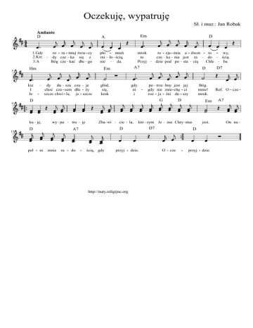 Oczekuję, wypatruję Sł. i muz.: Jan Robak Andante D 4 1.Gdy 2.Kie 3.A 5 Hm kie I Je 9 dy du sza czu je choć cza sem dłu ży szcze chwi la, je szcze pło mień mi ło ścią, nie da. D mrok to Przyj ro zja śnia a dwen cze ka nie jest ra dzie pod po sta cią A7 Em głód, się, krok gdy ni i po trze bny jest jej gdy nie znie chę ci roz ja śni du szy G wy pa D peł tru ję Zba wi do la, któ rym Je ścią, gdy przyj http://nuty.religijne.org dzie. Bóg. mnie! mrok. D Em zus Chry stus D7 D A7 ni mnie ra cie to do Chle D D ku ję, 13 ro ra tniej świe cy dy cze ka się z Bóg cze kać dłu go Em A jest. D O cze przyj dzie. wy, ścią. ba. D7 Ref. O cze A7 On na