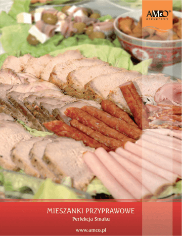 Mieszanki przyprawowe Mieszanki przypraw do wędlin tradycyjnych Mieszanki przypraw do wędlin homogenizowanych Mieszanki przypraw do wędlin surowych Mieszanki smakowe do produktów mięsnych i drobiowych Mieszanki smakowe do wędlin podrobowych i pasztetów Produkty Convenience i grillowe Dania gotowe i sosy Mieszanki smakowe i posypki dekoracyjne Mieszanki przyprawowe do kiełbas grillowych Marynaty olejowe Preparaty do sporządzania solanek Preparaty i dodatki funkcjonalne Preparaty do sporządzania solanek zalewowych Preparaty do sporządzania solanek nastrzykowych Dodatki funkcjonalne Przyprawy naturalne Przyprawy naturalne Mieszanki dekoracyjno - smakowe 2 Oferta aktualna Indeks opis Dawkowanie MIESZANKI PRZYPRAW DO WĘDLIN TRADYCYJNYCH ZWYCZAJNA SPECJAL 10.001 Mieszanka przyprawowa do tradycyjnej kiełbasy zwyczajnej z intensywnym posmakiem czosnku i pieprzu. Bez widocznego majeranku. 4g/kg farszu PODWAWELSKA 10.005 Mieszanka smakowa do kiełbas parzonych i pieczonych, charakterystyczna do kiełbasy podwawelskiej. 6g/kg farszu PODWAWELSKA SPECJAL 10.006 Doskonała mieszanka przyprawowo-aromatyczna z zastosowaniem m.in.do podwawelskiej. 5g/kg farszu PODWAWELSKA PREMIUM 10.070 Mieszanka smakowa do kiełbas parzonych i pieczonych, charakterystyczna do kiełbasy podwawelskiej. Wiodący smak czosnkowo - pieprzowy. 5g/kg farszu MADRYCKA 10.007 Aromatyczna mieszanka przyprawowa o charakterystycznym korzennym smaku z delikatną nutą wina Madera. 4g/kg farszu MADRYCKA COMBI 10.008 POLECAMY! Mieszanka funkcjonalno smakowa na bazie cytrynianów o charakterystycznym korzennym smaku z delikatną nutą wina Madera. 8g/kg farszu SZYNKOWA SPECJAL 10.010 Mieszanka przyprawowa smakowa do produktów drobiowych oraz kiełbasy szynkowej na bazie przypraw naturalnych. 4g/kg farszu CZOSNKOWA SPECJAL 10.011 Przyprawa smakowa o mocnym smaku czosnkowym do kiełbas parzonych i wiejskich pieczonych oraz bloków i pieczeni. 5g/kg farszu DOBRA 10.014 Mieszanka przyprawowa smakowa z delikatną nutą czosnku i papryki doskonała do kiełbas typu toruńska oraz konserw typu chope pork, lekko przebarwia farsz. 5g/kg farszu ŻYWIECKA 10.015 POLECAMY! Mieszanka przyprawowa smakowa do produkcji kiełbas grubo i średniorozdrobnionych typu żywiecka. 2-4g/kg farszu 3 MIESZANKI PRZYPRAWOWE Oferta aktualna Indeks 4 opis Dawkowanie KIEŁBASY SUCHE 10.016 Bazowa smakowa mieszanka przypraw naturalnych przeznaczona do kiełbas suchych. Dodatek pojedyńczych przypraw naturalnych kminku, jałowca, kolendry, pieprzu tworzy kompozycję do tradycyjnych kiełbas suchych branżowych. 3-4g/kg farszu MYŚLIWSKA 10.017 Tradycyjny zestaw smakowy przypraw do kiełbasy myśliwskiej oraz kiełbas podsuszanych. 9g/kg farszu KABANOSY 10.018 Mieszanka przyprawowa smakowa, polecana do tradycyjnych kabanosów. 7,5g/kg farszu FARMERSKA COMBI 10.021 Mieszanka combi na bazie fosforanów do produkcji wędlin o ubogim wsadzie - kryjąca. Smak ostry, pikantny pieprzowo-paprykowy. 8g/kg farszu STAROPOLSKA 10.022 Mieszanka smakowa z nutą kolendry i kminku. Zalecana do kiełbas parzonych. 4g/kg farszu PODKARPACKA 10.027 POLECAMY! Mieszanka przyprawowa smakowa do kiełbas średniorozdrobnionych. Z mięsa czerwonego lub z udziałem mięsa drobiowego. Wiodący zdecydowany smak pieprzowo-czosnkowy. Doskonała do kiełbas tradycyjnych i typu wiejskiego. POWER MIX 10.035 Mieszanka przyprawowa smakowa do kiełbas parzonych średniorozdrobnionych, a także salcesonu białego. Przy mniejszym dozowaniu jako podkład smakowy do kiełbasy typu zwyczajna, podkarpacka. Mocno czosnkowa. 6-7g/kg farszu KIEŁBASY ŚREDNIO ROZDROBNIONE T-8 10.036 Mieszanka przyprawowa smakowa do wędlin parzonych, kiełbas o wiodącym smaku: kminku. 2-3g/kg farszu KRAKOWSKA SUCHA 10.038 Mieszanka przyprawowa smakowa na bazie pieprzu i kminku do tradycyjnej kiełbasy krakowskiej suchej. Wiodący smak: kolendra, pieprz. 4-5g/kg farszu KRAKOWSKA PARZONA 10.041 Mieszanka przyprawowa smakowa do kiełbas gruborozdrobnionych - typowej krakowskiej parzonej. Wiodący smak: pieprz, czosnek, kolendra. 5g/kg farszu ZWYKŁA 10.043 Mieszanka smakowa do kiełbas średniorozdrobnionych typu zwyczajna oraz bloków pieczeni i kiełbas grillowych. 3,5 -4g/kg farszu 5-6g/kg farszu Oferta aktualna Indeks opis Dawkowanie OGNISKOWA 10.044 Mieszanka smakowa do produkcji kiełbas średniorozdrobnionych cienkich. Wiodący smak: kolendra, pieprz, chili. 5-6g/kg farszu SZYNKOWA EKSTRA 10.045 Przyprawa smakowa do wyrobów mięsnych i drobiowych. Zalecana do kiełbas drobiowych i wyrobów z udziałem mięsa drobiowego. Bez widocznych przypraw. 4g/kg farszu ŚLĄSKA 10.046 Przyprawa smakowa do wyrobów mięsnych i drobiowych. Wiodący smak: pieprz, kolendra, imbir. 7g/kg farszu GŁOGOWSKA 10.050 POLECAMY! Mieszanka smakowa przeznaczona do wyrobów mięsnych i drobiowych z przeznaczeniem do kiełbas średnio i gruborozdrobnionych. 5-9g/kg farszu TARGOWA Przyprawa smakowa do kiełbas popularnych tanich, smakowita, kryjąca. Można ją również stosować do pieczeni i wyrobów drobiowych. 8g/kg farszu PYSZNE DROBIOWE 10.054 Przyprawa smakowa do kiełbas średniorozdrobnionych. Wiodący smak: imbir i pieprz. 5g/kg farszu ULUBIONA 10.056 Przyprawa smakowa do kiełbas średniorozdrobnionych. Wiodący smak: czosnek. 4-6/kg farszu GAZDOWSKA 10.057 Przyprawa smakowa do kiełbas średniorozdrobnionych. Wiodący smak: czosnkowo-pieprzowy. 7g/kg farszu GALICJA 10.060 Mieszanka przyprawowa smakowa do kiełbas średniorozdrobnionych. Wiodący smak: pieprz, czosnek. 4g/kg farszu KIEŁBASA CHŁOPSKA 10.071 Przyprawa smakowa do kiełbas średniorozdrobnionych typu domowego. Wiodący smak: czosnkowo-pieprzowy. 9g/kg farszu KIEŁBASA JAŁOWCOWA 10.063 Przyprawa smakowa tradycyjna. Wiodący smak: pieprzu i jałowca. KIEŁBASA SEWILLA 10.064 Przyprawa smakowa do kiełbas średniorozdrobnionych. Wiodący smak mięsny z nutą aromatu winnego. 4-5g/kg farszu 6g/kg farszu 5 MIESZANKI PRZYPRAWOWE Oferta aktualna Indeks opis Dawkowanie KI