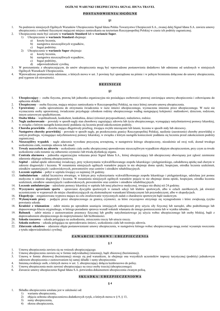OGÓLNE WARUNKI UBEZPIECZENIA SIGNAL IDUNA TRAVEL POSTANOWIENIA OGÓLNE §1 1. 2. 3. 4. Na podstawie niniejszych Ogólnych Warunków Ubezpieczenia Signal Iduna Polska Towarzystwo Ubezpieczeń S.A., zwanej dalej Signal Iduna S.A. zawiera umowy ubezpieczenia z osobami fizycznymi mającymi miejsce zamieszkania na terytorium Rzeczypospolitej Polskiej w czasie ich podróży zagranicznej. Ubezpieczenie może być zawarte w wariancie Standard lub w wariancie Super. 1) Ubezpieczenie w wariancie Standard obejmuje: a) koszty leczenia, b) następstwa nieszczęśliwych wypadków, c) bagaż podróżny. 2) Ubezpieczenie w wariancie Super obejmuje: a) koszty leczenia, b) następstwa nieszczęśliwych wypadków, c) bagaż podróżny, d) odpowiedzialność cywilną. W porozumieniu z ubezpieczającym, do umów ubezpieczenia mogą być wprowadzone postanowienia dodatkowe lub odmienne od ustalonych w niniejszych Ogólnych Warunkach Ubezpieczenia. Wprowadzone postanowienia odmienne, o których mowa w ust. 3 powinny być sporządzone na piśmie i w pełnym brzmieniu dołączone do umowy ubezpieczenia, pod rygorem ich nieważności. DEFINICJE §2 1. 2. 3. 4. 5. 6. 7. 8. 9. 10. 11. 12. 13. 14. 15. 16. 17. 18. 19. 20. 21. 22. Ubezpieczający - osoba fizyczna, prawną lub jednostka organizacyjna nie posiadająca osobowości prawnej zawierająca umowę ubezpieczenia i zobowiązana do opłacenia składki. Ubezpieczony – osoba fizyczna, mająca miejsce zamieszkania w Rzeczypospolitej Polskiej, na rzecz której zawarto umowę ubezpieczenia. Uprawniony – osoba upoważniona do otrzymania świadczenia w razie śmierci ubezpieczonego, wyznaczona imiennie przez ubezpieczonego. W razie nie wyznaczenia osoby uprawnionej, świadczenie przysługuje członkom rodziny ubezpieczonego według następującej kolejności: małżonkowi, dzieciom, rodzicom, innym ustawowym spadkobiercom. Osoba bliska – współmałżonek, konkubent, konkubina, dzieci (również przysposobione), rodzeństwo, rodzice. Nagłe zachorowanie - powstały w sposób nagły stan chorobowy zagrażający zdrowiu lub życiu ubezpieczonego, wymagający natychmiastowej pomocy lekarskiej, w związku z którym nastąpiła konieczność poddania się leczeniu przed zakończeniem podróży. Choroba przewlekła – choroba mająca długotrwały przebieg, trwająca zwykle miesiącami lub latami, leczona w sposób stały lub okresowy. Następstwo choroby przewlekłej – powstałe w sposób nagły, po przekroczeniu granicy Rzeczypospolitej Polskiej, nasilenie (zaostrzenie) choroby przewlekłej o ostrym przebiegu, wymagające natychmiastowej pomocy lekarskiej, w związku z którym nastąpiła konieczność poddania się leczeniu przed zakończeniem podróży zagranicznej. Nieszczęśliwy wypadek – nagłe zdarzenie wywołane przyczyną zewnętrzną, w następstwie którego ubezpieczony, niezależnie od swej woli, doznał trwałego uszkodzenia ciała, rozstroju zdrowia lub zmarł. Trwały uszczerbek na zdrowiu – uszkodzenie ciała osoby ubezpieczonej spowodowane nieszczęśliwym wypadkiem objętym ubezpieczeniem, przy czym za trwałe uszkodzenie ciała rozumie się zaburzenie czynności lub trwałą dysfunkcję organu. Centrala alarmowa – jednostka organizacyjna wskazana przez Signal Iduna S.A., której ubezpieczający lub ubezpieczony obowiązany jest zgłosić zaistnienie zdarzenia objętego ochroną ubezpieczeniową. Szpital – zakład opieki zdrowotnej świadczący, przy wykorzystaniu wykwalifikowanego zespołu lekarskiego i pielęgniarskiego, całodobową opiekę nad chorym w zakresie diagnostyki i leczenia. W rozumieniu niniejszych ogólnych warunków pojęcie to nie obejmuje domu opieki, hospicjum, ośrodka leczenia uzależnień, ośrodków sanatoryjnych i uzdrowiskowych, prewentoriów oraz centrów i ośrodków rehabilitacyjnych. Leczenie szpitalne – pobyt w szpitalu trwający co najmniej 24 godziny. Ambulatorium – zakład lecznictwa otwartego, w którym przy wykorzystaniu wykwalifikowanego zespołu lekarskiego i pielęgniarskiego, udzielana jest pomoc medyczna w zakresie diagnostyki i leczenia. W rozumieniu niniejszych ogólnych warunków pojęcie to nie obejmuje domu opieki, hospicjum, ośrodka leczenia uzależnień, ośrodków sanatoryjnych i uzdrowiskowych, prewentoriów oraz centrów i ośrodków rehabilitacyjnych. Leczenie ambulatoryjne – udzielenie pomocy lekarskiej w szpitalu lub innej placówce medycznej, trwające nie dłużej niż 24 godziny. Wyczynowe uprawianie sportu – uprawianie dyscyplin sportowych w ramach sekcji lub klubów sportowych, albo w celach zarobkowych, jak również uczestniczenie w wyprawach do miejsc charakteryzujących się ekstremalnymi warunkami klimatycznymi lub przyrodniczymi, albo w ekspedycjach. Ekspedycja – zorganizowana wyprawa mająca na celu zrealizowanie wytyczonych zadań o charakterze sportowym bądź naukowym. Wykonywanie pracy – podjęcie przez ubezpieczonego za granicą czynności, za które zwyczajowo otrzymuje się wynagrodzenie i które zwiększają ryzyko powstania szkody. Kradzież z włamaniem – zabór mienia po uprzednim usunięciu istniejących zabezpieczeń przy użyciu siły fizycznej lub narzędzi, albo podrobionego lub dopasowanego klucza oryginalnego, w którego posiadanie sprawca wszedł wskutek włamania do innego pomieszczenia lub w wyniku rabunku. Rabunek – zabór mienia z zastosowaniem przemocy fizycznej lub groźby natychmiastowego jej użycia wobec ubezpieczonego lub osoby bliskiej, bądź z doprowadzeniem ubezpieczonego do nieprzytomności lub bezbronności. Szkoda rzeczowa – szkoda polegająca na uszkodzeniu, zniszczeniu rzeczy lub utracie rzeczy. Szkoda osobowa – szkoda polegająca na spowodowaniu śmierci, uszkodzeniu ciała lub rozstroju zdrowia. Zdarzenie szkodowe – zdarzenie objęte postanowieniami umowy ubezpieczenia, w następstwie którego wobec ubezpieczonego mogą zostać wysunięte roszczenia z tytułu odpowiedzialności cywilnej. ZAWARCIE UMOWY UBEZPIECZ