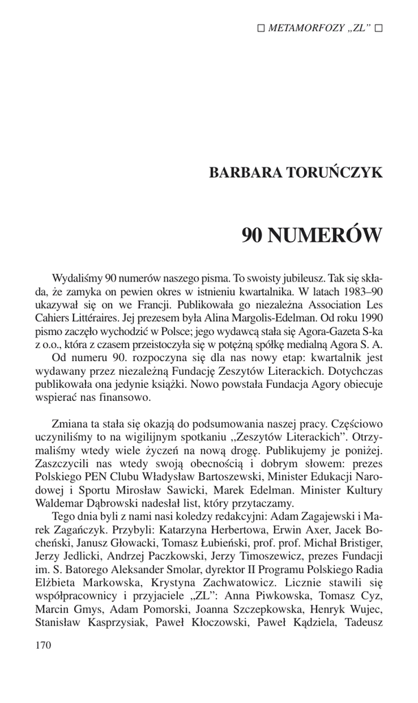METAMORFOZY „ZL” BARBARA TORUŃCZYK 90 NUMERÓW Wydaliśmy 90 numerów naszego pisma. To swoisty jubileusz. Tak się skła− da, że zamyka on pewien okres w istnieniu kwartalnika. W latach 1983–90 ukazywał się on we Francji. Publikowała go niezależna Association Les Cahiers Littéraires. Jej prezesem była Alina Margolis−Edelman. Od roku 1990 pismo zaczęło wychodzić w Polsce; jego wydawcą stała się Agora−Gazeta S−ka z o.o., która z czasem przeistoczyła się w potężną spółkę medialną Agora S. A. Od numeru 90. rozpoczyna się dla nas nowy etap: kwartalnik jest wydawany przez niezależną Fundację Zeszytów Literackich. Dotychczas publikowała ona jedynie książki. Nowo powstała Fundacja Agory obiecuje wspierać nas finansowo. Zmiana ta stała się okazją do podsumowania naszej pracy. Częściowo uczyniliśmy to na wigilijnym spotkaniu ,,Zeszytów Literackich”. Otrzy− maliśmy wtedy wiele życzeń na nową drogę. Publikujemy je poniżej. Zaszczycili nas wtedy swoją obecnością i dobrym słowem: prezes Polskiego PEN Clubu Władysław Bartoszewski, Minister Edukacji Naro− dowej i Sportu Mirosław Sawicki, Marek Edelman. Minister Kultury Waldemar Dąbrowski nadesłał list, który przytaczamy. Tego dnia byli z nami nasi koledzy redakcyjni: Adam Zagajewski i Ma− rek Zagańczyk. Przybyli: Katarzyna Herbertowa, Erwin Axer, Jacek Bo− cheński, Janusz Głowacki, Tomasz Łubieński, prof. prof. Michał Bristiger, Jerzy Jedlicki, Andrzej Paczkowski, Jerzy Timoszewicz, prezes Fundacji im. S. Batorego Aleksander Smolar, dyrektor II Programu Polskiego Radia Elżbieta Markowska, Krystyna Zachwatowicz. Licznie stawili się współpracownicy i przyjaciele „ZL”: Anna Piwkowska, Tomasz Cyz, Marcin Gmys, Adam Pomorski, Joanna Szczepkowska, Henryk Wujec, Stanisław Kasprzysiak, Paweł Kłoczowski, Paweł Kądziela, Tadeusz 170 Zeszyty Literackie 90 numerów. Metamorfozy Sobolewski, Marcin Kydryński, Anna Maria Jopek, Magda Łazarkiewicz, państwo Markuszewscy, Róża Thun, Danuta i Andrzej Kuroń, Maciej Cisło, Anna Janko i wielu innych. Ryszard Kapuściński, Wiesław Myśliw− ski, ks. Adam Boniecki, Piotr Kłoczowski przesłali pozdrowienia. Miałam wtedy okazję podziękować za specjalną życzliwość i opiekę roztoczoną nad naszą pracą przybyłym na spotkanie Helenie Łuczywo, zastępcy redaktora naczelnego ,,Gazety Wyborczej” oraz Jarosławowi Szalińskiemu z Zarządu Agora S.A. Innymi dobrymi duchami w Agorze i „GW” przez te wszystkie lata byli: Wanda Rapaczynski, Adam Michnik, Piotr Niemczycki, Seweryn Blumsztajn, Marek Jackiewicz a ostatnio Wojciech Kamiński i Marek Szydłowski, prezes i wiceprezes Fundacji Agory. (Więcej i bardziej szczegółowo o sytuacji kwartalnika i jego przy− jaciołach dowiedzieć się można z broszury: Jan Nowak−Jeziorański. Głos wolnej Europy, gdyż w publikowanych tam listach Jana Nowaka z archi− wum „Zeszytów Literackich” z lat 1983–2003 mowa jest głównie o tych sprawach). Wigilijni goście wysłuchali utworów współpracowników kwartalnika — tych wieloletnich i oddanych, jak również najmłodszych, na ogół u nas debiutujących. Julia Hartwig, Adam Zagajewski, Monika Ples, Anna Ar− no czytali swoje wiersze. Tomasz Różycki przedstawił nam z ekranu swo− ją najnowszą poezję; ukazała się ona na naszych łamach wkrótce potem. Na zakończenie rozległ się głos Czesława Miłosza, który nagrał dla nas swego czasu przeznaczony dla ,,ZL” wiersz Jasności promieniste. Z frag− mentami swojej pracy literackiej z najnowszych numerów ,,ZL” zapozna− li nas również Adam Szczuciński, Zofia Król, Juliusz Kurkiewicz. Liczymy na Państwa życzliwe zainteresowanie naszymi publikacjami: pismem, broszurami, książkami. Żywimy ufność i pokładamy nadzieję w przyszłości. Przy okazji informujemy, że począwszy od numeru 90. zmienia się nasz cykl wydawniczy. Kwartalnik będzie się ukazywał w miesiącach: marzec, czerwiec, wrzesień, grudzień. BARBARA TORUŃCZYK MINISTER KULTURY WALDEMAR DĄBROWSKI: Szanowna Pani Redaktor, Droga Basiu, Z okazji Waszego 20−lecia wspominaliśmy wielkich patronów Waszej formacji intelektualnej, moralnej i literackiej: Konstantego Jeleńskiego, Józefa Czapskiego, Josifa Brodskiego, Zbigniewa Herberta. 171 Zeszyty Literackie 90 numerów. Metamorfozy Mijający 2004 rok był trudny. Śmierć Czesława Miłosza i Jacka Kuro− nia wydaje się nam końcem pewnej epoki. „Zeszytom Literackim” — dzięki Waszej pracy i żywej obecności — udało się to, co w kulturze najtrudniejsze i najcenniejsze: zachowanie ciągłości. Zachowanie żywej ciągłości dzięki niezwykle interesującej i pełnej obietnic konstelacji młodych autorów „Zeszytów Literackich”. Konstelacji, w której rozpoznaję wspaniałą inspirację Dawnych Mistrzów, połączoną z czujną uwagą dla współczesności. Wasza pięcioletnia praca nad archiwami Zbigniewa Herberta przynio− sła wspaniałe owoce w postaci wzorowej, krytycznej edycji ineditów, niezwykłej trylogii, jaką tworzą Labirynt nad morzem, Martwa natura z wędzidłem i Barbarzyńca w ogrodzie oraz korespondencji z Henrykiem Elzenbergiem. Szanowna Pani Redaktor. Droga Basiu. Przyszłość przed Wami. To najcenniejszy plon Waszej żywej obecności. Z okazji Bożego Narodzenia i Nowego 2005 roku przesyłam Pani i całemu zespołowi, współpracownikom i przyjaciołom „Zeszytów Lite− rackich” moje najserdeczniejsze życzenia. Warszawa, 16 XII 2004 Waldemar Dąbrowski LESZEK I TAMARA KOŁAKOWSCY: Basiu kochana, Wieść się niesie wśród ludu, że właśnie szykuje się spotkanie przyja− cielskie pod Twoim czcigodnym i miłym przewodem. Chcielibyśmy ogromnie wślizgnąć się do tego grona i cieszyć się Twoim i Waszym towarzystwem, ale los złowrogi na razie nie pozwala. Może później, wio− sną. Mamy jednak zastępczą, ale ważną Twoją obecność w postaci Two− ich „Z