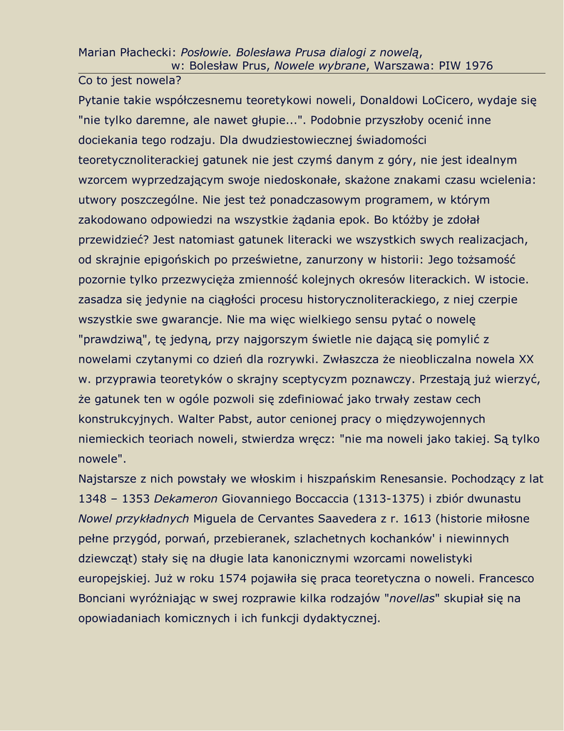 Marian Płachecki: Posłowie. Bolesława Prusa dialogi z nowelą, w: Bolesław Prus, Nowele wybrane, Warszawa: PIW 1976 Co to jest nowela? Pytanie takie współczesnemu teoretykowi noweli, Donaldowi LoCicero, wydaje się "nie tylko daremne, ale nawet głupie...". Podobnie przyszłoby ocenić inne dociekania tego rodzaju. Dla dwudziestowiecznej świadomości teoretycznoliterackiej gatunek nie jest czymś danym z góry, nie jest idealnym wzorcem wyprzedzającym swoje niedoskonałe, skażone znakami czasu wcielenia: utwory poszczególne. Nie jest też ponadczasowym programem, w którym zakodowano odpowiedzi na wszystkie żądania epok. Bo któżby je zdołał przewidzieć? Jest natomiast gatunek literacki we wszystkich swych realizacjach, od skrajnie epigońskich po prześwietne, zanurzony w historii: Jego tożsamość pozornie tylko przezwycięża zmienność kolejnych okresów literackich. W istocie. zasadza się jedynie na ciągłości procesu historycznoliterackiego, z niej czerpie wszystkie swe gwarancje. Nie ma więc wielkiego sensu pytać o nowelę "prawdziwą", tę jedyną, przy najgorszym świetle nie dającą się pomylić z nowelami czytanymi co dzień dla rozrywki. Zwłaszcza że nieobliczalna nowela XX w. przyprawia teoretyków o skrajny sceptycyzm poznawczy. Przestają już wierzyć, że gatunek ten w ogóle pozwoli się zdefiniować jako trwały zestaw cech konstrukcyjnych. Walter Pabst, autor cenionej pracy o międzywojennych niemieckich teoriach noweli, stwierdza wręcz: "nie ma noweli jako takiej. Są tylko nowele". Najstarsze z nich powstały we włoskim i hiszpańskim Renesansie. Pochodzący z lat 1348 – 1353 Dekameron Giovanniego Boccaccia (1313-1375) i zbiór dwunastu Nowel przykładnych Miguela de Cervantes Saavedera z r. 1613 (historie miłosne pełne przygód, porwań, przebieranek, szlachetnych kochanków' i niewinnych dziewcząt) stały się na długie lata kanonicznymi wzorcami nowelistyki europejskiej. Już w roku 1574 pojawiła się praca teoretyczna o noweli. Francesco Bonciani wyróżniając w swej rozprawie kilka rodzajów "novellas" skupiał się na opowiadaniach komicznych i ich funkcji dydaktycznej. Marian Płachecki: Posłowie. Bolesława Prusa dialogi z nowelą s. 2 / 36 Prawodawcy oświeceniowej kultury literackiej nie mogli przystać na propozycje uzupełnienia nowelą starożytnego zestawu gatunków. Pożądali klasyczności czystej, antycznej; a starożytność nie znała noweli jako gatunku odrębnego. Dopiero więc około roku 1800 napłynęła do Europy nowa fala pisarskiego i teoretycznego zainteresowania nowelą. Fala ściśle związana z przełomem romantycznym. Rzec by można, iż gatunek ów – w nowej wersji – stał się, obok powieści w Niemczech a dramatu we Francji, znakiem rozpoznawczym wstępującego romantyzmu zachodniego. Daty startowe romantyzmu są też datami odrodzenia noweli. W roku 1795, od którego umownie liczy się okres romantyzmu w Niemczech, ukazał się cykl nowel Goethego Rozrywki uciekinierów niemieckich: uchodźcy z tumultu Rewolucji Francuskiej kolejno wygłaszają swe opowiadania. Wraz z nowelami włączonymi do Lat nauki Wilhelma Meistra (1795 – 1796) utwory te stały się kluczową tradycją dla niemieckiej nowelistyki romantycznej. Jej największe nazwiska to Christoph Martin Wieland (1733 – 1813), Ludwig Tieck (1773 – 1853), Heinrich von Kleist (1777 – 1811). Jako punkt graniczny romantyzmu we Francji przyjmuje się rok 1820. I tutaj wraz z przełomem romantycznym nasiliła się moda na nowelę, popularną zresztą – podobnie jak we Włoszech i Anglii – już od początku stulecia. Ćwierć wieku "opóźnienia" narzuciło romantycznym francuskim ujęciom noweli zależność od teorii niemieckich. We francuskiej terminologii literaturoznawczej rozróżnianie: opowiadanie – nowela powieść utrwaliło się od połowy XIX w.. Jeśli w zakresie tradycji teoretycznej nowelistyka francuska ustępuje niemieckiej, to dorównuje jej z pewnością poziomem artystycznym. Chodzi tu zwłaszcza o dorobek Prospera Merimee (1803 – 1870), Teofila Gautier (1811 – 1872), Guy de Maupassanta (1850 – 1893). Również dziewiętnastowieczna literatura rosyjska dziełami Mikołaja Leskowa (1831 – 1895), Mikołaja Gogola (1809 – 1 852), Antoniego Czechowa (1860 – 1904), Iwana Turgieniewa (1818 – 1883) wniosła trwały wkład w historię noweli europejskiej. W Polsce nowela stała się popularna dopiero po powstaniu styczniowym, a nawet po roku 1870. Dlaczego tak późno? Dotychczas nie pytano o to zbyt uporczywie; w Marian Płachecki: Posłowie. Bolesława Prusa dialogi z nowelą s. 3 / 36 ogóle historia noweli polskiej czeka jeszcze na swoich autorów. Przyczyn [295/297] było wiele. Nie mieliśmy prawie noweli romantycznej. Z pewnością dlatego głównie, że w historii Polski rok 1795 zapisał się inaczej niż w historii Niemiec. Sytuacja niewoli politycznej na długo stłumiła atrakcyjność wszelkich "niskich", zabawowych wzorów uczestnictwa w kulturze, poczynając od dziedziny ubiorów, a na "lekkich" gatunkach literackich kończąc. Europejska nowela owoczesna nie była zaś gatunkiem wysokim, hieratycznym, stosownym do przedstawiania postaci i spraw najwyższej rangi. Zresztą bywa nim tylko w bardzo specjalnych warunkach. Nie zmieściła się w strojonym na wysoką nutę romantycznym panteonie polskim. Nie zmieściła się także ze względu na ogólniejszą niechęć pierwszego pokolenia romantyków polskich do prozy narracyjnej (co jednak nie dotyczy młodego Krasińskiego). Na ogół bogata korespondencja dawała ujście ich skłonnościom narracyjnym. Autorytet, jakim najwięksi cieszyli się wśród międzypowstaniowej publiczności literackiej, również nie ułatwiał popularyzacji noweli. Charakterystyczne, że gatunek ten uprawiał Cyprian Norwid na emigracji, całkowicie zapomniany przez krajową opinię literacką. W obrębie romantyzmu krajowego ten zakres krótkich form prozy, 