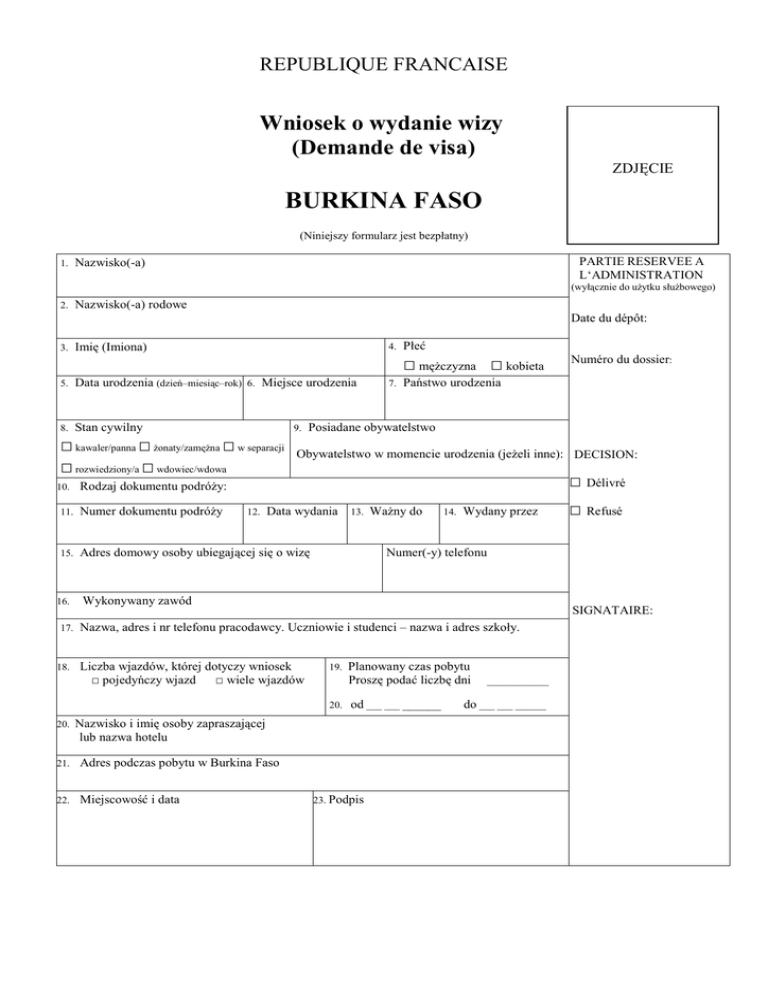 REPUBLIQUE FRANCAISE Wniosek o wydanie wizy (Demande de visa) ZDJĘCIE BURKINA FASO (Niniejszy formularz jest bezpłatny) 1. PARTIE RESERVEE A L‘ADMINISTRATION Nazwisko(-a) (wyłącznie do uŜytku słuŜbowego) 2. Nazwisko(-a) rodowe Date du dépôt: 3. Imię (Imiona) 4. Płeć □ męŜczyzna □ kobieta 5. Data urodzenia (dzień–miesiąc–rok) 6. Miejsce urodzenia 8. Stan cywilny 9. □ kawaler/panna □ Ŝonaty/zamęŜna □ w separacji □ rozwiedziony/a □ wdowiec/wdowa 10. Obywatelstwo w momencie urodzenia (jeŜeli inne): DECISION: 15. Adres domowy osoby ubiegającej się o wizę 18. □ Délivré Rodzaj dokumentu podróŜy: Numer dokumentu podróŜy 17. 12. Data wydania 13. WaŜny do 14. Wydany przez Wykonywany zawód SIGNATAIRE: Nazwa, adres i nr telefonu pracodawcy. Uczniowie i studenci – nazwa i adres szkoły. Liczba wjazdów, której dotyczy wniosek □ pojedyńczy wjazd □ wiele wjazdów 19. Planowany czas pobytu Proszę podać liczbę dni od ___ ___ ______ Nazwisko i imię osoby zapraszającej lub nazwa hotelu 21. Adres podczas pobytu w Burkina Faso 22. Miejscowość i data □ Refusé Numer(-y) telefonu 20. 20. Państwo urodzenia Posiadane obywatelstwo 11. 16. 7. Numéro du dossier: 23. Podpis ____________ do ___ ___ ______