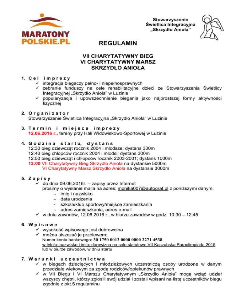 Stowarzyszenie Świetlica wietlica Integracyjna „Skrzydło Anioła” REGULAMIN VII CHARYTATYWNY BIEG VI VII CHARYTATYWNY MARSZ SKRZYDŁO ANIOŁA 1. C e l imprezy integracja biegaczy pełnopełno i niepełnosprawnych zebranie funduszy na cele rehabilitacyjne dzieci ze Stowarzyszenia Świetlicy Integracyjnej „Skrzydło Anioła” w Luzinie popularyzacja i upowszechnienie biegania jako najprostszej formy aktywności aktywno fizycznej 2. O r g a n i z a t o r Stowarzyszenie Świetlica wietlica Integracyjna „Skrzydło Anioła” w Luzinie 3. T e r m i n i m i e j s c e i m p r e z y 12.06.2016 r., tereny przy Hali Widowiskowo-Sportowej Widowiskowo w Luzinie 4. G o d z i n a s t a r t u, d y s t a n s 12:30 bieg dziewcząt ąt rocznik 2004 i młodsze; dystans 300m 12:40 bieg chłopców rocznik 2004 i młodsi; dystans 300m 12:50 bieg dziewcząt ąt i chłopców rocznik 2003-2001; 2003 ; dystans 1000m 13:00 VIII Charytatywny Bieg Skrzydło Anioła na dystansie 5000m VI Charytatywny Marsz Skrzydło Anioła na dystansie 3000m 5. Z a p i s y do dnia 09.06.2016r. r. – zapisy przez Internet prosimy o wysłanie maila na adres: adres [email protected] z poniższymi danymi ∼ imię ę i nazwisko ∼ data urodzenia ∼ szkoła/klub sportowy/miejsce zamieszkania ∼ adres zamieszkania, adres e-mail w dniu zawodów, 12.06.2016 r., w biurze zawodów w godz. 10:30 – 12:45 6. W p i s o w e wysokość wpisowego jest dobrowolna można uiszczaćć je przelewem: Numer konta bankowego: 30 1750 0012 0000 0000 2271 4538 w tytule: nazwisko i imię; imię; darowizna na cele statutowe VII Kaszubska Paraolimpiada 2015 lub w biurze zawodów, w dniu startu 7. W a r u n k i u c z e s t n i c t w a w biegach dziecięcych ęcych i młodzieżowych młodzie uczestniczą ą osoby urodzone w danym przedziale wiekowym za zgodą zgod rodziców/opiekunów prawnych w VII Biegu i VI Marszu Charytatywnym „Skrzydło Anioła” mogą mog wziąć udział wszyscy chętni, ętni, tni, którzy zgłosili swój udział i zostali wpisani na listę list uczestników biegu zgodnie z pkt.5 regulaminu do biegu i marszu zostaną dopuszczone osoby, które podpiszą zaświadczenie o braku przeciwwskazań zdrowotnych do startu na dystansie 5 lub 3km; na start zawodnika poniżej 18 roku życia pisemną zgodę powinien podpisać rodzic/opiekun prawny; w przypadku zgłoszeń grupowych za sprawdzenie zaświadczeń lekarskich odpowiedzialny jest opiekun grupy uczestnik VI Marszu Charytatywnego „Skrzydło Anioła” jest zobowiązany do posiadania własnych kijków; w trakcie trwania marszu obowiązuje całkowity zakaz „podbiegania” zawodnicy startują na własną odpowiedzialność; organizator nie ponosi odpowiedzialności za urazy powstałe w wyniku udziału w biegu lub marszu jeżeli chciałbyś z nami pobiec ale tego dnia nie możesz przyjechać do Luzina napisz maila na adres: [email protected] 8. K l a s y f i k a c j a, n a g r o d y i w y r ó ż n i e n i a bieg dziewcząt 2004 i młodsze – 3 pierwsze dziewczęta na mecie – statuetki i dyplomy bieg chłopców 2004 i młodsi – 3 pierwszych chłopców na mecie – statuetki i dyplomy bieg dziewcząt i chłopców 2003-2001 – 3 pierwsze dziewczęta i 3 pierwszych chłopców – statuetki i dyplomy osobna klasyfikacja kobiet i mężczyzn w VII Biegu Charytatywnym i VI Marszu Charytatywnym „Skrzydło Anioła” dla pierwszych 200 uczestników pamiątkowy medal wszyscy uczestnicy biegu i marszu otwartego na mecie otrzymują pamiątkowego aniołka dla wszystkich uczestników przewidziany jest słodki poczęstunek i kawa/herbata za zajęcie miejsc I-III w klasyfikacji kobiet i mężczyzn VII Biegu i VI Marszu Charytatywnego „Skrzydło Anioła” pamiątkowe puchary i dyplomy pamiątkowa koszulka dla pierwszych 114 uczestników VII Charytatywnego Biegu oraz 3 pierwszych kobiet i mężczyzn VI Charytatywnego Marszu „Skrzydło Anioła” puchar dla najstarszego zawodnika i najstarszej zawodniczki VII Biegu i VI Marszu Charytatywnego „Skrzydło Anioła” 9. I n n e postanowienia zabroniony jest start w kolcach organizator zapewnia szatnie i natryski interpretacja niniejszego regulaminu należy wyłącznie do Organizatora i Sędziego Głównego zawodów informacje dotyczące biegu można uzyskać pod numerem telefonu: 692109021, 660572461 lub wysyłając maila na adres: [email protected] za rzeczy zgubione organizator nie odpowiada SERDECZNIE ZAPRASZAMY Organizatorzy biegu