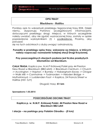 OPIS TRASY Blackburn - Halifax Poniższy opis to wskazówki przebiegu tegorocznej trasy EDK. Dzięki niemu, dysponują Państwo szczegółowymi informacjami, dotyczącymi przebiegu drogi. Miejsca, w których szczególnie należy uważać, aby nie zgubić wyznaczonej trasy, zostały w opisie poprzedzone wykrzyknikiem (!) i podkreślone. Prosimy, aby poruszać się na tych odcinkach z dużą uwagą i ostrożnością. Ponadto w przebiegu opisu trasy, wskazane są miejsca, w których należy rozpocząć rozważanie kolejnej stacji Drogi Krzyżowej. Przy poszczególnych stacjach podana jest liczba przebytych kilometrów od Blackburn. CAŁA TRASA: Kaplica pw. N.M.P Królowej Polski przy 44 Preston New Road w Blackburn (BB2 6AH) -> Blackburn Centrum -> Church -> Accrington -> Hapton -> Burnley -> Habergham Eaves -> Clivigar -> Walk Mill -> Cornholme -> Todmorden -> Hebden Bridge -> Mytholmroyd -> Luddenden Foot -> Kaplica, 24 Francis Street w Halifax (HX1 5JY) Długość trasy: 51 km Sporządzono 1.03.2015 POSZCZEGÓLNE ODCINKI TRASY Kaplica p. w. N.M.P. Królowej Polski, 44 Preston New Road w Blackburn BB2 6AH I stacja – na parkingu przy Polskim Ośrodku - (0 km) Trasa Blackburn - Halifax EDK Blackburn Strona 1 z 5 1. Kieruj się Preston New Rd/A677 na południowy wschód w kierunku centrum · 120 m 2. Prosto przez skrzyżowanie z drogą szybkiego ruchu w stronę centrum · 110 m ! 3. Skręć w prawo na Northgate · 350 m ! 4. Po przejściu pod wiaduktem, skręć w lewo na Astley Gate, która przechodzi w Darwen St · 160 m II stacja – przy katedrze, Cathedral Close, Blackburn, BB1 5AA (800 metrów) ! 5. Wyrusz na północny-wschód, chodnikiem przez park w kierunku Shopping Centre · 100 m 6. Skręć w prawo na Church Street · 70 m 8. Prosto przez skrzyżowanie na Salford, która przechodzi w Eanam · 450 m 9. Na dużym rondzie kieruj się w prawo na górę, wzdłuż Higher Eanam/A6078, kierunek na Accrington · 400 m 10. Kontynuuj wzdłuż Accrington Rd/A679 , która za Blackburn przechodzi w Blackburn Rd · 4.2 km ! 11. W miejscowości Church, na drugich światłach, idź w prawo wzdłuż Blackburn Road w stronę centrum · 1.5 km 12. Za wiaduktem kolejowym, w prawo po łuku (Eagle St) i skręć w lewo, w pierwszą ulicę (Willow St), następnie idź nią do końca. · 140 m III stacja - po prawej stronie na dużym placu przy starym kościele Saint James, Saint James St, Accrington, BB5 1LY- (8.9km) ! 13. Wróc na Willow St, skręć w lewo na Saint James St i przejdź nią prosto przez centrum, która zmienia nazwę najpierw na Broadway a później na Burnley Rd · 400 m 14. Przejdź prosto na drugą stronę drogi szybkiego ruchu a następnie idź wzdłuż Burnley Rd/A679 · 1.1 km IV stacja - przed cmentarzem, Burnley Rd, Accrington, BB5 6HA – (10.5 km) Trasa Blackburn - Halifax EDK Blackburn Strona 2 z 5 15. Idź dalej prosto wzdłuż drogi A679 · 1.3 km 16. Na rondzie za stacją paliw, skręć w prawo pod wiaduktem autostrady · 3.1 km 16. Mijamy wioskę Hapton, na kolejnym rondzie lekko w prawo na Accrington Rd / A679 · 1.1 km 17. Na światłach drogowych w prawo w Rossendale Rd/A646 · 250 m V stacja - pod kościołem St. Mark the Evengalist, Rossendale Rd, Burnley, BB11 5DQ – (16.4 km) 18. Idź dalej prosto Rossndale Rd/A646 · 1.5 km VI stacja - na wzgórzu, po prawej stronie, tuż przed miejscowością Habergham Eaves, Rossendale Rd, Burnley, BB11 5JA – (17.9 km) 19. Idź dalej prosto A646 · 1.1 km !20.Na rozwidleniu z Glen View, trzymaj się prawej strony · 2.6 km 21 Po dojściu do końca drogi, skręć w prawo na Todmorden Rd A646/A671 · 120 m ! 22 Na rozwidleniu, trzymaj się lewej A646 · 3.3 km VII stacja - pod kościołem St. John the Divine, Burnley Rd, Cliviger, BB10 4SU - (24 km) ! 23. Idź dalej prosto A646, uwaga wąski chodnik • 4.5 km VIII stacja - pod kościołem St. Michael & All Angeles, Todmorden, OL14 8LF - (28.6 km) 24. Idź dalej A646 w kierunku Todmorden · 3.5 km !25. W centrum, skręć w prawo na Wellington Rd · 70 m IX stacja przy kościele RC St. Joseph's, Wellington Rd, Todmorden, OL14 5HL – (32 km) 26. Wróć do głównej drogi A646, podążaj dalej w tym samym kierunku co poprzednio · 110 m Trasa Blackburn - Halifax EDK Blackburn Strona 3 z 5 !27. Na rondzie, skręć w lewo na Stansfield Rd i zaraz za przystankiem w prawo, w kierunku wiaduktu kolejowego, dróżką nad rzeką River Calder, która przechodzi w Halloroyd Crescent · 600 m !28. Na łuku między blokami (14 Halloroyd Crescent), skręć w prawo na drogę rowerową w kierunku Halifax Rd/A646 · 60 m 29. W prawo na most i za mostem skręcić w Key Sike Ln · 170 m 30. Przed mostem skręć w lewo w ścieżkę koło Rochdale Canal · 14,6 km Stacje X, XI, XII prosimy odprawiać mniej więcej co 1 godzinę, zaczynając nie długo po wejściu na ścieżkę 31. Na końcu kanału skręć w prawo w Tuel Lane · 70 m 32. Na pierwszym skrzyżowaniu w lewo w Wharf St · 550 m 33. Na rondzie, pierwszym zjazdem w Pye Nest Rd/A6142 · 30 m XIII stacja - przy kościele Sacred Heart, Bolton Brow, Sowerby Bridge, HX6 2BA - (48 km) 34. Wyrusz na wschód przez Pye Nest Rd/A6142, w kierunku Norland View · 800 m 35. Ostro w prawo na Rochdale Rd/A58 · 450 m 36.Skręć łagodnie w lewo, pozostając na Rochdale Rd/A58 · 160 m 37.Skręć w lewo na King Cross Rd · 650 m !38. Skręć w lewo na Lemington Ave · 30 m 39. Skręć w prawo w kierunku Clapton Ave · 49 m 40. Skręć w lewo na Clapton Ave · 84 m 41. Skręć w prawo na Parkinson Ln · 17 m 42. Na rondzie pierwszy zjazd na Francis St, przejedź przez 1 rondo, kaplica będzie po lewej stronie · 450 m XIV stacja - przy kaplicy, 24 Francis Street w Halifax,HX1 5JY - (51 km) Trasa Blackburn - Halifax EDK Blackburn Strona 4 z 5 Ważne informacje: Royal Blackburn Hospital, Haslingden Road, Blackburn, BB2 3HH Emergency Department Reception - Royal Blackburn Hospital 01254 734023 Urgent Care Centre Reception - Royal Blackburn Hospital 01254 732