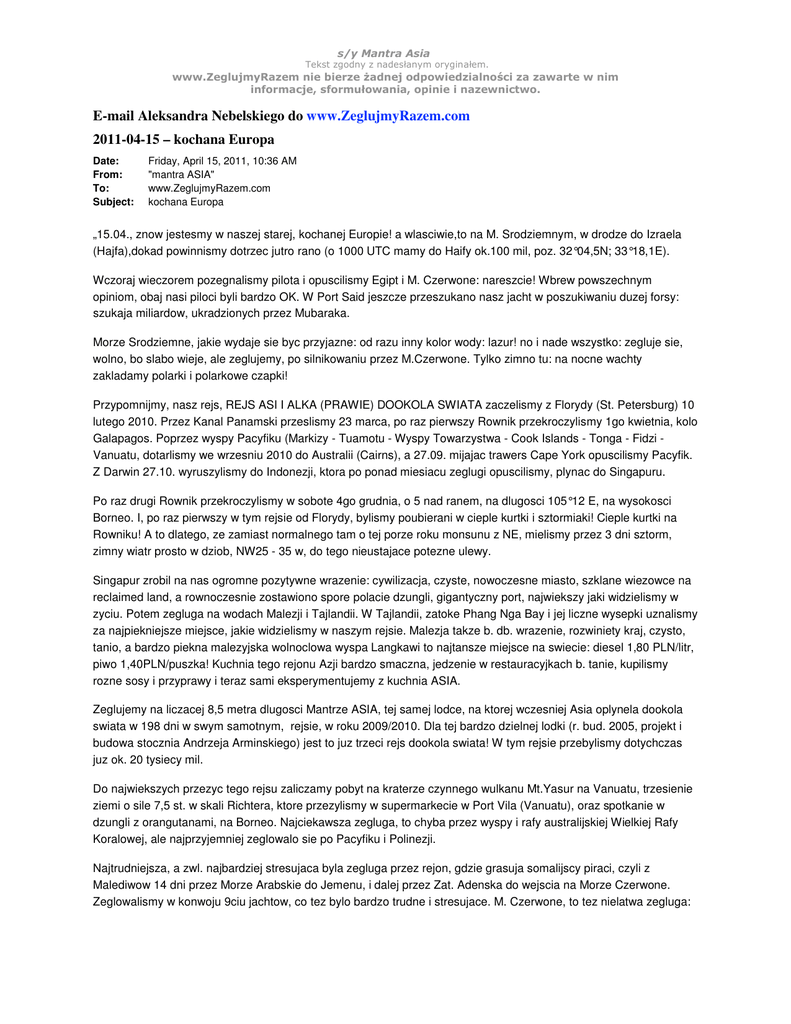 E-mail Aleksandra Nebelskiego do www.ZeglujmyRazem.com 2011-04-15 – kochana Europa Date: From: To: Subject: Friday, April 15, 2011, 10:36 AM "mantra ASIA" www.ZeglujmyRazem.com kochana Europa „15.04., znow jestesmy w naszej starej, kochanej Europie! a wlasciwie,to na M. Srodziemnym, w drodze do Izraela (Hajfa),dokad powinnismy dotrzec jutro rano (o 1000 UTC mamy do Haify ok.100 mil, poz. 32°04,5N; 33°18,1E). Wczoraj wieczorem pozegnalismy pilota i opuscilismy Egipt i M. Czerwone: nareszcie! Wbrew powszechnym opiniom, obaj nasi piloci byli bardzo OK. W Port Said jeszcze przeszukano nasz jacht w poszukiwaniu duzej forsy: szukaja miliardow, ukradzionych przez Mubaraka. Morze Srodziemne, jakie wydaje sie byc przyjazne: od razu inny kolor wody: lazur! no i nade wszystko: zegluje sie, wolno, bo slabo wieje, ale zeglujemy, po silnikowaniu przez M.Czerwone. Tylko zimno tu: na nocne wachty zakladamy polarki i polarkowe czapki! Przypomnijmy, nasz rejs, REJS ASI I ALKA (PRAWIE) DOOKOLA SWIATA zaczelismy z Florydy (St. Petersburg) 10 lutego 2010. Przez Kanal Panamski przeslismy 23 marca, po raz pierwszy Rownik przekroczylismy 1go kwietnia, kolo Galapagos. Poprzez wyspy Pacyfiku (Markizy - Tuamotu - Wyspy Towarzystwa - Cook Islands - Tonga - Fidzi Vanuatu, dotarlismy we wrzesniu 2010 do Australii (Cairns), a 27.09. mijajac trawers Cape York opuscilismy Pacyfik. Z Darwin 27.10. wyruszylismy do Indonezji, ktora po ponad miesiacu zeglugi opuscilismy, plynac do Singapuru. Po raz drugi Rownik przekroczylismy w sobote 4go grudnia, o 5 nad ranem, na dlugosci 105°12 E, na wysokosci Borneo. I, po raz pierwszy w tym rejsie od Florydy, bylismy poubierani w cieple kurtki i sztormiaki! Cieple kurtki na Rowniku! A to dlatego, ze zamiast normalnego tam o tej porze roku monsunu z NE, mielismy przez 3 dni sztorm, zimny wiatr prosto w dziob, NW25 - 35 w, do tego nieustajace potezne ulewy. Singapur zrobil na nas ogromne pozytywne wrazenie: cywilizacja, czyste, nowoczesne miasto, szklane wiezowce na reclaimed land, a rownoczesnie zostawiono spore polacie dzungli, gigantyczny port, najwiekszy jaki widzielismy w zyciu. Potem zegluga na wodach Malezji i Tajlandii. W Tajlandii, zatoke Phang Nga Bay i jej liczne wysepki uznalismy za najpiekniejsze miejsce, jakie widzielismy w naszym rejsie. Malezja takze b. db. wrazenie, rozwiniety kraj, czysto, tanio, a bardzo piekna malezyjska wolnoclowa wyspa Langkawi to najtansze miejsce na swiecie: diesel 1,80 PLN/litr, piwo 1,40PLN/puszka! Kuchnia tego rejonu Azji bardzo smaczna, jedzenie w restauracyjkach b. tanie, kupilismy rozne sosy i przyprawy i teraz sami eksperymentujemy z kuchnia ASIA. Zeglujemy na liczacej 8,5 metra dlugosci Mantrze ASIA, tej samej lodce, na ktorej wczesniej Asia oplynela dookola swiata w 198 dni w swym samotnym, rejsie, w roku 2009/2010. Dla tej bardzo dzielnej lodki (r. bud. 2005, projekt i budowa stocznia Andrzeja Arminskiego) jest to juz trzeci rejs dookola swiata! W tym rejsie przebylismy dotychczas juz ok. 20 tysiecy mil. Do najwiekszych przezyc tego rejsu zaliczamy pobyt na kraterze czynnego wulkanu Mt.Yasur na Vanuatu, trzesienie ziemi o sile 7,5 st. w skali Richtera, ktore przezylismy w supermarkecie w Port Vila (Vanuatu), oraz spotkanie w dzungli z orangutanami, na Borneo. Najciekawsza zegluga, to chyba przez wyspy i rafy australijskiej Wielkiej Rafy Koralowej, ale najprzyjemniej zeglowalo sie po Pacyfiku i Polinezji. Najtrudniejsza, a zwl. najbardziej stresujaca byla zegluga przez rejon, gdzie grasuja somalijscy piraci, czyli z Malediwow 14 dni przez Morze Arabskie do Jemenu, i dalej przez Zat. Adenska do wejscia na Morze Czerwone. Zeglowalismy w konwoju 9ciu jachtow, co tez bylo bardzo trudne i stresujace. M. Czerwone, to tez nielatwa zegluga: 2 od wybrzezy Sudanu wiatr zawsze polnocny, czyli w dziob, duza fala, wiec zegluje sie czekajac w portach lub na kotwicowiskach na rafie az wiatr ucichnie. Czyli, duzo czekania, ale tez ciekawego snorkelowania na rafie. Z kolei na wodach Indonezji generalnie brak jest wiatru, a pomiedzy wyspami wystepuja bardzo silne i o zmiennych kierunkach prady i wiry, czesto tak silne, ze na naszym silniku nie dawalismy rady posuwac sie do przodu! Za najpiekniejsze miejsce na naszej trasie uwazamy tajlandzka zatoke Ao Phang Nga (w rejonie Phuket) i jej setki wysepek, ale ogromnie podobala nam sie takze Australia, i parki narodowe w Terytorium Polnocnym. No i wyspy Pacyfiku, Fatu Hiva i inne!... Najbardziej egzotyczne miejsce, jakie odwiedzilismy, to Port Suakin w Sudanie: totalne sredniowiecze, ale ludzie nieslychanie mili i zyczliwi. Z kolei, najokropniejsi ludzie i urzednicy, najgorsi oszusci i naciagacze, najgorsza bezsensowna i kosztowna biurokracja to Egipt, szczesliwi wiec jestesmy, ze juz opuscilismy ten kraj, skadinad ciekawy (widzielismy piramidy, mumie i skarby Tutenhamona), ale tez kraj to straszliwie zasmiecony. Przez Morze Czerwone plynelismy poltora miesiaca. I cieszymy sie, ze Egipt i Egipcjanie juz za nami: M. Czerwone, to nielatwa zegluga, glownie silnikowanie - od wybrzezy Sudanu wiatr zawsze polnocny, czyli w dziob, czesto silny, zbyt silny na silnikowanie, duza fala, wiec zegluje sie czekajac w portach lub na kotwicowiskach na rafie az wiatr ucichnie. Czyli, duzo czekania, ale tez ciekawego snorkelowania na rafie. I ciekawe kraje: najbardziej egzotyczne miejsce, jakie odwiedzilismy, to Port Suakin w Sudanie: totalne sredniowiecze, ale ludzie nieslychanie mili i zyczliwi. Mile zaskoczenie to Erytrea: mala Italia w Afryce, jedyny kraj od Malediwow, gdzie mozna bylo wypic piwo. Brak piwa w tym rejonie, to tez nieprzyjemna dolegliwosc... w Egipcie piwo jest tylko tam, gdzie turysci. Teraz przed nami Izrael (Hajfa) - Cypr - Kreta i wyspy greckie wokol Peloponezu, Chorwacja i Adriatyk, gdzie we wloskim porcie Monfalcone ok. polowy czerwca 2011 planujemy zakonczyc nasz rejs, a Mantra ASIA tym samym zaliczy tam swoje trzecie kolko dookola swiata! Wiecej aktualnych info o naszym rejsie: www.rejs-asiapajk