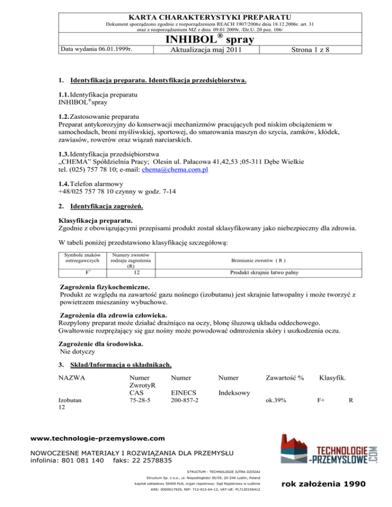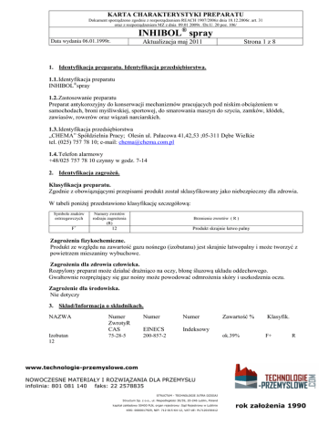 KARTA CHARAKTERYSTYKI PREPARATU Dokument sporządzono zgodnie z rozporządzeniem REACH 1907/2006z dnia 18.12.2006r. art. 31 oraz z rozporządzeniem MZ z dnia 09.01 2009r. /Dz.U. 20 poz. 106/ INHIBOL® spray Data wydania 06.01.1999r. Aktualizacja maj 2011 Strona 1 z 8 1. Identyfikacja preparatu. Identyfikacja przedsiębiorstwa. 1.1. Identyfikacja preparatu INHIBOL®spray 1.2. Zastosowanie preparatu Preparat antykorozyjny do konserwacji mechanizmów pracujących pod niskim obciążeniem w samochodach, broni myśliwskiej, sportowej, do smarowania maszyn do szycia, zamków, kłódek, zawiasów, rowerów oraz wiązań narciarskich. 1.3. Identyfikacja przedsiębiorstwa „CHEMA” Spółdzielnia Pracy; Olesin ul. Pałacowa 41,42,53 ;05-311 Dębe Wielkie tel. (025) 757 78 10; e-mail: [email protected] 1.4. Telefon alarmowy +48/025 757 78 10 czynny w godz. 7-14 2. Identyfikacja zagrożeń. Klasyfikacja preparatu. Zgodnie z obowiązującymi przepisami produkt został sklasyfikowany jako niebezpieczny dla zdrowia. W tabeli poniżej przedstawiono klasyfikację szczegółową: Symbole znaków ostrzegawczych F+ Numery zwrotów rodzaju zagrożenia (R) Brzmienie zwrotów ( R ) 12 Produkt skrajnie łatwo palny Zagrożenia fizykochemiczne. Produkt ze względu na zawartość gazu nośnego (izobutanu) jest skrajnie łatwopalny i może tworzyć z powietrzem mieszaniny wybuchowe. Zagrożenia dla zdrowia człowieka. Rozpylony preparat może działać drażniąco na oczy, błonę śluzową układu oddechowego. Gwałtownie rozprężający się gaz nośny może powodować odmrożenia skóry i uszkodzenia oczu. Zagrożenie dla środowiska. Nie dotyczy 3. Skład/Informacja o składnikach. NAZWA Numer ZwrotyR CAS Numer Numer EINECS Indeksowy Izobutan 12 75-28-5 200-857-2 Zawartość % Klasyfik. ok.39% F+ R www.technologie-przemyslowe.com NOWOCZESNE MATERIAŁY I ROZWIĄZANIA DLA PRZEMYSŁU infolinia: 801 081 140 faks: 22 2578835 STRUCTUM - TECHNOLOGIE JUTRA DZISIAJ Structum Sp. z o.o., ul. Niepodległości 30/59, 20-246 Lublin, Poland kapitał zakładowy 50400 PLN, organ rejestrowy: Sąd Rejestrowy w Lublinie KRS: 0000017929, NIP: 712-015-64-12, VAT-UE: PL7120156412 rok założenia 1990 KARTA CHARAKTERYSTYKI PREPARATU Dokument sporządzono zgodnie z rozporządzeniem REACH 1907/2006z dnia 18.12.2006r. art. 31 oraz z rozporządzeniem MZ z dnia 09.01 2009r. /Dz.U. 20 poz. 106/ INHIBOL® spray Data wydania 06.01.1999r. Aktualizacja maj 2011 Destylaty lekkie 64742-31-0 65 zobojętnione chemicznie (ropa naftowa) frakcjanaftowa niespecyfikowana Rozpuszczalnik organiczny 64742-48-9 10, 65,66 Strona 2 z 8 265-132-5 649-421-00-7 ok. 5,5% Xn R: 265-150-3 649-327-00-6 ok. 6% Xn R: 4. Pierwsza pomoc. W większości przypadków nie jest wymagana natychmiastowa interwencja lekarska. Zatrucie inhalacyjne: Wyprowadzić poszkodowanego na świeże powietrze. W przypadku braku szybkiej poprawy zasięgnąć porady lekarza. Zatrucie doustne: Nie powodować wymiotów. Nie podawać mleka, tłuszczów i alkoholu. W przypadku utraty przytomności postępować jak w zatruciu drogą oddechową. Wezwać jak najszybciej lekarza. Skażenie oczu: Przemywać oczy dużą ilością wody, przez co najmniej 15 minut. W trakcie przemywania powieki należy utrzymywać lekko odciągnięte i otwarte. Stosować łagodny strumień wody. Zwrócić się o pomoc lekarską. Skażenie skóry: Jak najszybciej zdjąć skażoną odzież. Przemywać skórę dużą ilością wody z mydłem. 5. Postępowanie w przypadku pożaru. Zalecenia ogólne: Produkt skrajnie łatwo palny. Tworzy z powietrzem mieszaniny wybuchowe. Jest cięższy od powietrza i gromadzi się przy ziemi oraz w dolnych partiach pomieszczeń. Opakowania aerozolowe narażone na działanie wysokich temperatur i ognia mogą eksplodować. Zawiadomić otoczenie o awarii. Usunąć z rejonu zagrożenia wszystkie osoby niebiorące udziału w akcji gaśniczej. W razie potrzeby zarządzić ewakuację, powiadomić Państwową Straż Pożarną, a w razie konieczności władze terenowe i najbliższą jednostkę Ratownictwa Chemicznego. Właściwe środki gaśnicze Piany gaśnicze odporne na działanie alkoholi, suche środki gaśnicze, dwutlenek węgla, rozpylona woda. Niewielki pożar gasić gaśnicą śniegową lub proszkową. Niewłaściwe środki gaśnicze Woda podawana silnym strumieniem. Szczególne zagrożenia Podczas pożaru w wyniku spalania lub termicznego rozkładu produktu mogą wydzielać się toksyczne gazy i dymy. www.technologie-przemyslowe.com NOWOCZESNE MATERIAŁY I ROZWIĄZANIA DLA PRZEMYSŁU infolinia: 801 081 140 faks: 22 2578835 STRUCTUM - TECHNOLOGIE JUTRA DZISIAJ Structum Sp. z o.o., ul. Niepodległości 30/59, 20-246 Lublin, Poland kapitał zakładowy 50400 PLN, organ rejestrowy: Sąd Rejestrowy w Lublinie KRS: 0000017929, NIP: 712-015-64-12, VAT-UE: PL7120156412 rok założenia 1990 KARTA CHARAKTERYSTYKI PREPARATU Dokument sporządzono zgodnie z rozporządzeniem REACH 1907/2006z dnia 18.12.2006r. art. 31 oraz z rozporządzeniem MZ z dnia 09.01 2009r. /Dz.U. 20 poz. 106/ INHIBOL® spray Data wydania 06.01.1999r. Aktualizacja maj 2011 Strona 3 z 8 Opakowania znajdujące się w pobliżu strefy pożaru należy chłodzić rozproszonym strumieniami wody. Sprzęt ochronny dla strażaków W przypadku niepotwierdzenia braku zagrożenia zapewnić aparaty izolujące drogi oddechowe. Stosować pożarnicze ubrania bojowe jako zabezpieczenie podstawowe. Nie dopuścić do przedostania się wody gaśniczej do kanalizacji. 6. Postępowanie w przypadku niezamierzonego uwolnienia do środowiska. Zalecenia ogólne Zawiadomić otoczenie o awarii. Usunąć z obszaru zagrożenia wszystkie osoby nie biorące udziału w likwidacji skutków zdarzenia. W razie konieczności zarządzić ewakuację. Wezwać Państwową Straż Pożarną, ekipy ratownicze oraz Policję Państwową. W akcji ratunkowej mogą brać udział jedynie osoby przeszkolone, wyposażone we właściwą odzież i sprzęt ochronny. Indywidualne śro