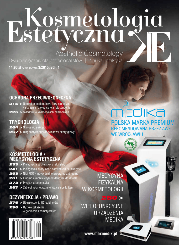 14,90 zł (w tym 8% VAT), 3/2015, vol. 4 OCHRONA PRZECIWSŁONECZNA 215 > Naturalne polifenolowe filtry słoneczne - starzenie fizjologiczne a fotostarzenie 225 > Składniki w kosmetykach ochronnych TRYCHOLOGIA 264 > O włos od sukcesu 267 > Diagnostyka chorób włosów i skóry głowy POLSKA MARKA PREMIUM REKOMENDOWANA PRZEZ AWF WE WROCŁAWIU KOSMETOLOGIA / MEDYCYNA ESTETYCZNA 233 241 253 261 273 287 > Pielęgnacja suchej skóry rąk i stóp > Pielęgnacja skóry osób narażonych na nikotynę > Nici PDO - indywidualne programy anti-aging > L’uomo e mobile czyli od dandysa do drwala > Przyjazna Kosmetyka > Zabiegi kosmetyczne w walce z cellulitem DEZYNFEKCJA / PRAWO 275 > Ubezpieczenia OC gabinetów 296 > Ryzyko zakażenia w gabinecie kosmetycznym MEDYCYNA FIZYKALNA W KOSMETOLOGII 280 > WIELOFUNKCYJNE URZĄDZENIA MEDIKA 3 / 2015 / vol. 4 www.maxmedik.plKosmetologia Estetyczna I II 3 / 2015 / vol. 4 Kosmetologia Estetyczna 3/2015 W numerze N aukowe •• KOSMETOLOGIA / MEDYCYNA ESTETYCZNA artykuły 225. Składniki stosowane w kosmetykach ochronnych 233. Pielęgnacja suchej skóry rąk i stóp 240. Likwidacja zmarszczek bez igły 235. Leczenie przebarwień. Przegląd metod Skin discoloration treatment. Survey of methods Natalia Galas 249. Skin Needling. Zastowowanie urządzeń do makijażu permanentnego w zabiegach kosmetycznych 253. Indywidualne programy anti-aging. Nici PDO 241. Zasady pielęgnacji skóry osób narażonych na nikotynę 261. L’uomo è mobile czyli od dandysa do drwala ART YKUŁ 273. Przyjazna Kosmetyka. Wywiad z Beatą Wątorowską A 280. Polskie kosmetyczne urządzenia wielofunkcyjne klasy premium Skin care rules for smokers Ewa Banasiak ART YKUŁ MEDYCYNA ESTET YCZNA 285. Kosmoceutyki w procesie kompleksowego modelowania sylwetki 287. Cellulit. Przegląd zabiegów kosmetycznych A KOSMETOLOGIA ESTET YCZNA 287. Cellulit. Przegląd zabiegów kosmetycznych Cellulite. Review of cosmetic treatments Justyna Marwicka, Kornelia Niemyska, Olga Cieślicka 193. Ryzyko zakażenia w gabinecie kosmetycznym skie… •• DERMATOLOGIA 215. Starzenie fizjologiczne a fotostarzenie się skóry. cznych ch klasy – konsekwencje cywilnoprawne Risk of infection in beauty parlor – civil law consequences Iwona Wrześniewska-Wal Naturalne polifenolowe filtry słoneczne 224. Przebarwieniom powiedz nie 235. Leczenie przebarwień. Przegląd metod 241. Pielęgnacja skóry osób narażonych na nikotynę Umożliwia to głębokie oczyszczenie skóry. Urządzenie pozwala również na wykonanie mikromasażu z użyciem mikroprądów McT, dzięki czemu uzyskujemy po- także po zakończeniu zabiegu. Zjawisko elektroporacji prawę wyglądu twarzy. Świetnie sprawdza się przy ni- •w• zabiegach TRYCHOLOGIA mezoterapii bezigłowej wsparte jest działa- welowaniu drobnych zmarszczek, cieni pod oczami, niem fali ultradźwiękowej. Poprawia ona przepuszczal- poprawia dotlenienie i odżywienie tkanek. 264. O włos od sukcesu. Trychologia w gabinecie beauty & spa Kombajny Medika mają także opcje, umożliwiające wykonanie oksybrazji, sonoforezy i bezinwazyjnej li- ność błon komórkowych, co ułatwia przenikanie substan- posukcji, opartej na działaniu ultradźwięków i podczer- cji, aDiagnostyka także odprowadzanie metabolitów. 267. chorób włosów i skóry głowy w praktyce Kombajny Medika oferu- wieni. Przynosi ona dobre efekty terapeutyczne, po- Czym jednak mezoterapia firmy Medika przewyższa ją także szereg innych zwalając jednocześnie uniknąć powikłań związanych inne urządzenia? Większość z nich wykorzystuje do możliwości. W module z zabiegami chirurgicznymi. trychologicznej eruje szereg inwa- pracy prąd zmienny o przebiegu sinusoidalnym, trójerunkowanych na kątnym i prostokątnym. Zwiększenie i zmniejszenie na•• DEZYNFEKCJA / PRAWO dmłodzenie. Alter- tężenia następuje w sposób stopniowy. W urządzeniu ewymagające ingeMedika prąd trójkątny wzrasta stopniowo, ale zmniej- gabinetów 275. Ubezpieczenia odpowiedzialności cywilnej owalniające zacho- szenie natężenia jest szybkie, a dodatkowo następuje kosmetycznych alające przedłużyć natychmiastowa zmiana kierunku jego przepływu. Taiałaniu substancji296. kie rozwiązanie poprawia jakość elektroporacji, zwiękRyzyko zakażenia w gabinecie kosmetycznym ykalnych, uspraw- sza i przedłuża efekty zabiegu, stając się doskonałą al– konsekwencje cywilnoprawne mórek skórnych. ternatywą dla inwazyjnych zabiegów medycznych. Temat z okładki fal radiowych, dodano wiązkę promieniowania laserowego o długości fali 650 Medika to marka polska, która tworzenie swojej aparatury oparła na wiedzy krajowych specjalistów. Dobre, bo polskie… nm, co znacznie poprawia efekt terapeutyczny i liftin- W ofercie znajdziemy nie tylko opisany kombajn, ale gujący. Terapia falami radiowymi uchodzi dziś za jeden także nowoczesną aparaturę do zabiegów termolizy Polski producent kosmetycznych urządzeń wielofunkcyjnych działywaniem światła laserowego zwiększa poprawy komfortu pracy i trwałości zastosowano obuklasy premium skuteczność i zapewnia długotrwałe efekty działania. dowy Corian, niehigroskopijne, odporne na ścieranie z najskuteczniejszych zabiegów kosmetycznych popra- i karboksyterapii. Sprzęt zbudowany jest na krajowych wiających owal twarzy i zwalczających nadmiar tkan- podzespołach, co znacznie ułatwia jego serwisowanie ki tłuszczowej. Połączenie jej z biostymulacyjnym od- i zapewnia niezmiennie wysoką jakość urządzeń. Dla i chemię, stosowaną w gabinetach kosmetycznych. Nie s. 280 dermabrazji a stałe do ofert gabi- Rozwiązanie firmy Me- ć się może, że w tym dika – Cellular Nutri Sys- coś innowacyjnego. tem – jest programem wej wzbogacony został ąc naprzeciw oczeki- autorskim, chronionym system Vacuum Control, smetologów. Innowacyjne rozwiązania, poparta bada- ntów, firma Medika patentem. Przy jego tworzeniu współpracowali pra- czyli kontrolą podciśnien
