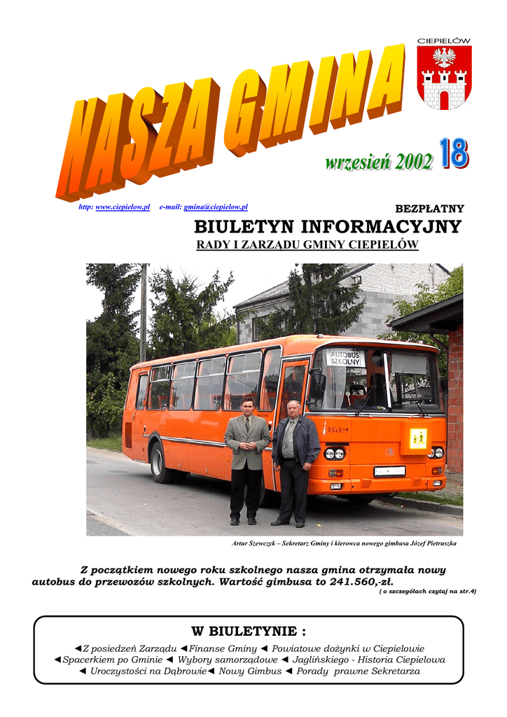http: www.ciepielow.pl e-mail: [email protected] BEZPŁATNY BIULETYN INFORMACYJNY RADY I ZARZĄDU GMINY CIEPIELÓW Artur Szewczyk – Sekretarz Gminy i kierowca nowego gimbusa Józef Pietruszka Z początkiem nowego roku szkolnego nasza gmina otrzymała nowy autobus do przewozów szkolnych. Wartość gimbusa to 241.560,-zł. ( o szczegółach czytaj na str.4) W BIULETYNIE : ◄Z posiedzeń Zarządu ◄Finanse Gminy ◄ Powiatowe dożynki w Ciepielowie ◄Spacerkiem po Gminie ◄ Wybory samorządowe ◄ Jaglińskiego - Historia Ciepielowa ◄ Uroczystości na Dąbrowie◄ Nowy Gimbus ◄ Porady prawne Sekretarza Z POSIEDZEŃ ZARZĄDU Podczas nieobecności Wójta Gminy, który od dnia 5 lipca br. przebywa na urlopie wypoczynkowym (obecnie od 18 lipca na zwolnieniu lekarskim), pod przewodnictwem Zastępcy Wójta Ryszarda Ścibisza przeprowadzono w miesiącu wrześniu dwa posiedzenia Zarządu Gminy. Na pierwszym z posiedzeń w dniu 13.09, Zarząd podjął uchwałę w sprawie dalszej obsługi dożywiania w PSP Wielgie przez personel obsługi filii przedszkola, przystąpiono do budowy remizy strażackiej w Antoniowie, złożono wniosek do programu SAPARD w sprawie budowy 1350 m. odcinka drogi przez Dąbrowę. Planowany koszt budowy tej drogi to ponad 300.000,-zł. Postanowiono, że; począwszy od dnia 1 października sukcesywnie będzie uruchamiane oświetlenie uliczne na terenie całej gminy. Na drugim z posiedzeń 27.09., podpisano umowę na budowę drogi w Wielgiem w kierunku Borowca, dokonano zmian w budżecie gminy w związku z podwyższeniem płac dla nauczycieli, ustalono jednakowe dla wszystkich nauczycieli i osób obsługi szkół i przedszkoli zasady odpłatności za dożywianie, od dnia 1 października wszyscy nauczyciele i osoby pracujące w obsłudze będą płacili za spożywane w szkole posiłki 105% kosztów ponoszonych na dożywianie. Na terenie gminy rozwożona jest ostatnia w tym roku „szlaka”, na drogach gminnych pracuje także równiarka. FINANSE GMINY - rozstrzygnięto przetarg nieograniczony na obsługę bankową budżetu gminy Ciepielów w latach 2003 – 2005. W przetargu udział wzięły dwa banki, Spółdzielczy w Iłży i Spółdzielczy w Zwoleniu Oddział w Ciepielowie. Oferty Banku Czcionka pogrubiona – Bank Spółdzielczy w Zwoleniu Oddział w Ciepielowie I. oprocentowanie środków pieniężnych gromadzonych na rachunkach bieżących : 6,0% / 4,0% II. koszty obsługi bankowej : 1. prowizja pobierana przez bank : a. od wpłat gotówkowych : 0 % / 0%, b. od wpłat bezgotówkowych : 0 % / 0%, c. od wypłat gotówkowych : 0 % / 0,2%, d. wypłat bezgotówkowych : 0 % / 1,40,-zł od przelewu, 2. miesięczne koszty prowadzenia rachunku bankowego : 0,-zł / 0,-zł, III. oprocentowanie lokat terminowych : lokaty krótkoterminowe : 14 dniowe : 6,1 % / 4,5%, lokaty terminowe : 3 miesięczne : 6,3 % / 6,2%, DOŻYNKI POWIATOWE W CIEPIELOWIE „Jest czas pracy trudnej, ale po trudach jest czas na modlitwę i dziękczynienie Bogu za otrzymane dary szczęścia i Łask Bożych”. W niedzielę 1 września ● Antoniów. Ruszyła budowa budynku OSP w Antoniowie. Po długich pracach związanych z uzyskaniem pozwolenia na budowę, w sobotę 19 września br. wykonano fundamenty. ● PSP Ciepielów. W wojewódzkich Zawodach Lekkoatletycznych o Puchar Prezesa WLKS, które odbyły się w dniu 19.09.2002 r. wzięła udział reprezentacja PSP w Ciepielowie. Reprezentacja składała się z 12 uczniów ( Marta Gorczyca, Irena Budzińska, Adrianna Łojek, Renata Sobania, Izabela Matysiak, Żaneta Greguła oraz Paweł Rzepkowski, Tomasz Chamela, Jarosław Balcerowski, Kamil Siwiec, Kamil Skwira, Karol Wężykowski ), opiekunami byli nauczyciele Pan Stanisław Garganisz i Pan Zbigniew Opalski. Reprezentacja PSP Ciepielów wywalczyła łącznie 5 medali ( dwa srebrne i trzy brązowe). W każdej konkurencji startowało od 40 do 60 zawodników z całego województwa mazowieckiego. Gratulujemy i życzymy dalszych sukcesów! na stadionie sportowym w Ciepielowie odbyły się III Samorządowe Dożynki Powiatowe. Uroczystości rozpoczęła Msza Święta odprawiona przez księdza Stanisława Sławińskiego. Zebrani na ● Ciepielów. W dniu 3 stadionie modlili się dziękując Bogu za zebrane w tym roku plony. października (czwartek) w Urzędzie Następnie starostowie dożynek, a wśród nich starosta z naszej gminy, Gminy w Ciepielowie II piętro, pok.26 przedstawiciel młodego pokolenia rolników Piotr Główka z Bąkowej wręczył Przewodniczącemu Rady Powiatu Henrykowi Maziarkowi oraz OKULARY Staroście Lipskiemu Kazimierzowi Zającowi bochen dożynkowego chleba. Dobór i wykonanie okularów Komputerowe ustalanie wad Po okolicznościowych wystąpieniach zaprezentowały się korowody dożynkowe, wzroku, bez skierowania, z których najlepiej wypadł korowód reprezentujący naszą gminę, utworzony bezpłatnie przez mieszkańców w przypadku zamówienia Wielgiego. W następnym okularów. numerze przedstawimy bliżej naszych dożynkowych reprezentantów, ich przyśpiewki oraz przygotowania do kolejnego występu. Na wszystkich przybyłych gości czekały kiermasze sztuki ludowej, wystawy sprzętu rolniczego, stoiska rolniczych osiągnięć, Reprezentujący Gminę Ciepielów korowód dożynkowy z Wielgiego był stoiska kulinarne. Dzieci najliczniejszy, najdłużej i najlepiej wykonywał przyśpiewki dożynkowe, mogły korzystać powyżej wieniec dożynkowy uwity przez mieszkańców Wielgiego. z bezpłatnych ( dzięki sponsorowi dożynek szefowi firmy ROL –MOT Henrykowi Maziarkowi) atrakcji ( ślizgawek, przejażdżek kucykiem, samochodzikiem ). Podczas dożynek wystąpił kabaret „Masztalscy” oraz zespół „Babilon”. Uroczystości zakończył wielki, wspaniały pokaz sztucznych ogni. Optometrysta nie bada dzieci, nie zajmuje się leczeniem chorób oczu. Proszę przynosić stare okulary do zmierzenia, odbiór na miejscu. od godz. 900 - 1800 W związku z bardzo dużym zainteresowaniem, p