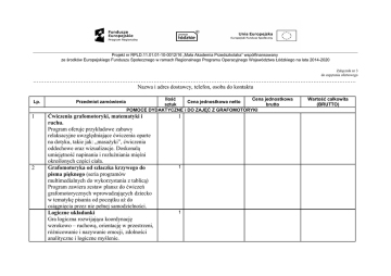 Projekt nr RPLD.11.01.01-10-0012/16 „Mała Akademia Przedszkolaka” współfinansowany ze środków Europejskiego Funduszu Społecznego w ramach Regionalnego Programu Operacyjnego Województwa Łódzkiego na lata 2014-2020 Załącznik nr 3 do zapytania ofertowego ………………………………………………………………………………………………………………………………………………………… Nazwa i adres dostawcy, telefon, osoba do kontaktu Lp. 1 2 Przedmiot zamówienia Ilość Cena jednostkowa Cena jednostkowa netto sztuk brutto POMOCE DYDAKTYCZNE i DO ZAJĘĆ Z GRAFOMOTORYKI Ćwiczenia grafomotoryki, matematyki i ruchu. Program oferuje przykładowe zabawy relaksacyjne uwzględniające ćwiczenia oparte na dotyku, takie jak: „masażyki”, ćwiczenia oddechowe oraz wizualizacje. Doskonalą umiejętność napinania i rozluźniania mięśni określonych części ciała. Grafomotoryka od szlaczka krzywego do pisma pięknego (seria programów multimedialnych do wykorzystania z tablicą) Program zawiera zestaw plansz do ćwiczeń grafomotorycznych wprowadzających dziecko w tematykę pisania od początku aż do osiągnięcia przez nie pełnej samodzielności. Logiczne układanki Gra logiczna rozwijająca koordynację wzrokowo – ruchową, orientację w przestrzeni, różnicowanie i nazywanie emocji, zdolności analityczne i logiczne myślenie. 1 1 1 Wartość całkowita (BRUTTO) Projekt nr RPLD.11.01.01-10-0012/16 „Mała Akademia Przedszkolaka” współfinansowany ze środków Europejskiego Funduszu Społecznego w ramach Regionalnego Programu Operacyjnego Województwa Łódzkiego na lata 2014-2020 Tuby Pleksi. Pomoc dydaktyczna służąca ćwiczeniu szybkości ruchów ręki, doskonaleniu precyzji i tempa pracy manualnej oraz koordynacji wzrokowo – ruchowej. Gąsienice. Zabawa rozwija koordynację wzrokowo – ruchową, sprawność manualną i szybkość ruchów ręki.. Bambusowe łyżki i kulki angażują gracza w wykonywanie wielu czynności równocześnie, dodatkowo dziecko ćwiczy prawidłowe trzymanie łyżki, a także przygotowuje rękę do nauki pisania. Obrazkowe scrabble. Gra, która rozwija logiczne myślenie, ćwiczy refleks oraz spostrzegawczość. Gra oparta jest na trzech kryteriach, kształty, rozmiary i kolory. Zadaniem dziecka jest odpowiednio dopasować wszystkie te rzeczy. • 8 obrazkowych instrukcji • woreczek na kształty • 4 podstawki • 32 różne zwierzątka • wym. klocka do scrabble 3,5 x 3,5 x 1 cm • dla 2-4 graczy Na zakupy. Zestaw edukacyjny dla dzieci w wieku przedszkolnym do nauki - co można kupić i w jakim sklepie. 4 plansze tematyczne (cukiernia, kwiaciarnia, warzywniak, sklep zoologiczny) wym. 16,5 x 16,5 cm • 40 plakietek z produktami o wym. 5,5 x 5,5 cm 1 1 1 Projekt nr RPLD.11.01.01-10-0012/16 „Mała Akademia Przedszkolaka” współfinansowany ze środków Europejskiego Funduszu Społecznego w ramach Regionalnego Programu Operacyjnego Województwa Łódzkiego na lata 2014-2020 • dla 2-4 graczy Poznajemy zawody 1. Gry dla młodszych dzieci. Każdy z graczy wybiera pionek, który reprezentuje w grze jeden z czterech zawodów: policjanta, rolnika, lekarza i kucharza. W czasie rywalizacji na torze gry, gracz musi uzbierać i ułożyć części swojej układanki. Na każdej z tych części jest obrazek przedstawiający narzędzie pracy używane w zawodzie wybranym przez gracza.. • 1 plansza o wym. 33,5 x 26,2 cm • 4 pionki • 1 kostka do gry • 4 puzzle o wym. 16 x 21,2 cm po 7 elem. • 28 kart „Los” • instrukcja Gra tęcza. Uczy najmłodsze dzieci rozpoznawać i nazywać kolory. U starszych ćwiczy pamięć. Na kolorowej planszy ukryte są kółeczka z kolorowymi przedmiotami. Dzieci zapamiętują ich położenie. Kolorowa kostka wskazuje obrazek, który trzeba odgadnąć. • tęczowa plansza do gry o wym. 34 x 34 cm • 36 kółeczek z obrazkami (po 6 obrazków w 6 kolorach) • dla 1-6 graczy Gra Kot i mysz Gra z kuleczkami. Polega na przeniesieniu 1 1 1 1 Projekt nr RPLD.11.01.01-10-0012/16 „Mała Akademia Przedszkolaka” współfinansowany ze środków Europejskiego Funduszu Społecznego w ramach Regionalnego Programu Operacyjnego Województwa Łódzkiego na lata 2014-2020 kulek w wybranym kolorze z lub do wiszącego nad platformą gniazda. Zadanie należy wykonać za pomocą drewnianej rączki. Reguły gry mogą ulegać zmianie w zależności od wieku graczy. Zabawa uczy koncentracji, zręczności i precyzji. Całość wykonana z drewna, łatwa w montażu i demontażu. • platforma o wym. 34 x 34 x 44 cm z 12 dołkami na każdym boku • po 15 kulek z otworami w 4 kolorach • od 4 do 6 lat Gra Jenga. Gra zręcznościowa, polegająca na układaniu jak najwyższej wieży, poprzez przenoszenie klocków z dołu wieży na szczyt. Gra ćwiczy koncentrację i zręczność. • 54 elem. o wym. 7,5 x 2,5 x 1,5 cm Piramidka. Gra polega na ustawieniu na płytkach jak najwyższej wieży z krążków o wylosowanych kolorach, uczy koncentracji, koordynacji wzrokowo-ruchowej oraz logicznego myślenia. W zestawie znajduje się: • 16 płytek z kolorowymi kółkami • 62 elem. o śr. 2,2 i wys. 1,2 cm w sześciu kolorach • kolorowa kostka do gry • instrukcja Mata alfabet. Na puzzlach przedstawiony jest alfabet, każdy element to inna literka. Dzięki tej piankowej zabawce, dziecko uczy się zasady 1 1 Projekt nr RPLD.11.01.01-10-0012/16 „Mała Akademia Przedszkolaka” współfinansowany ze środków Europejskiego Funduszu Społecznego w ramach Regionalnego Programu Operacyjnego Województwa Łódzkiego na lata 2014-2020 łączenia i dopasowywania do siebie puzzli, a przede wszystkim poznaje literki i może tworzyć pierwsze słowa. Literki są wyjmowane. • 26 elem. o dł. boku 32,5 cm WARTOŚĆ CAŁKOWITA - BRUTTO Oświadczamy, że zapoznaliśmy się z warunkami realizacji dostawy, a także uznajemy się za związanych określonymi w niej wymaganiami i zasadami postępo