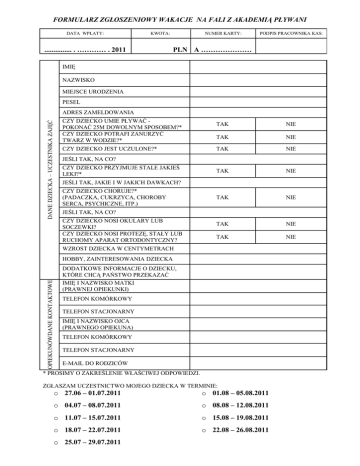 FORMULARZ ZGŁOSZENIOWY WAKACJE NA FALI Z AKADEMIĄ PŁYWANI DATA WPŁATY: KWOTA: ............... . ………… . 2011 NUMER KARTY: PODPIS PRACOWNIKA KAS: PLN A ………………… IMIĘ NAZWISKO ……………………………………………………… ……………… ……………………………………………………… ……………… MIEJSCE URODZENIA PESEL DANE DZIECKA – UCZESTNIKA ZAJĘĆ ADRES ZAMELDOWANIA CZY DZIECKO UMIE PŁYWAĆ POKONAĆ 25M DOWOLNYM SPOSOBEM?* CZY DZIECKO POTRAFI ZANURZYĆ TWARZ W WODZIE?* CZY DZIECKO JEST UCZULONE?* TAK NIE TAK NIE TAK NIE TAK NIE TAK NIE TAK NIE TAK NIE JEŚLI TAK, NA CO? CZY DZIECKO PRZYJMUJE STALE JAKIEŚ LEKI?* JEŚLI TAK, JAKIE I W JAKICH DAWKACH? CZY DZIECKO CHORUJE?* (PADACZKA, CUKRZYCA, CHOROBY SERCA, PSYCHICZNE, ITP.) JEŚLI TAK, NA CO? CZY DZIECKO NOSI OKULARY LUB SOCZEWKI? CZY DZIECKO NOSI PROTEZĘ, STAŁY LUB RUCHOMY APARAT ORTODONTYCZNY? WZROST DZIECKA W CENTYMETRACH OPIEKUNÓWDANE KONTAKTOWE HOBBY, ZAINTERESOWANIA DZIECKA DODATKOWE INFORMACJE O DZIECKU, KTÓRE CHCĄ PAŃSTWO PRZEKAZAĆ IMIĘ I NAZWISKO MATKI (PRAWNEJ OPIEKUNKI) TELEFON KOMÓRKOWY TELEFON STACJONARNY IMIĘ I NAZWISKO OJCA (PRAWNEGO OPIEKUNA) TELEFON KOMÓRKOWY TELEFON STACJONARNY E-MAIL DO RODZICÓW * PROSIMY O ZAKREŚLENIE WŁAŚCIWEJ ODPOWIEDZI. ZGŁASZAM UCZESTNICTWO MOJEGO DZIECKA W TERMINIE: o 27.06 – 01.07.2011 o 01.08 – 05.08.2011 o 04.07 – 08.07.2011 o 08.08 – 12.08.2011 o 11.07 – 15.07.2011 o 15.08 – 19.08.2011 o 18.07 – 22.07.2011 o 22.08 – 26.08.2011 o 25.07 – 29.07.2011 o INNY TERMIN ( PROSIMY WSKAZAĆ, JEŚLI DECYDUJĄ SIĘ PAŃSTWO NA UDZIAŁ NP.: W TRAKCIE CZTERECH WYBRANYCH DNI) ……………………………………………………… ZGADZAM SIĘ NA UCZESTNICTWO MOJEGO DZIECKA W ZAJĘCIACH ZORGANIZOWANYCH WE WSKAZANYM POWYŻEJ TERMINIE W GODZINACH OD 7.30 DO 17.00. ZAPOZNAŁAM/EM SIĘ Z REGULAMINEM AQUAPARKU, REGULAMINEM I PROGRAMEM PROPONOWANYCH ZAJĘĆ I AKCEPTUJĘ JE. OŚWIADCZAM, ŻE MOJE DZIECKO ODBYŁO BADANIA LEKARSKIE I STAN JEGO ZDROWIA POZWALA NA UDZIAŁ W ZAJĘCIACH Z ZAKRESU NAUKI I DOSKONALENIA PŁYWANIA. STWIERDZAM, ŻE PODAŁAM/EM, WSZYSTKIE ZNANE MI INFORMACJE O DZIECKU, KTÓRE MOGĄ POMÓC W ZAPEWNIENIU WŁAŚCIWEJ OPIEKI I BEZPIECZEŃSTWA W CZASIE UCZESTNICTWA MOJEGO DZIECKA W ZAJĘCIACH ZORGANIZOWANYCH INTENSYWNEJ NAUKI I DOSKONALENIA PŁYWANIA Z ELEMENTAMI EDUKACJI W ZAKRESIE BEZPIECZEŃSTWA, PIERWSZEJ POMOCY, NURKOWANIA I RATOWNICTWA WODNEGO. WYRAŻAM ZGODĘ NA PRZETWARZANIE MOICH DANYCH OSOBOWYCH PRZEZ AQUAPARK ŁÓDŹ SP. Z O. O. Z SIEDZIBĄ W ŁODZI, AL. UNII LUBELSKIEJ 4, 94-208 ŁÓDŹ ORAZ RATOWNICTWO WODNE SZKOŁA PŁYWANIA I SPORTÓW WODNYCH Z SIEDZIBĄ W ŁODZI UL. ROJNA 69A, 91-134 ŁÓDŹ, NIE WYŁĄCZAJĄC PRZETWARZANIA TYCH DANYCH DO CELÓW MARKETINGOWYCH. OŚWIADCZAM, ŻE PODANIE PRZEZE MNIE DANYCH JEST DOBROWOLNE I PRZYSŁUGUJE MI PRAWO WGLĄDU DO NICH ORAZ ICH POPRAWIANIE. WYRAŻAM ZGODĘ NA PUBLIKACJĘ ZDJĘĆ MOJEGO DZIECKA Z WAKACJI NA FALI Z AKADEMIĄ PŁYWANIA W MATERIAŁACH REKLAMOWYCH, PUBLIKACJACH ORAZ NA STRONACH INTERNETOWYCH ORGANIZATORÓW. ………………………………………………. PODPIS OSOBY PRZYJMUJĄCEJ OŚWIADCZENIA o ………………………………………... DATA, PODPIS RODZICA/OPIEKUNA WYRAŻAM ZGODĘ NA SAMODZIELNY POWRÓT MOJEGO DZIECKA Z ZAJĘĆ* …..…….…………………………………... DATA, PODPIS RODZICA/OPIEKUNA o UPOWAŻNIAM DO ODBIORU DZIECKA PO ZAJĘCIACH NASTĘPUJĄCE OSOBY* (IMIĘ I NAZWISKO, SERIA I NUMER DOWODU OSOBISTEGO): 1. …………………………………………………………………………………………………………….. 2. …………………………………………………………………………………………………………….. 3. …………………………………………………………………………………………………………….. ………………………………..……………. PODPIS OSOBY PRZYJMUJĄCEJ OŚWIADCZENIE RODZICA/OPIEKUNA …..…….…………………………………... DATA, PODPIS ………………………………………... DATA, PODPIS INSTRUKTORA * PROSIMY O PODPISANIE LUB SKREŚLENIE DANEGO PUNKTU.