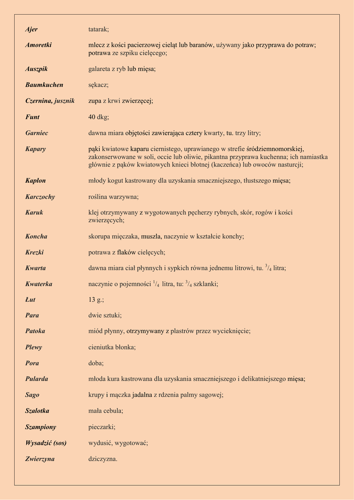 Ajer tatarak; Amoretki mlecz z kości pacierzowej cieląt lub baranów, używany jako przyprawa do potraw; potrawa ze szpiku cielęcego; Auszpik galareta z ryb lub mięsa; Baumkuchen sękacz; Czernina, jusznik zupa z krwi zwierzęcej; Funt 40 dkg; Garniec dawna miara objętości zawierająca cztery kwarty, tu. trzy litry; Kapary pąki kwiatowe kaparu ciernistego, uprawianego w strefie śródziemnomorskiej, zakonserwowane w soli, occie lub oliwie, pikantna przyprawa kuchenna; ich namiastka głównie z pąków kwiatowych knieci błotnej (kaczeńca) lub owoców nasturcji; Kapłon młody kogut kastrowany dla uzyskania smaczniejszego, tłustszego mięsa; Karczochy roślina warzywna; Karuk klej otrzymywany z wygotowanych pęcherzy rybnych, skór, rogów i kości zwierzęcych; Koncha skorupa mięczaka, muszla, naczynie w kształcie konchy; Krezki potrawa z flaków cielęcych; Kwarta dawna miara ciał płynnych i sypkich równa jednemu litrowi, tu. 3/4 litra; Kwaterka naczynie o pojemności 1/4 litra, tu: 3/4 szklanki; Łut 13 g.; Para dwie sztuki; Patoka miód płynny, otrzymywany z plastrów przez wycieknięcie; Plewy cieniutka błonka; Pora doba; Pularda młoda kura kastrowana dla uzyskania smaczniejszego i delikatniejszego mięsa; Sago krupy i mączka jadalna z rdzenia palmy sagowej; Szalotka mała cebula; Szampiony pieczarki; Wysadzić (sos) wydusić, wygotować; Zwierzyna dziczyzna.