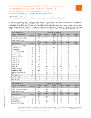 Cennik telefonów w ofertach Zetafon i Zetafon z miesięcznym zobowiązaniem w taryfach Orange One, Orange POP, Nowe Orange Go oraz Orange Free na kartę obowiązuje od 7 września 2012 r. do odwołania lub wyczerpania zapasów wszystkie ceny w zł z VAT Telefony posiadają blokadę SIM-lock umożliwiającą pracę telefonu jedynie z kartami SIM w sieci Orange w Polsce. Do poniższych telefonów należy dokupić dowolny starter w ofercie Zetafon lub Zetafon z miesięcznym zobowiązaniem w jednej z taryf: Orange One, Orange POP, Nowe OrangeGo lub Orange Free na kartę. Cena telefonu uzależniona jest od czasu trwania umowy oraz wybranej oferty. Ceny w kolumnie „Zetafon” dotyczą oferty Zetafon. Ceny w kolumnie „Zetafon 25”, „Zetafon 30”, „Zetafon 35”, „Zetafon 40”, „Zetafon 45” i „Zetafon 50” dotyczą oferty Zetafon z miesięcznym zobowiązaniem z miesięcznymi kwotami zobowiązania odpowiednio 25, 30, 35, 40, 45 i 50 zł. karty na zakupy od Orange (nie podlegają VAT) Zetafon Zetafon 25 Zetafon 30 Zetafon 35 Zetafon 40 Zetafon 45 Zetafon 50 Karta - Media Markt 250zł - 129 79 69 39 3 3 Karta - Saturn 250zł - 129 79 69 39 3 3 Zetafon Zetafon 25 Zetafon 30 Zetafon 35 Zetafon 40 Zetafon 45 Zetafon 50 - 189 49 3 3 3 1 LG T385 Wi-Fi 119 69 49 29 3 3 1 LG EGO T500 119 19 3 3 3 3 3 Maxcom MM460BB 139 19 3 3 3 3 1 Motorola Gleam 159 3 3 3 3 3 1 Motorola GLEAM+ 159 59 3 3 3 3 1 3 3 3 3 3 3 1 Nokia C2-05 119 69 9 3 3 3 1 Nokia C1-01 159 3 3 3 3 3 1 Nokia C2-01 Model telefonu Alcatel one touch 908F Nokia 100 159 69 19 3 3 3 1 Nokia 500 - 599 549 499 449 199 129 Samsung C3050 3 3 3 3 3 3 1 Samsung C3530 119 69 3 3 3 3 1 Samsung S3350 Ch@t 335 199 149 139 129 119 3 3 Sony Ericsson txt 219 39 3 3 3 3 1 Huawei E173 3 3 3 3 3 3 1 ZTE MF192 3 3 3 3 3 3 1 karty na zakupy od Orange (nie podlegają VAT) PREP/PDF06/0912, Strona 1 z 2 , Strona 1 z 2 umowa na 36 miesięcy umowa na 30 miesięcy Zetafon Zetafon 25 Zetafon 30 Zetafon 35 Zetafon 40 Zetafon 45 Zetafon 50 Karta - Media Markt 250zł - 149 129 119 109 69 3 Karta - Saturn 250zł - 149 129 119 109 69 3 Zetafon Zetafon 25 Zetafon 30 Zetafon 35 Zetafon 40 Zetafon 45 Zetafon 50 - 239 229 219 3 3 3 LG T385 Wi-Fi 149 119 99 89 79 69 49 LG EGO T500 179 139 129 119 109 3 3 Maxcom MM460BB 149 79 59 3 3 3 3 Model telefonu Alcatel one touch 908F Polska Telefonia Komórkowa – Centertel Spółka z o.o. z siedzibą w Warszawie, adres: 01-230 Warszawa ul. Skierniewicka 10 a, zarejestrowana w Sądzie Rejonowym dla m. st. Warszawy XII Wydział Gospodarczy – Krajowego Rejestru Sądowego pod numerem KRS 0000006107, o kapitale zakładowym 2.690.501.964,00 PLN, (NIP 527-020-68-72) Motorola Gleam 229 139 3 3 3 3 1 Motorola GLEAM+ 229 139 99 49 3 3 1 Nokia 100 3 3 3 3 3 3 1 Nokia C2-05 129 89 29 3 3 3 3 Nokia C1-01 189 139 19 3 3 3 3 Nokia C2-01 259 169 159 149 69 3 3 - 629 599 549 499 229 159 Nokia 500 Samsung C3050 179 3 3 3 3 3 3 Samsung C3530 219 169 3 3 3 3 3 Samsung S3350 Ch@t 335 279 189 179 169 159 3 3 Sony Ericsson txt 259 159 149 139 3 3 1 Huawei E173 49 19 3 3 3 3 3 ZTE MF192 49 19 3 3 3 3 3 Zetafon Zetafon 25 Zetafon 30 Zetafon 35 Zetafon 40 Zetafon 45 Zetafon 50 Karta - Media Markt 250zł - 199 149 139 129 99 49 Karta - Saturn 250zł - 199 149 139 129 99 49 Zetafon Zetafon 25 Zetafon 30 Zetafon 35 Zetafon 40 Zetafon 45 Zetafon 50 - 289 99 3 3 3 3 LG T385 Wi-Fi 189 169 149 139 129 119 99 LG EGO T500 219 189 179 169 159 3 3 Maxcom MM460BB 159 119 79 3 3 3 3 Motorola Gleam 329 239 3 3 3 3 3 Motorola GLEAM+ 329 239 139 99 49 3 3 karty na zakupy od Orange (nie podlegają VAT) Model telefonu Alcatel one touch 908F Nokia 100 3 3 3 3 3 3 3 Nokia C2-05 159 139 99 49 3 3 3 Nokia C1-01 239 199 49 3 3 3 3 Nokia C2-01 279 249 239 229 99 3 3 - 699 629 599 559 249 199 Nokia 500 PREP/PDF06/0912, Strona 2 z 2 , Strona 2 z 2 umowa na 24 miesiące Samsung C3050 209 3 3 3 3 3 3 Samsung C3530 329 209 109 89 3 3 3 Samsung S3350 Ch@t 335 319 239 229 219 209 3 3 Sony Ericsson txt 349 259 249 239 229 3 1 Huawei E173 99 59 49 39 29 19 3 ZTE MF192 99 59 49 39 29 19 3 Szczegółowe warunki oferty Zetafon oraz cenniki powyższych ofert dostępne są na stronach www.orange.pl Polska Telefonia Komórkowa Centertel Spółka z o.o. z siedzibą w Warszawie, adres: 01-230 Warszawa ul. Skierniewicka 10 a, zarejestrowana w Sądzie Rejonowym dla m. st. Warszawy XII Wydział Gospodarczy – Krajowego Rejestru Sądowego pod numerem KRS 0000006107, o kapitale zakładowym 2.690.501.964,00 PLN, (NIP 527-020-68-72)