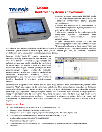 TMC600 Kontroler Systemu znakowania Kontroler systemu znakowania TMC600 działa pod kontrolą oprogramowania Merlin®Touch PS i zapewnia użytkownikowi obsługę poprzez ekran dotykowy. Kontroler jest wyposażony w zintegrowany 10 calowy ekran dotykowy o wysokiej rozdzielczości ulokowany u góry panelu. Z tyłu panelu znajdują się złącza elektryczne do podłączenia systemu znakowania oraz opcjonalnie bezprzewodowe złącza wejścia/wyjścia. W pełni funkcjonalne, oparte na platformie Windows oprogramowanie Telesis Merlin®Touch PS jest preinstalowane w kontrolerze TMC. Jest to graficzny interfejs umożliwiający szybkie i proste zaprojektowanie wzoru i znakowanie detalu. Interfejs WYSIWYG (what-you-see-is-what-you-get, czyli „to co widzisz jest tym, co uzyskasz”) zapewnia wyskalowany obraz wzoru, który zostanie uzyskany na detalu. Program Merlin®Touch PS zawiera narzędzia do tworzenia i edycji plików wzorów znakowania Każdy wzór może zawierad jedno lub więcej pól; każde pole definiuje pojedynczy obiekt. Obiekty do naniesienia na detal mogą się składad z dowolnej kombinacji łaocuchów tekstowych, tekstów pisanych po łuku, geometrycznych ciągów tekstowych, kształtów geometrycznych, grafik oraz z symboli możliwych do odczytania maszynowo. Wystarczy „kliknąd i przeciągnąd” w celu łatwego dopasowania wielkości, kształtu, lokalizacji i orientacji projektowanego obiektu. Pola tekstowe przygotowane do naniesienia na detal mogą zawierad znaki alfanumeryczne, symbole oraz specjalne “flagi” odwołujące się do zmiennych globalnych. Flagi automatycznie importują do łaocucha tekstowego dane takie jak: numer seryjny, czas, data oraz kody zdefiniowane przez użytkownika. Osobne pola mogą byd grupowane i zapisywane jako bloki w celu utworzenia logo. Również istniejące pliki DXF mogą byd zaimportowane do znakowania. Pola, które nie są nanoszone na detal mogą byd utworzone w celu czytelnego przedstawienia graficznej reprezentacji znakowanego detalu. Polecenia mogą byd zdefiniowane do wykonywania określonych zadao podczas cyklu znakowania (np. Pauza, Idź do, Wejście, Wyjście). Dane Kontrolera: Funkcjonalne oprogramowanie oparte na systemie Windows® 8.1 10 calowy ekran dotykowy o wysokiej rozdzielczości Zintegrowane osobne złącza wejścia/wyjścia izolowane typu TTL - VGA oraz 4 porty USB Dobra współpraca sieciowa poprzez port Ethernet dla komunikacji TCP/IP Możliwośd komunikacji EtherNet/IP oraz PROFINET Wsparcie kodów 2D, QR oraz GS1 Dodatkowa kontrola osi (obrotowej, osi Z, stanów liniowych) poprzez opcjonalny, zintegrowany panel sterowania.